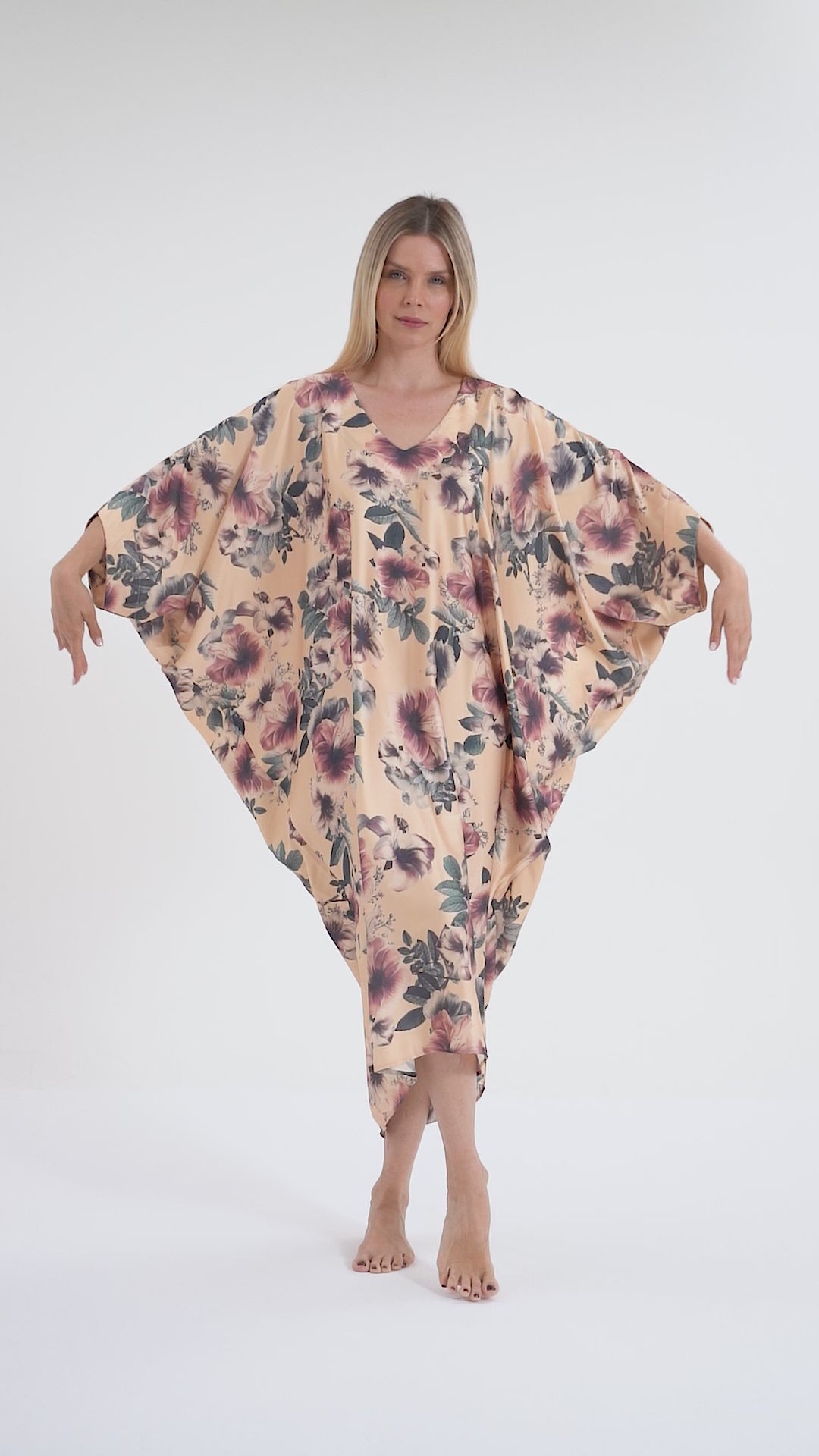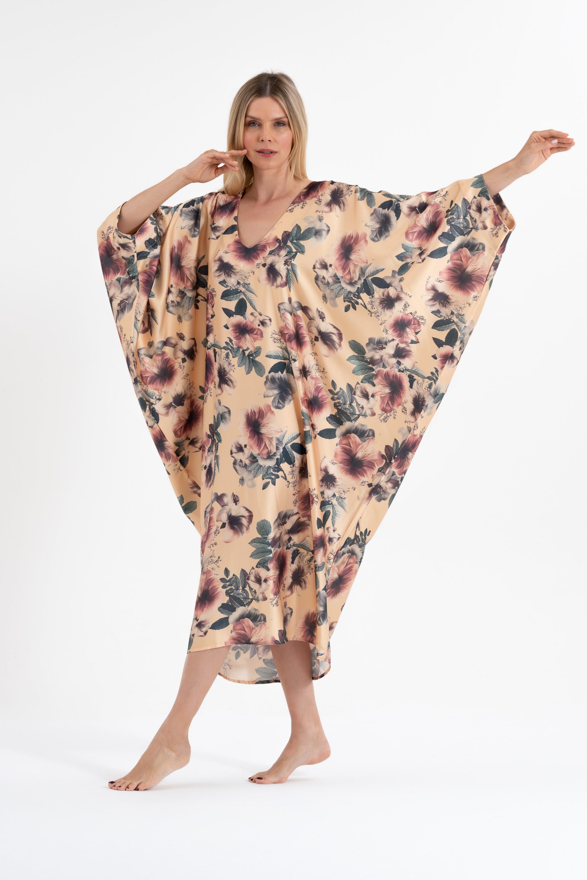 This luxurious Isabela Amie Paris silky kaftan features timeless oriental craftsmanship and design. It depicts a rich opulent hibiscus flower against a vintage gold light reflecting silk satin providing a rich touch of feminine elegance. Reminiscent of ancient Arabian culture, the hibiscus signifies feminine beauty and youthfulness. This relaxed fit kaftan gracefully drapes a sensual silhouette with movement, giving a perfect amount of glamour for any occasion.