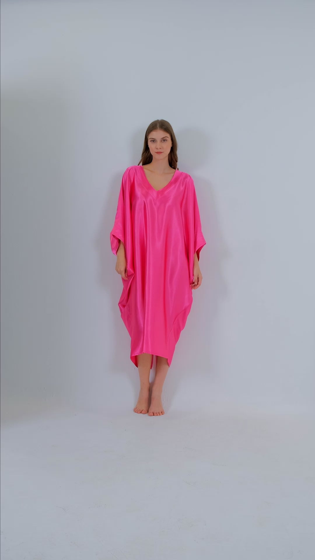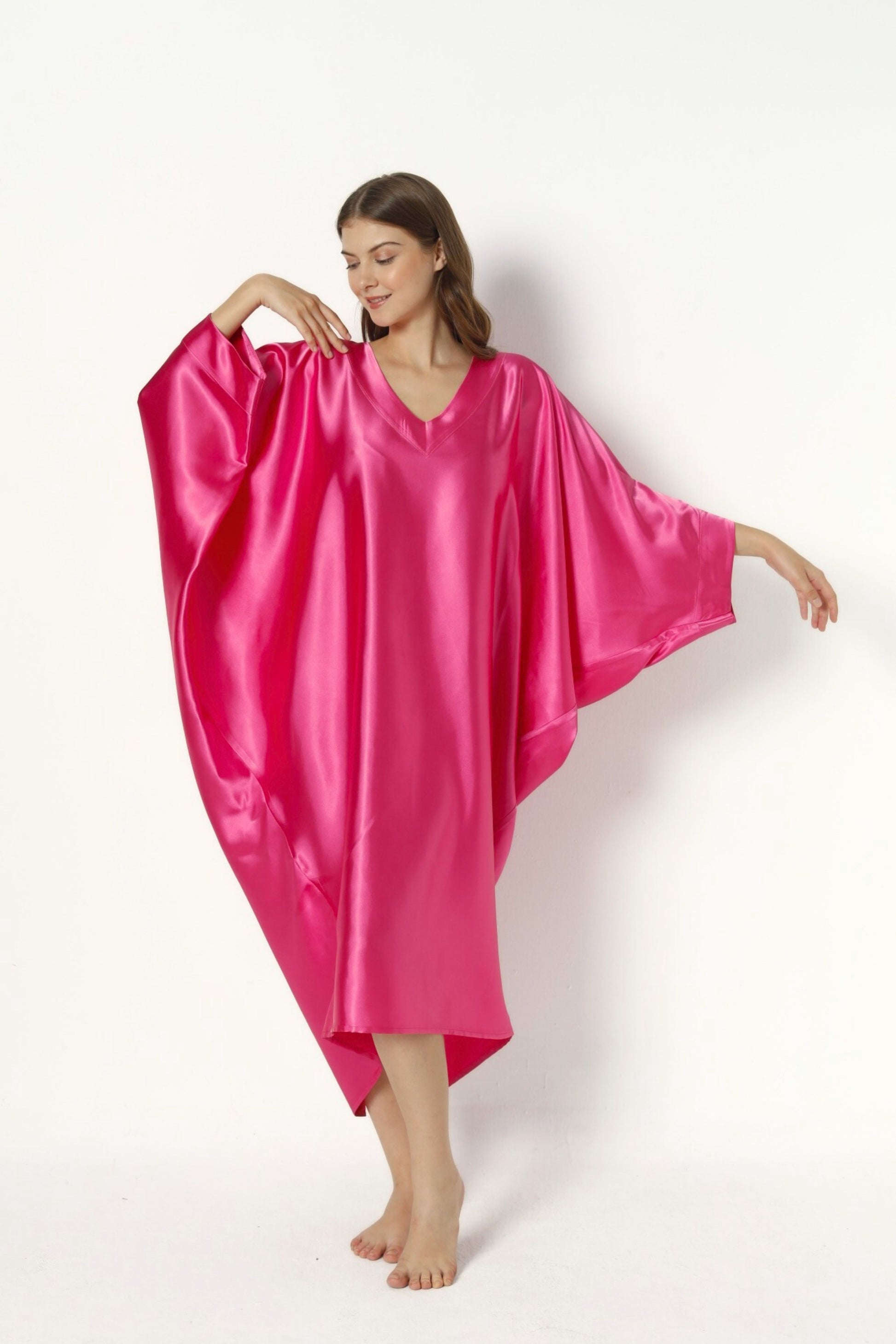 You need this undeniably feminine, Iconic, bold, playful pink silky soft kaftan in your collection. This pink aesthetic is somewhere between pink and magenta approaching fuchsia and symbolizes the empowerment of women. The barbiecore viral fashion trend has been adopted by trending celebrities and has led to the creation of barbies of different heights, sizes and skin tones. This silk satin is renowned as the first choice for any gown as it is remarkably smooth and glossy and forms beautifully around your curves. This kaftan can be worn in any context as it is lightweight, cool and generally wrinkle-free. You can style it lime green, silver, light denim, navy blue, white and similar pink shades.