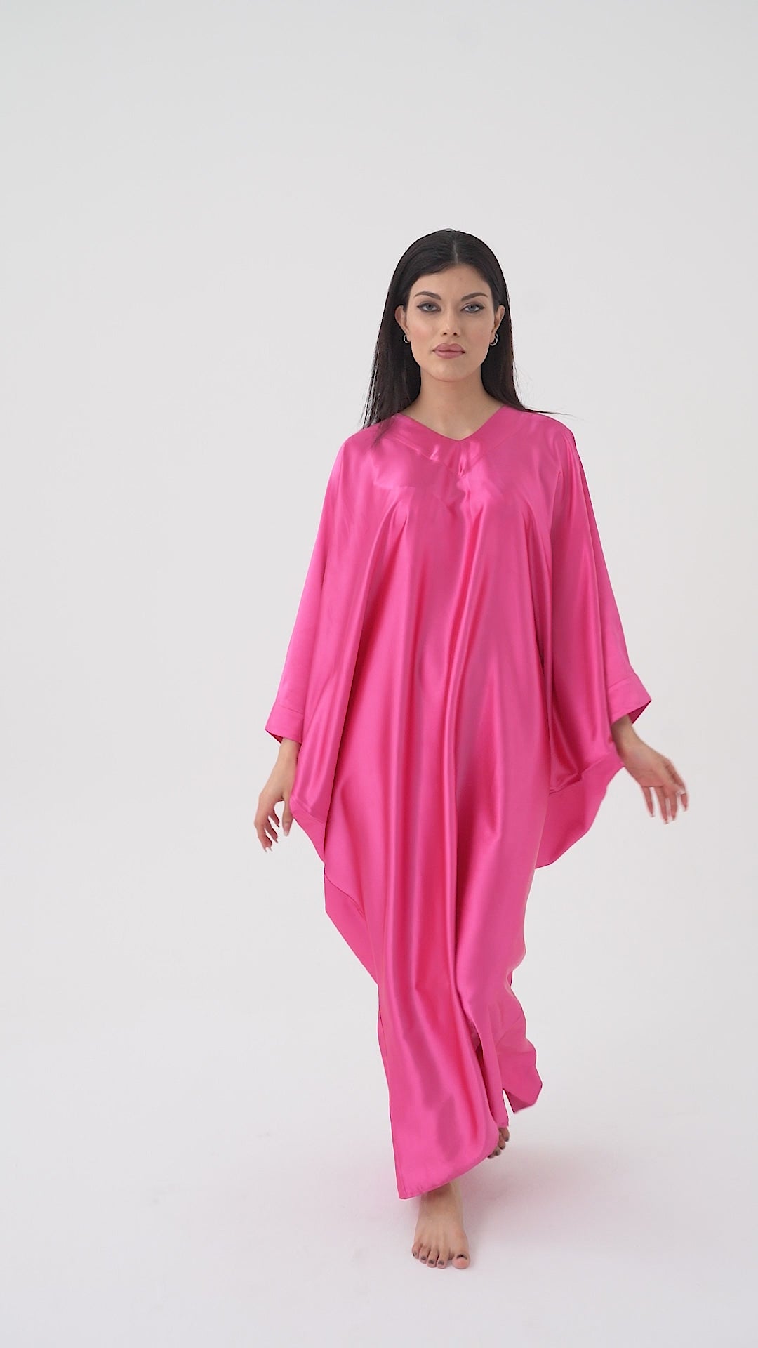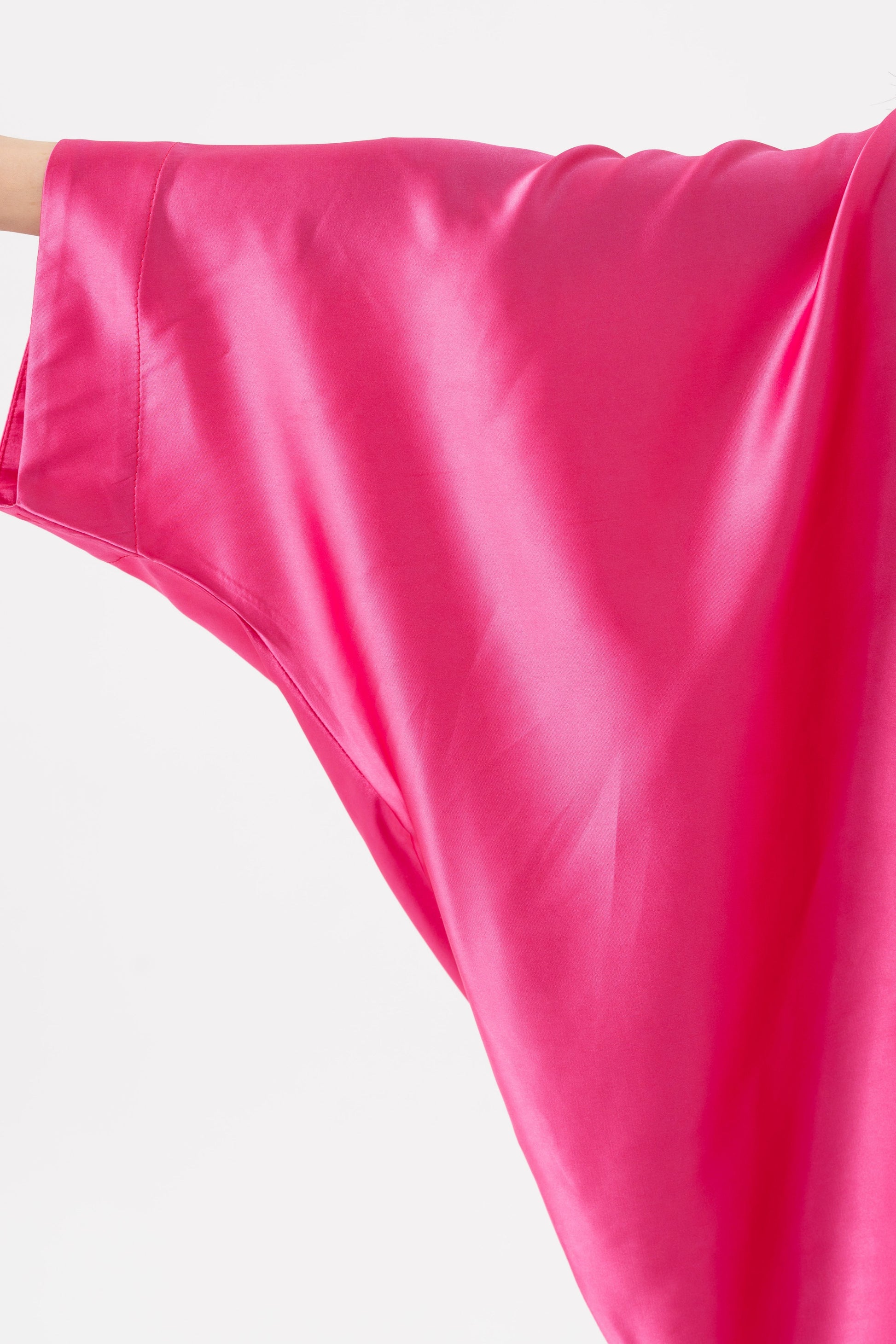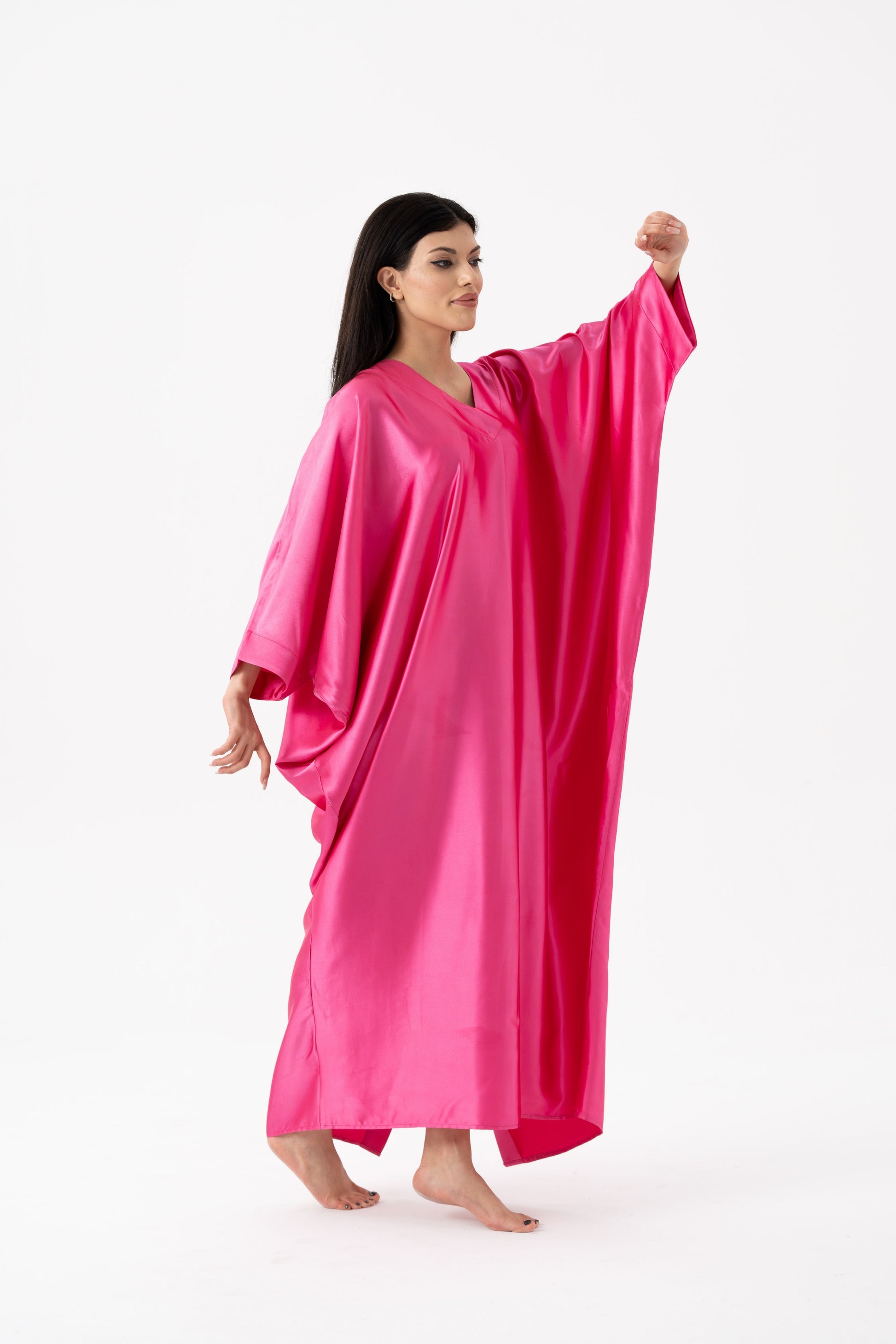 Embrace the beauty of modest fashion with the Isabela Amie Paris Modest Barbie Bubblegum Pink Kaftan. You need this undeniably feminine, Iconic, bold, playful pink silky soft kaftan in your collection. This pink aesthetic is somewhere between pink and magenta approaching fuchsia and symbolizes the empowerment of women. The barbiecore viral fashion trend has been adopted by trending celebrities and has led to the creation of barbies of different heights, sizes and skin tones. This silk satin is renowned as the first choice for any gown as it is remarkably smooth and glossy and forms beautifully around your curves. This kaftan can be worn in any context as it is lightweight, cool and generally wrinkle-free. You can style it lime green, silver, light denim, navy blue, white and similar pink shades.