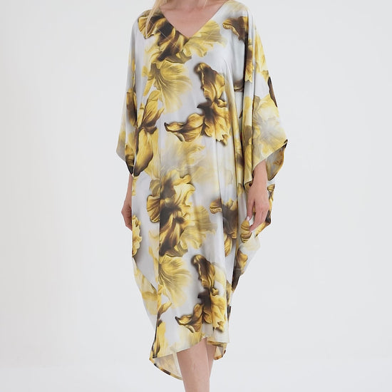 Invoke Italian grandeur and a dramatic flair to your wardrobe with this ornate silk satin kaftan featuring the textured and vivid colors that flourished in the western Baroque era. This style represents the creative innovation in European design during the 17th and 18th centuries. This kaftan is ready to wear at a luxury resort or any other travel destination such as a historical cathedral. This lustrous silk stain embodies a rich buttery touch and a masterful fuller bunce and drape detail stemming from the satin weaving technique.