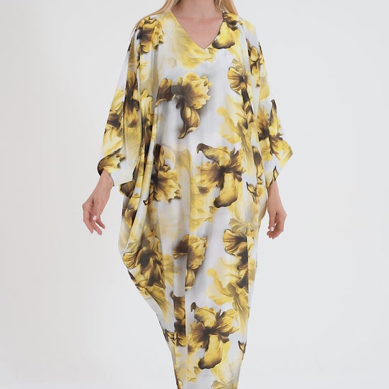 Embrace the grandeur of Italian elegance with this Baroque Bouquet Modest kaftan, tailored for those who cherish modesty without sacrificing style. Crafted from luxurious silk satin in a pristine white, adorned with golden and yellow Baroque patterns, this garment reflects the rich textures and opulence of the 17th and 18th centuries. Designed to cover the ankles with a less pronounced neckline, it offers a blend of historical charm and contemporary grace, perfect for any elegant outing from luxury resorts to historical sites.