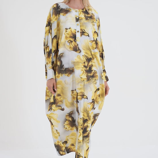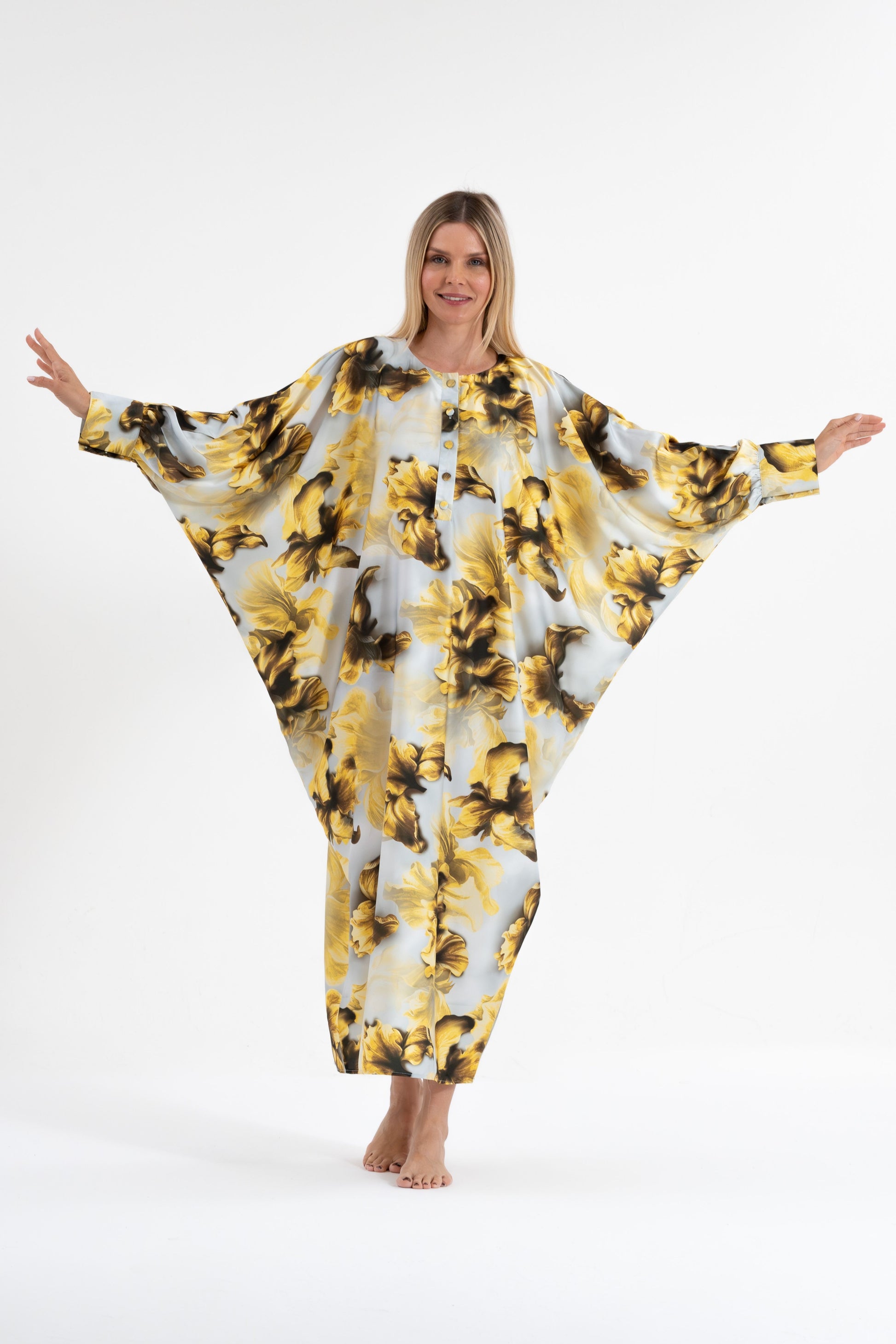 Celebrate your faith and fashion with the Baroque Bouquet Traditional kaftan. This exquisite piece offers full coverage without compromising on style, crafted from luxurious silk satin adorned with yellow and gold Baroque patterns on a white backdrop. Designed with the elegance and modesty required by Muslim and conservative fashion standards, it features sleeves detailed with buttons to maintain coverage of the wrists. This kaftan is perfect for the woman who values both her cultural identity and desire for sophistication.