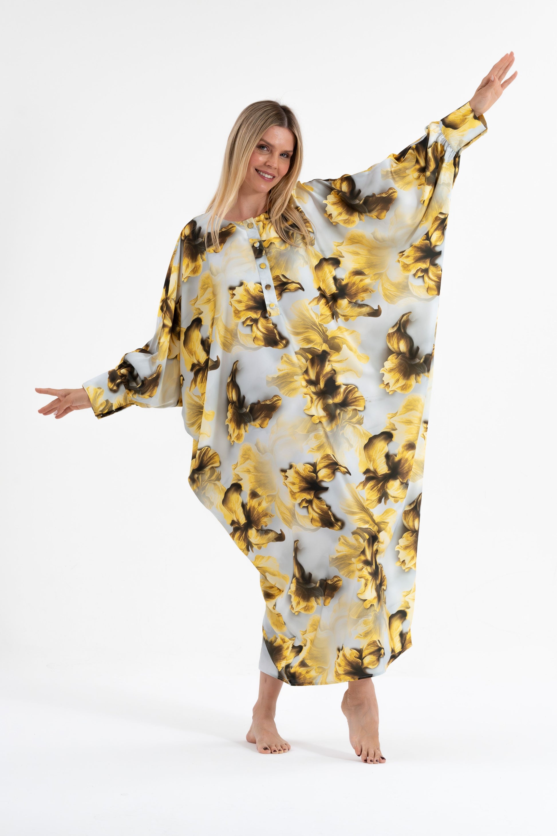 Celebrate your faith and fashion with the Baroque Bouquet Traditional kaftan. This exquisite piece offers full coverage without compromising on style, crafted from luxurious silk satin adorned with yellow and gold Baroque patterns on a white backdrop. Designed with the elegance and modesty required by Muslim and conservative fashion standards, it features sleeves detailed with buttons to maintain coverage of the wrists. This kaftan is perfect for the woman who values both her cultural identity and desire for sophistication.