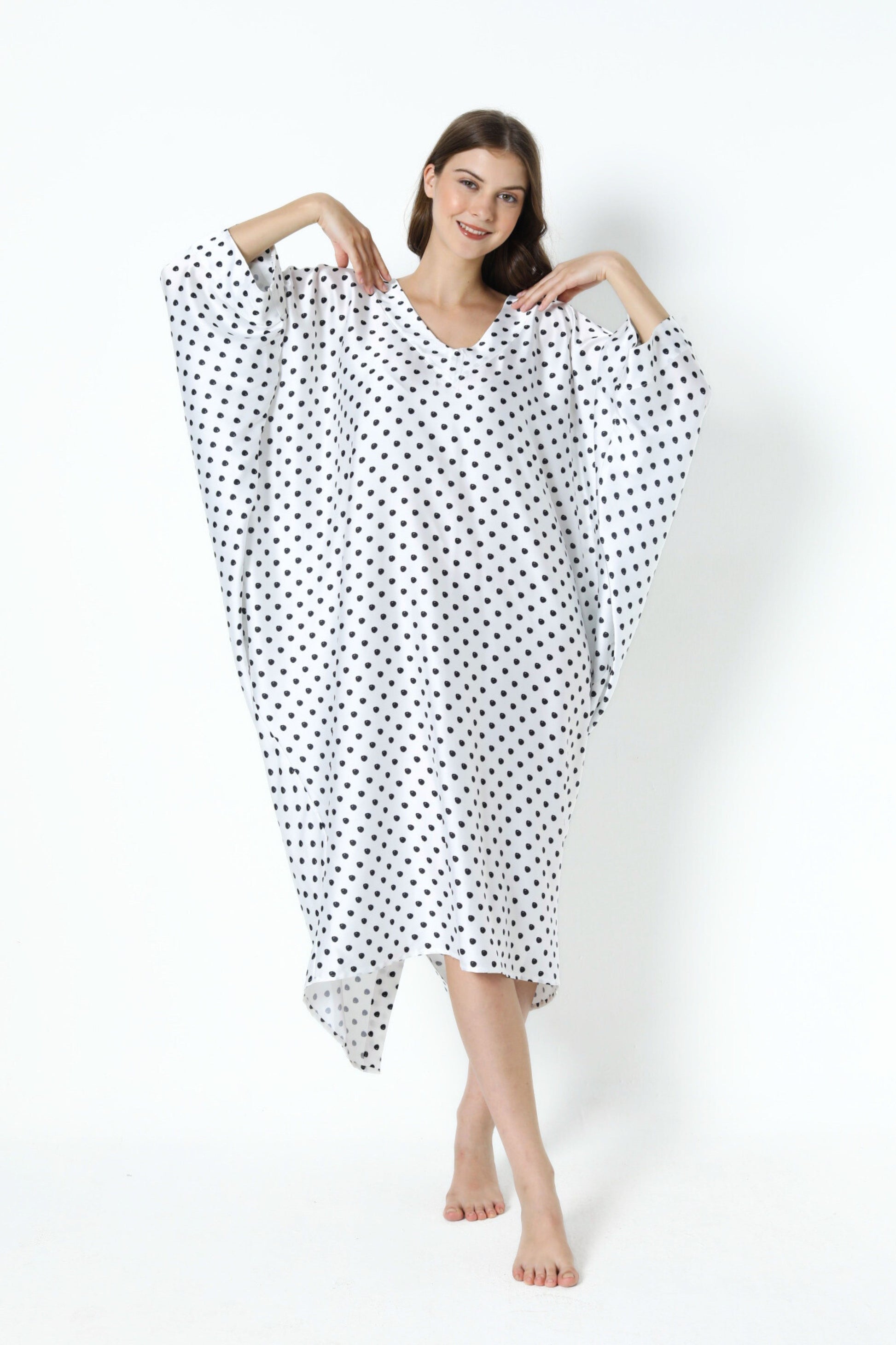 A fashion staple, the polka dot silk satin kaftan is incredibly chic and resemblance of balance between playfulness and sophistication. On a deeper level, this polka dotted kaftan signifies general connection and cohesion subject to interpretation. Dotted patterns began to surface during the Middle Ages and flourished in high fashion in the 1950’s notably worn by Marylin Monroe and Elizabeth Taylor. The silky satin gives gorgeous draping silhouette while making you look slender. You can easily style it with bright primary colors such as green, blue, pink and red.