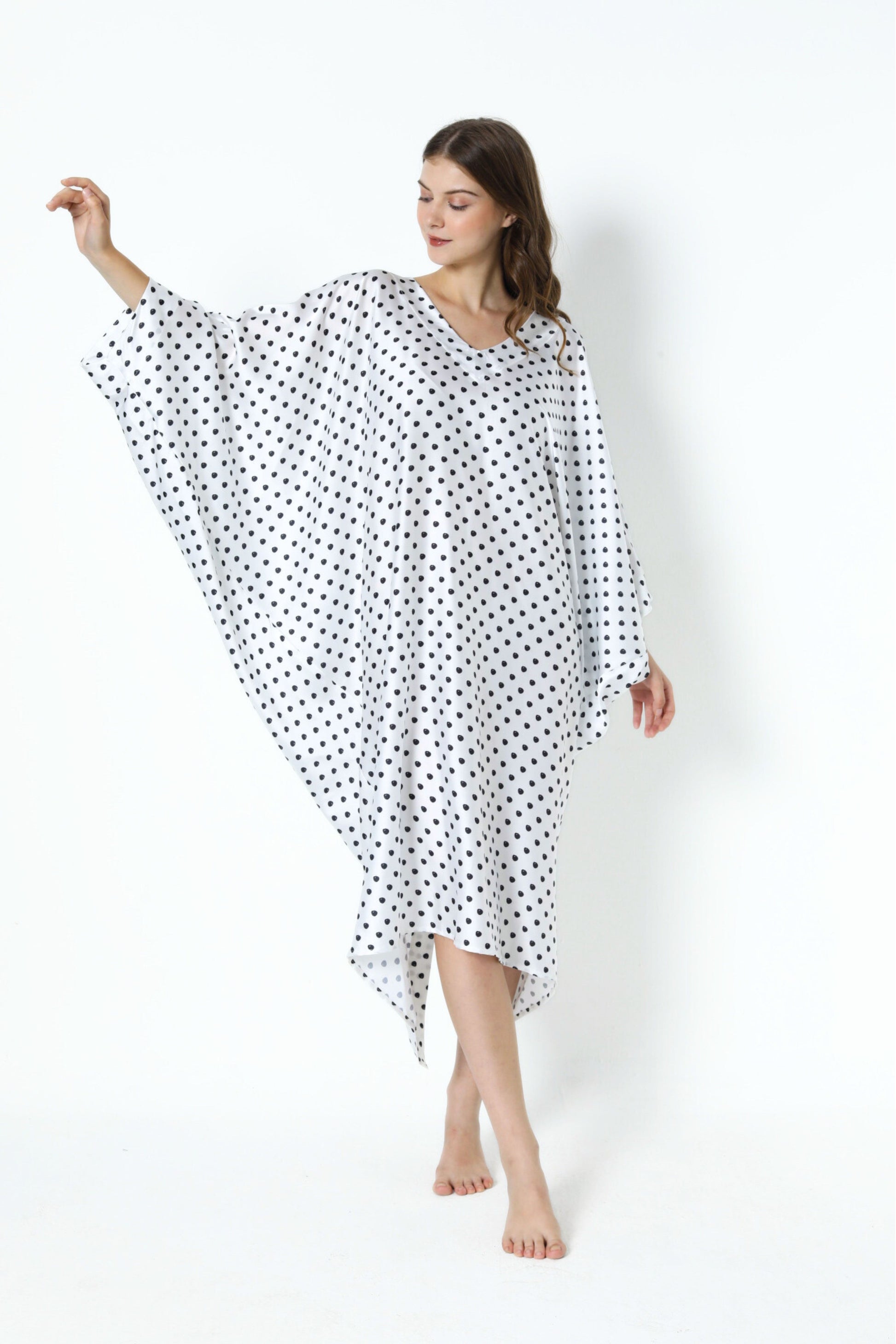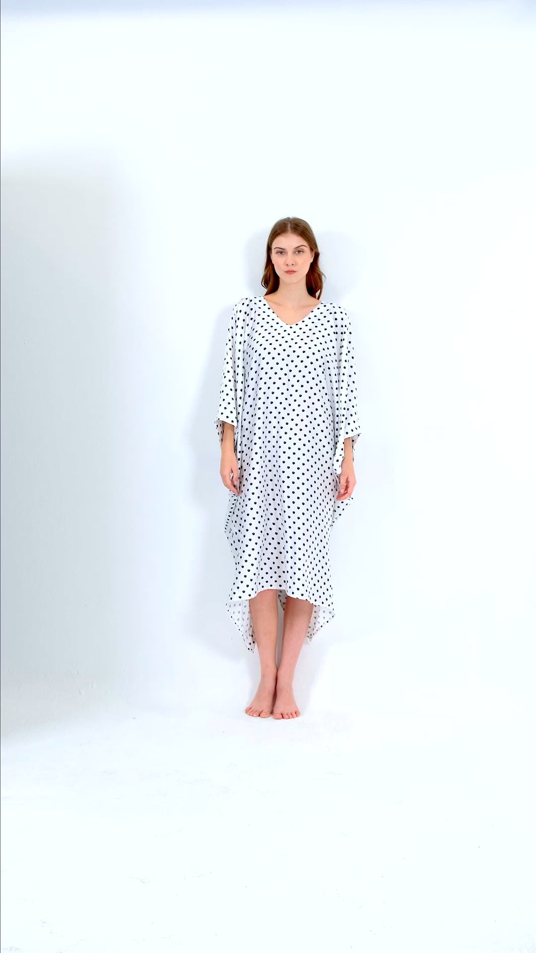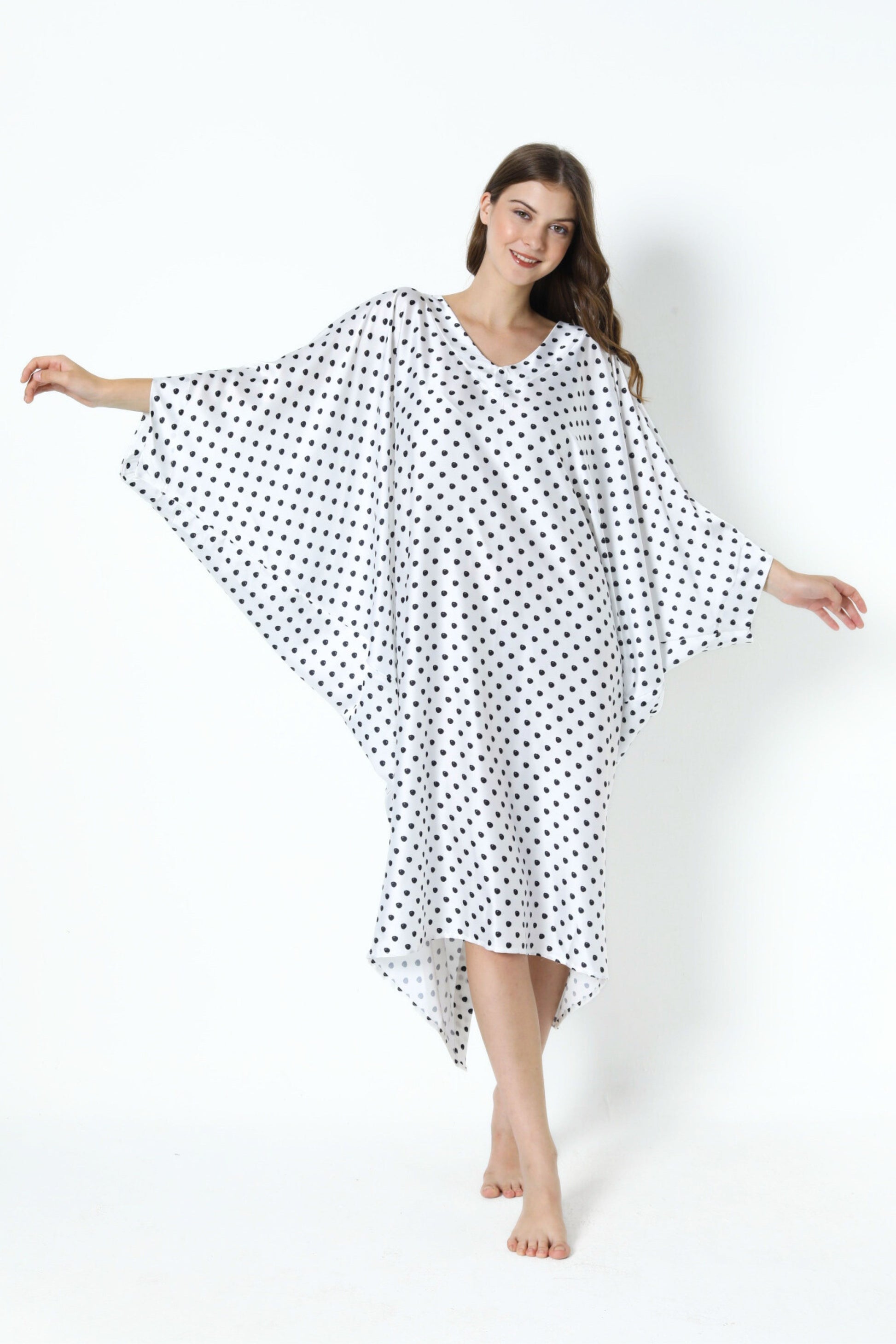 A fashion staple, the polka dot silk satin kaftan is incredibly chic and resemblance of balance between playfulness and sophistication. On a deeper level, this polka dotted kaftan signifies general connection and cohesion subject to interpretation. Dotted patterns began to surface during the Middle Ages and flourished in high fashion in the 1950’s notably worn by Marylin Monroe and Elizabeth Taylor. The silky satin gives gorgeous draping silhouette while making you look slender. You can easily style it with bright primary colors such as green, blue, pink and red.