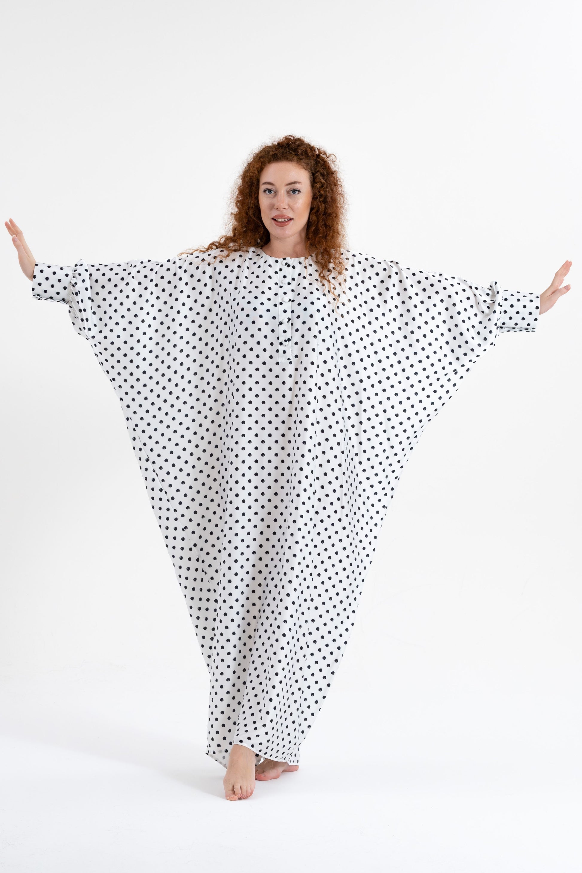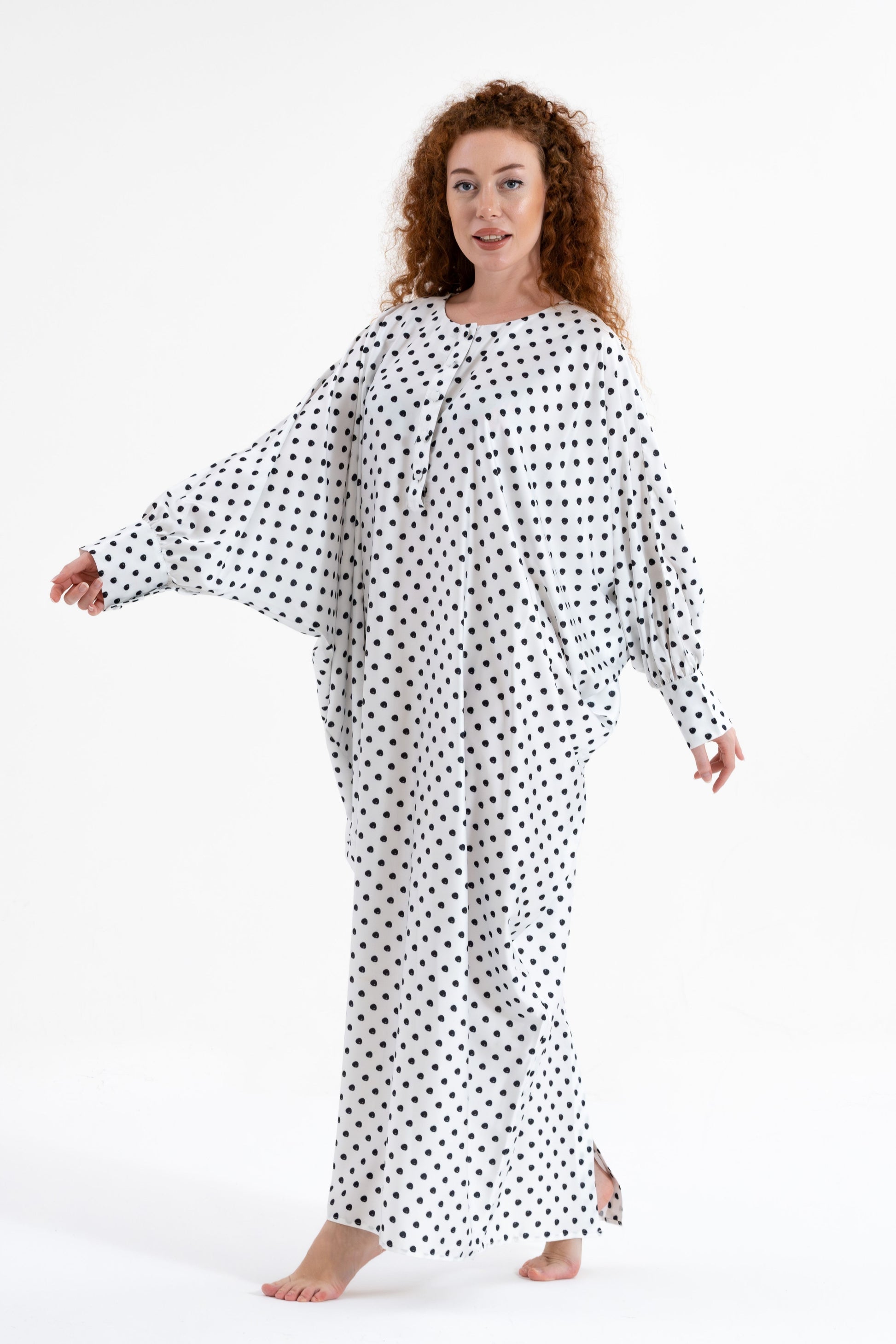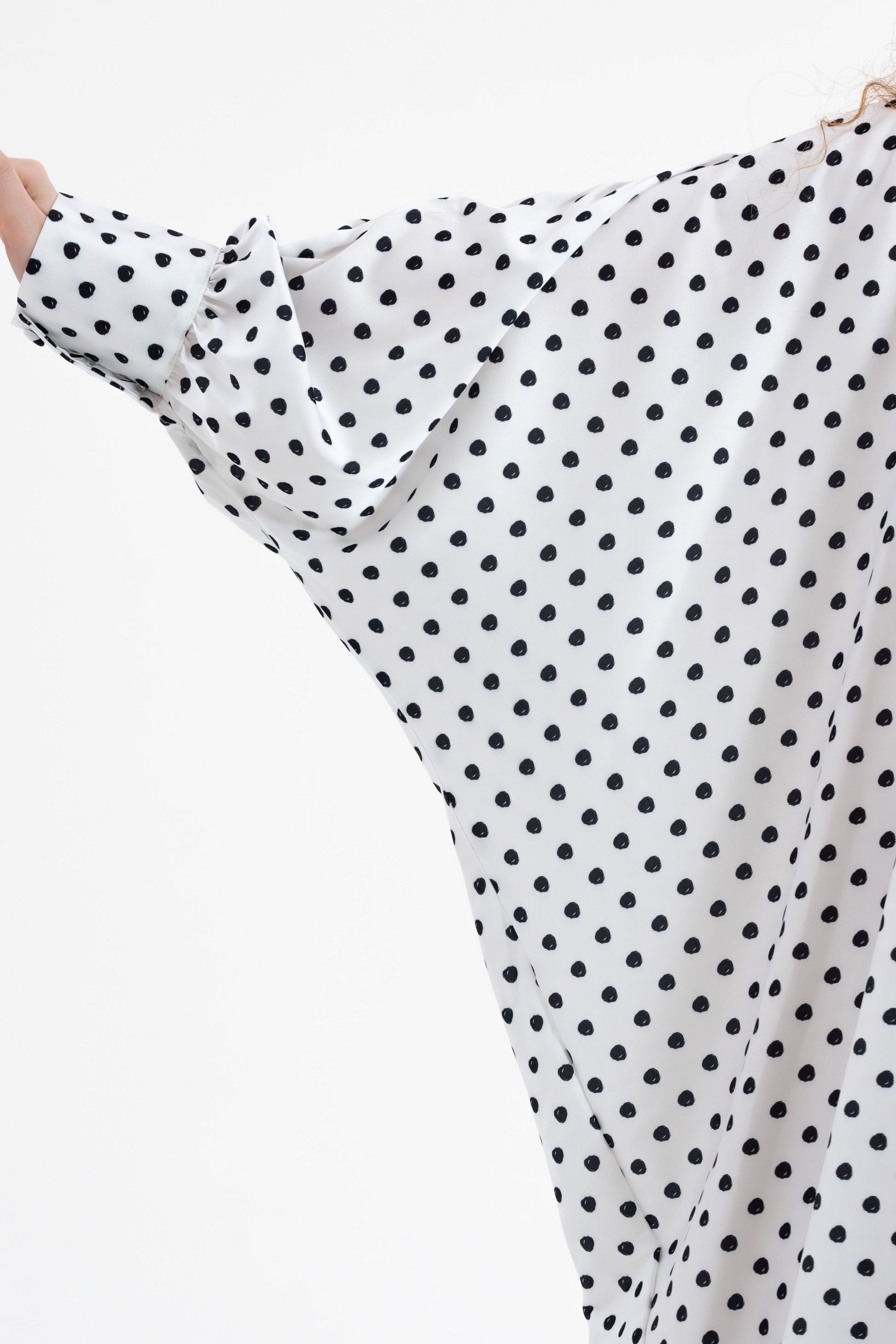 Introducing the Classic Polka-Dots Traditional Kaftan: a testament to both cultural heritage and contemporary fashion. This full-coverage kaftan blends the iconic polka dot pattern with the principles of traditional modesty. Originating in the Middle Ages and celebrated in the 1950s by luminaries such as Marilyn Monroe, this design symbolizes unity and sophistication. The silk satin fabric ensures a luxurious feel and perfect drape, complemented by buttoned sleeves that secure the wrists. It’s an ideal choice for the modern woman who values modesty and historical fashion alike.