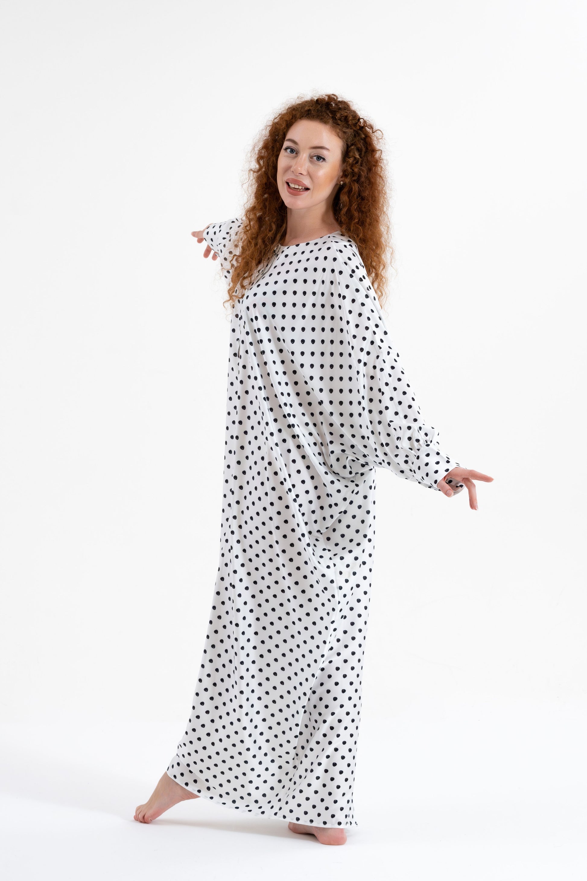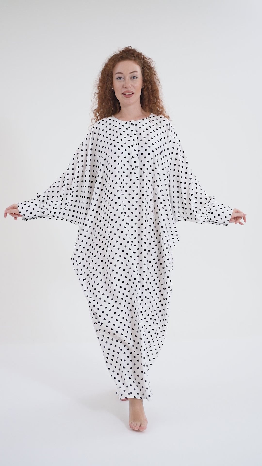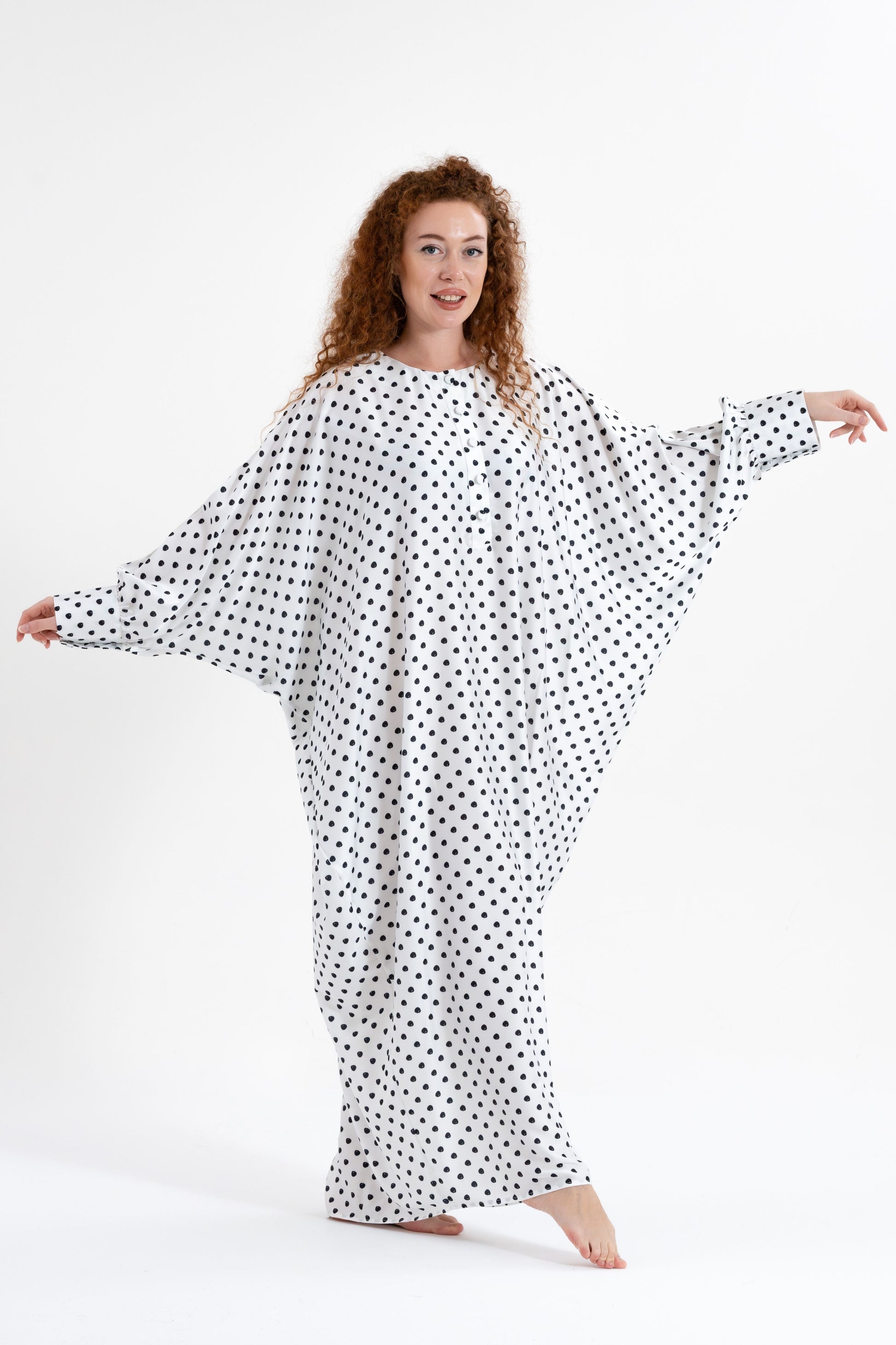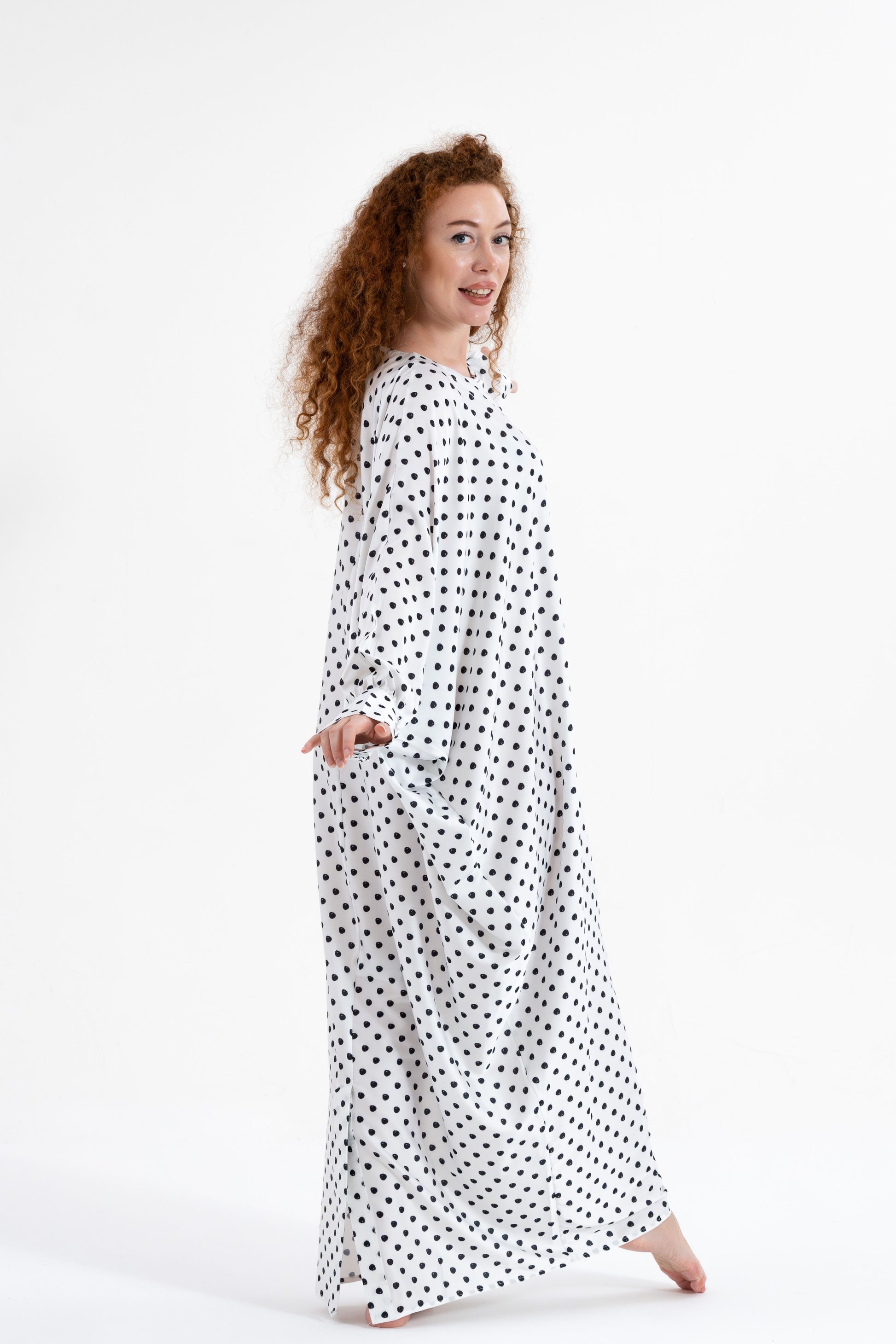 Introducing the Classic Polka-Dots Traditional Kaftan: a testament to both cultural heritage and contemporary fashion. This full-coverage kaftan blends the iconic polka dot pattern with the principles of traditional modesty. Originating in the Middle Ages and celebrated in the 1950s by luminaries such as Marilyn Monroe, this design symbolizes unity and sophistication. The silk satin fabric ensures a luxurious feel and perfect drape, complemented by buttoned sleeves that secure the wrists. It’s an ideal choice for the modern woman who values modesty and historical fashion alike.