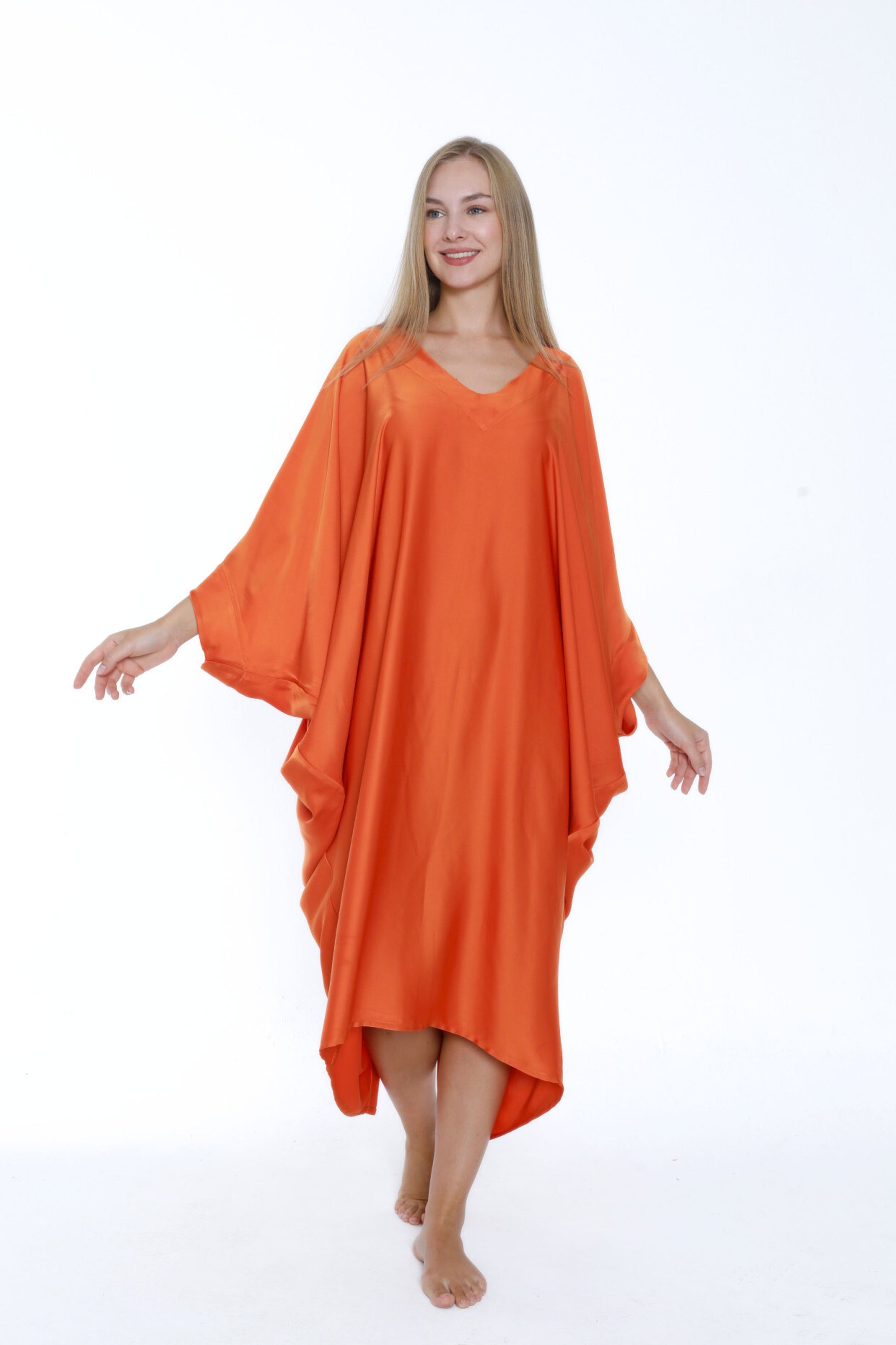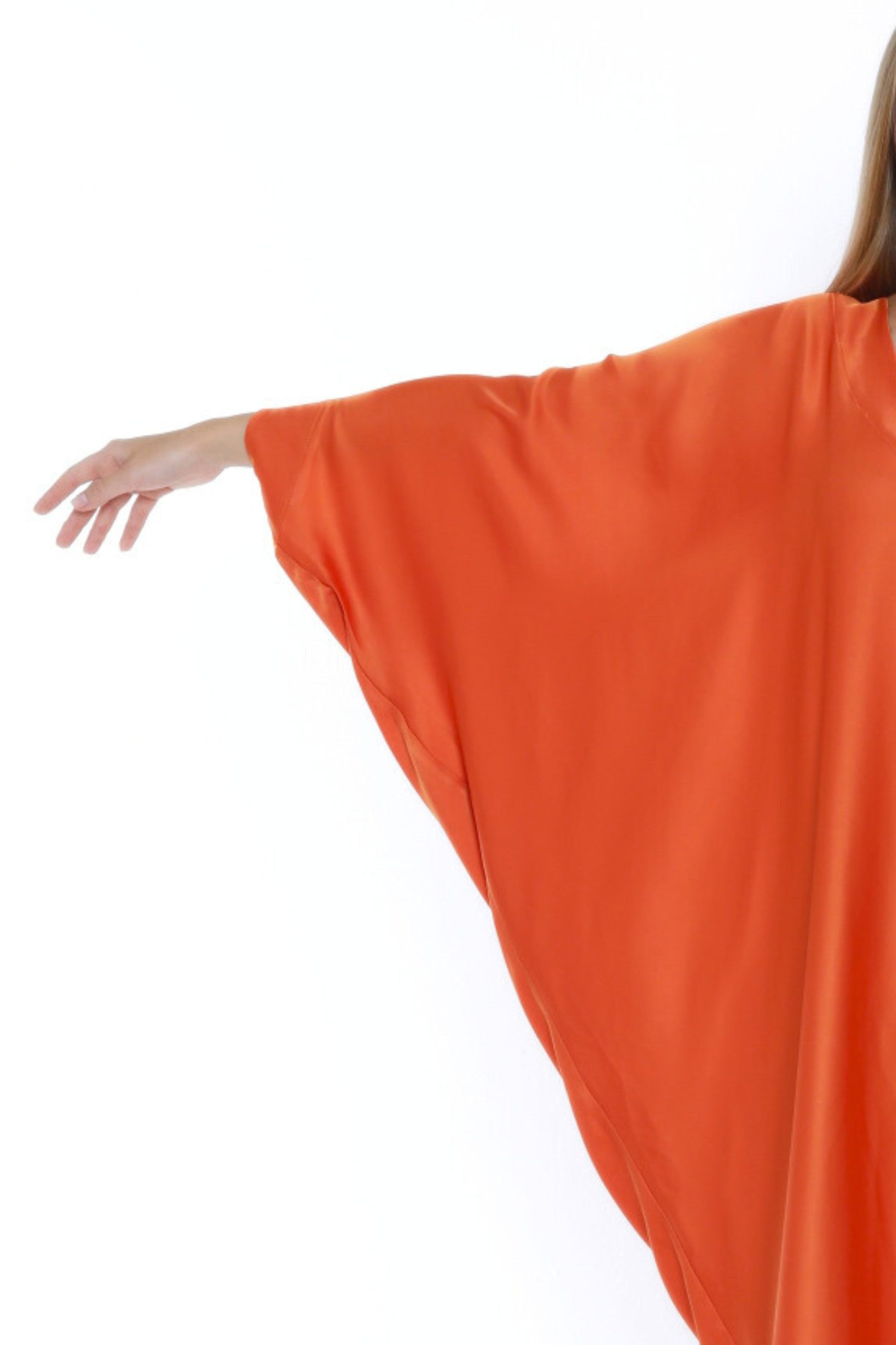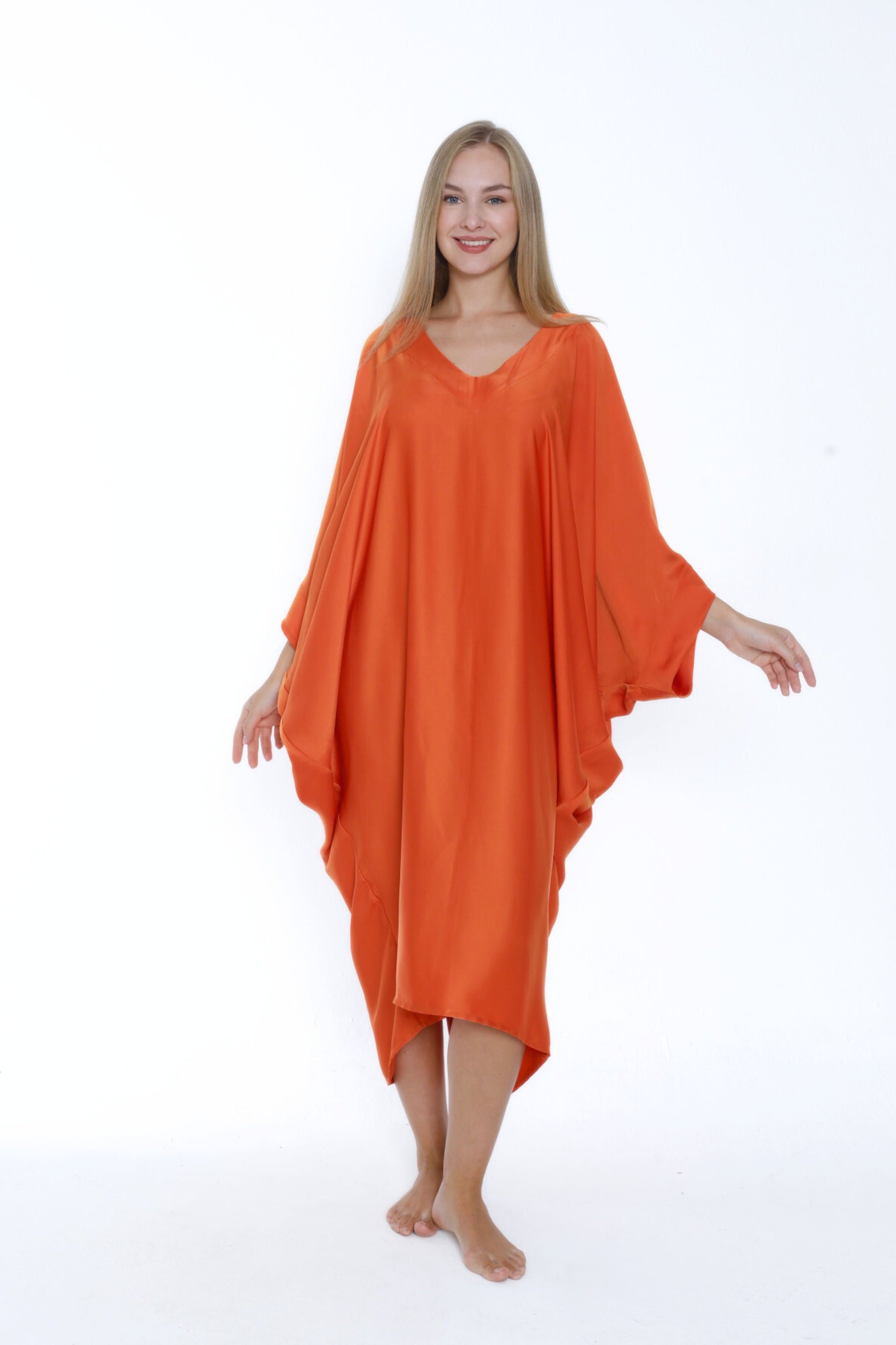 Adopt the French rules of quiet luxury with the Isabela Amie Paris Modern Classic Shade of Orange Kaftan. Inspired by the timeless elegance of French haute couture, this vibrant orange silk satin kaftan, frequently seen in the collections of Hermès, offers a chic, modern twist with its soft V-neckline. The luxurious fabric flows effortlessly over your silhouette, creating a graceful yet striking look that’s perfect for both casual and formal occasions. Lightweight, wrinkle-free, and cool, this kaftan can be styled with bold or neutral accessories for a look that embodies understated sophistication with a pop of color.