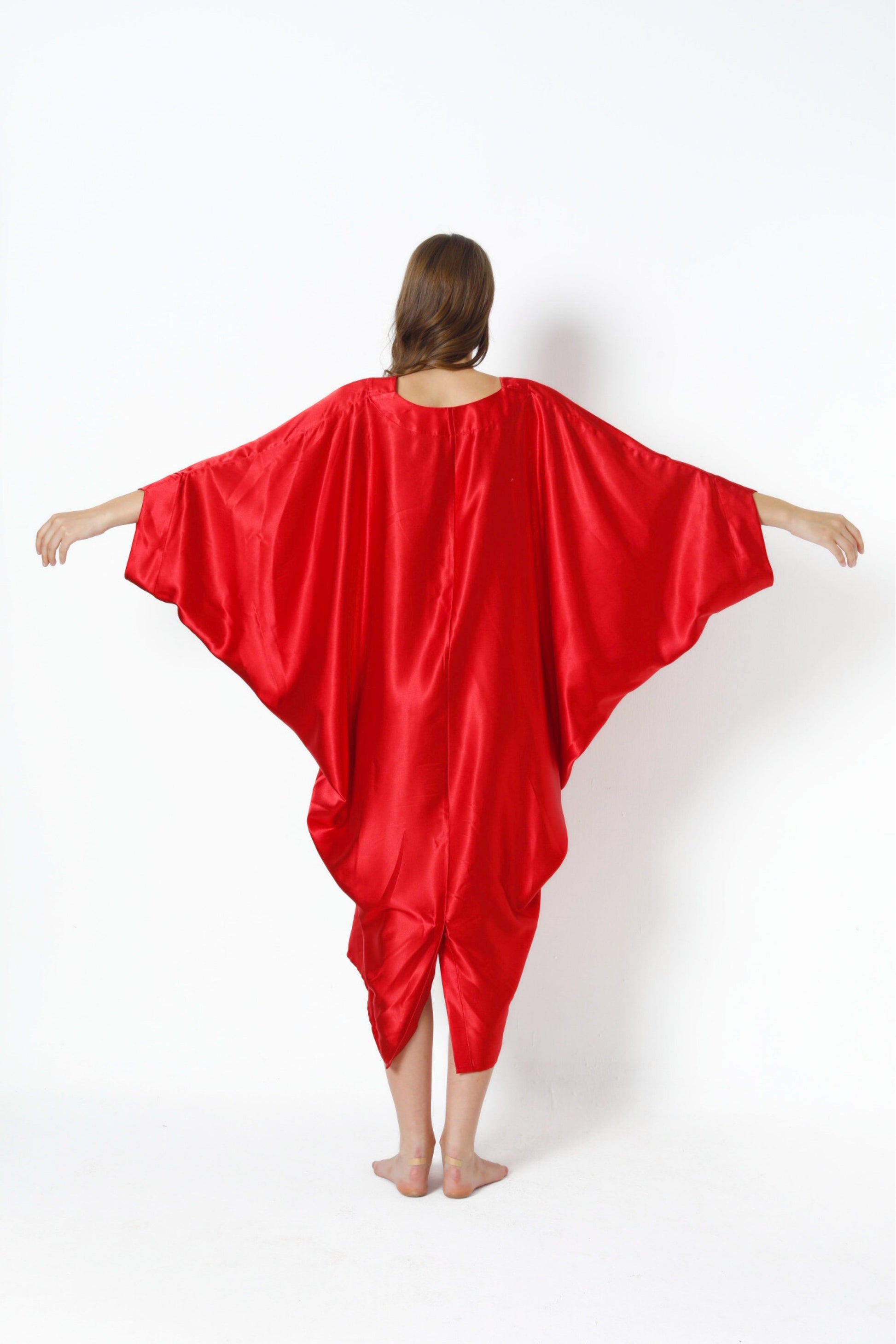 Dress to impress and be the passionate showstopper with the Isabela Amie Paris classic red silk satin kaftan. This elegantly timeless red dress will be sure to turn heads as it romantically drapes over your body giving a slimming sensual silhouette. This kaftan is sure to boost your confidence and suitable for any occasion as it is light weight and breathable. Style it with a red or nude lipstick and a belt of any color—including the same or a different red.