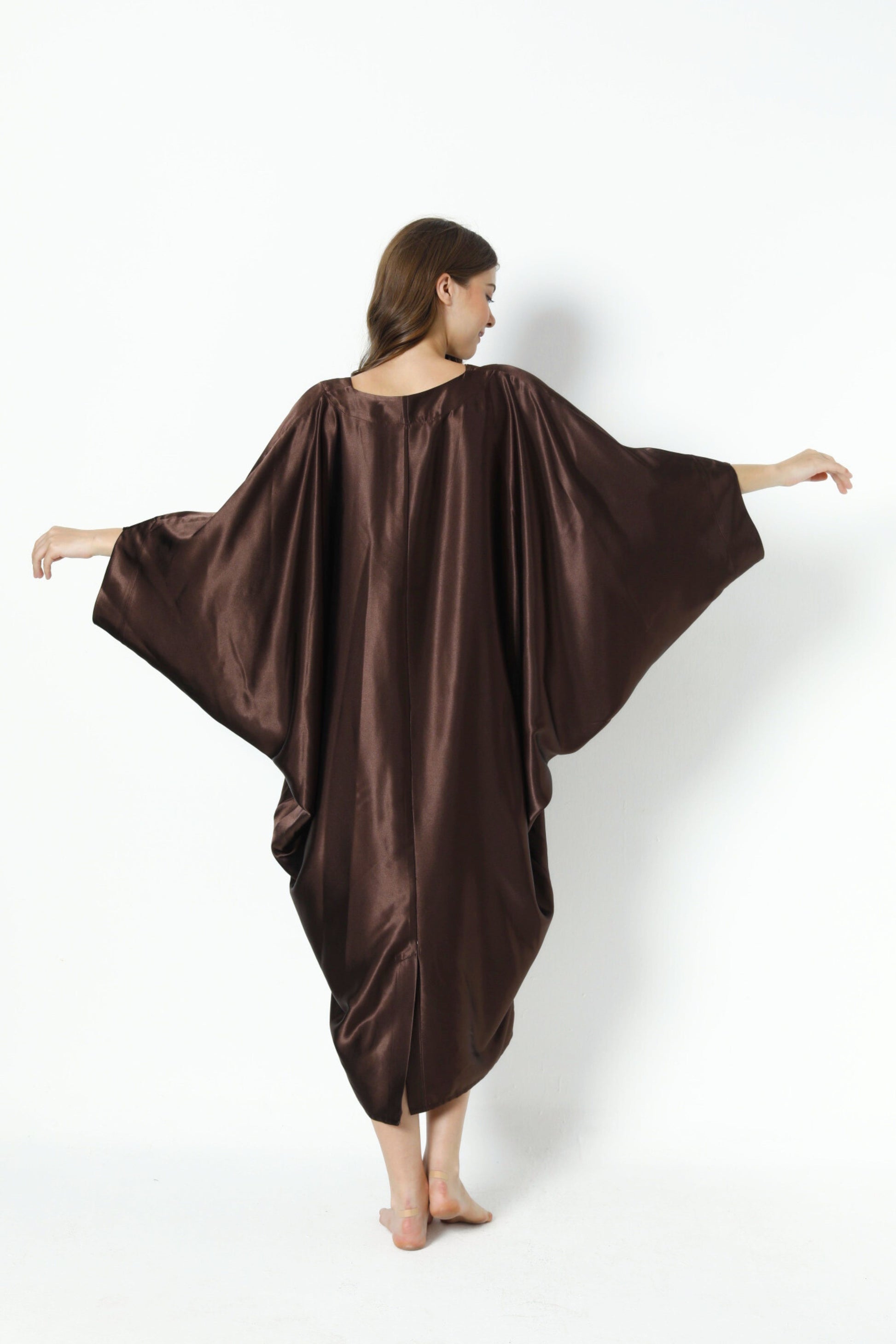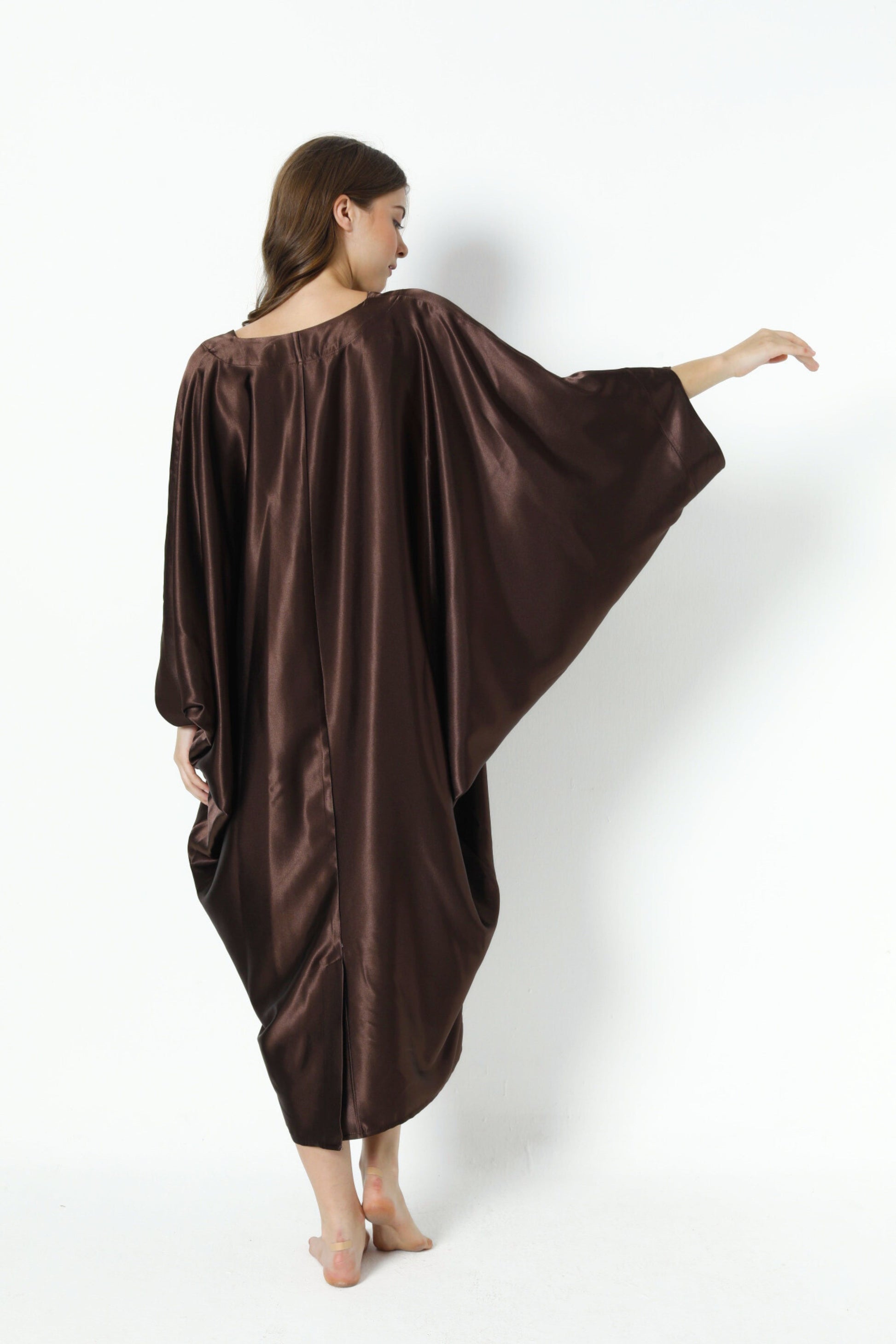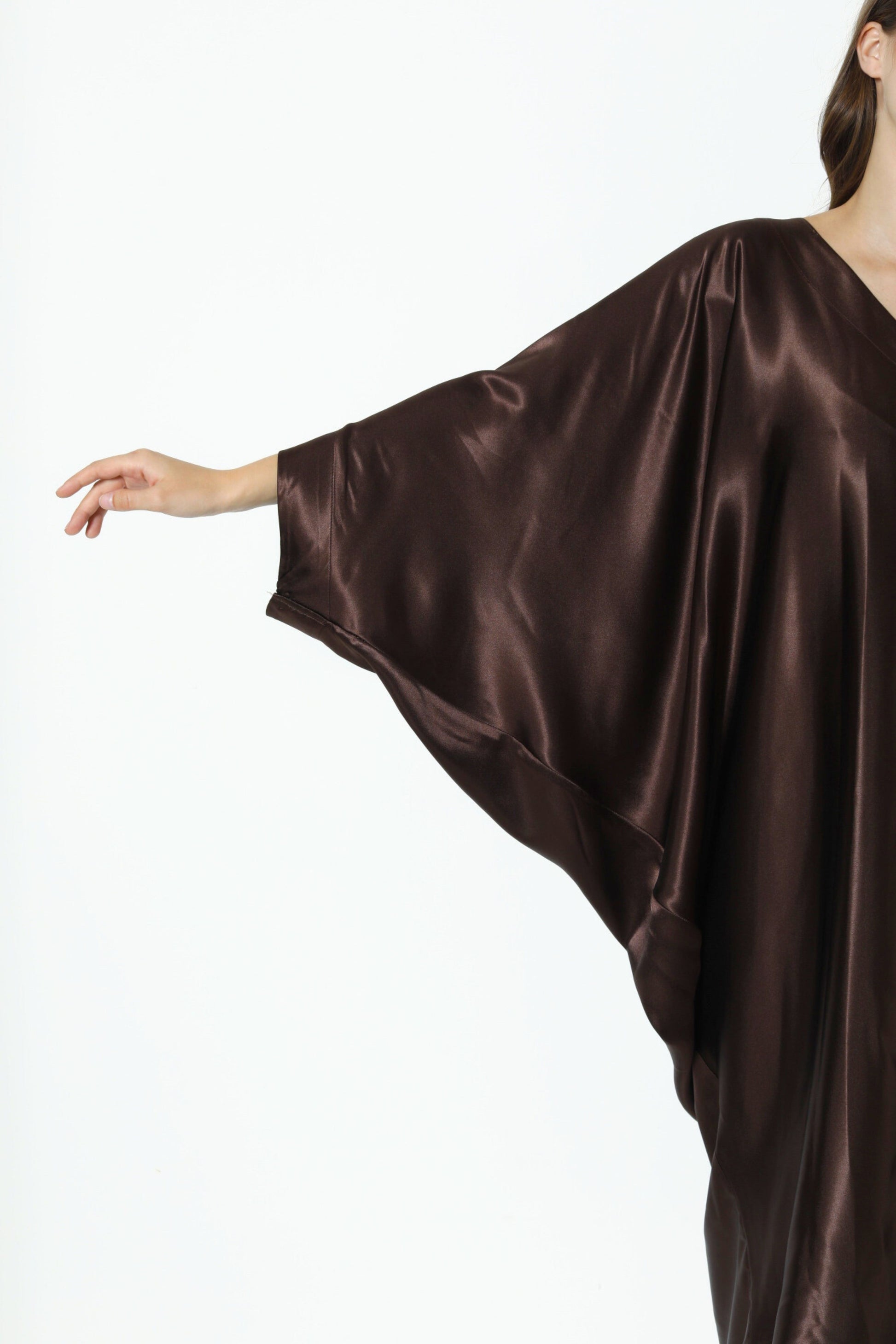 Embrace your inner goddess with this gorgeously luxurious silky satin dark brown kaftan. The satin weaving technique leaves a lustrous glossy shine that flows along the body like water. This gorgeous kaftan silhouette contains the signature aesthetic with distinctive Isabela Amie Paris elegance suitable for any body shape and perfect for a sophisticated event. You can easily accessorize it with a verity of textures, colors and sparkles.