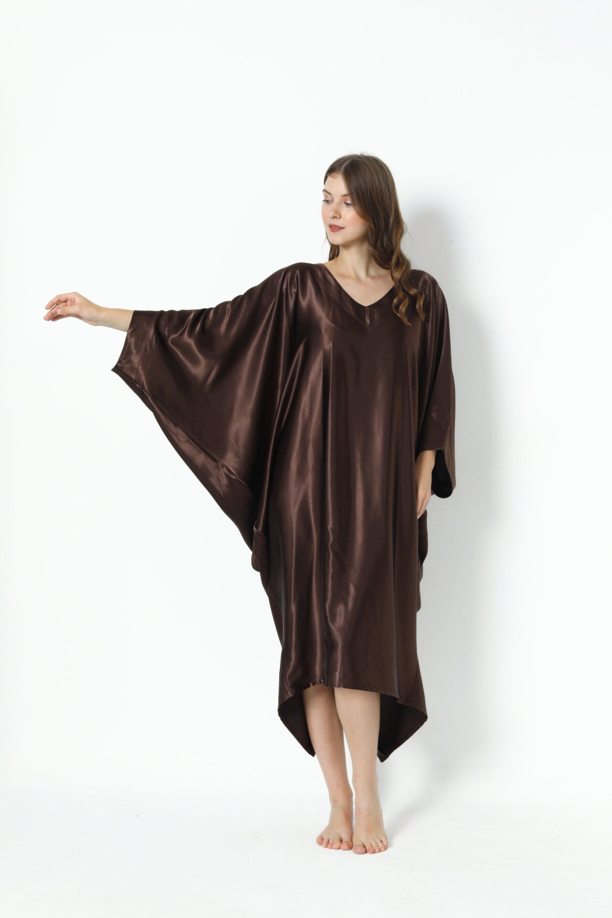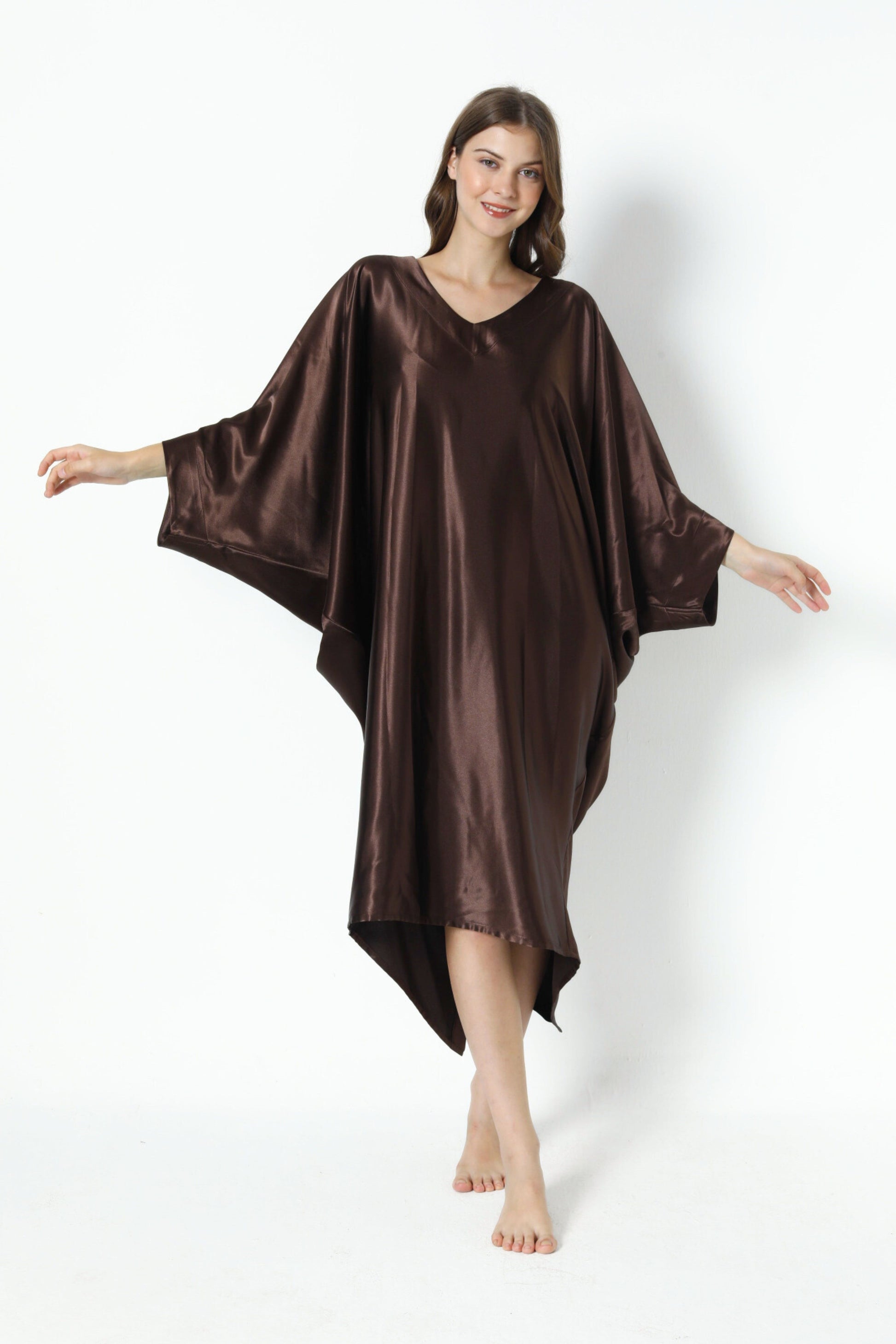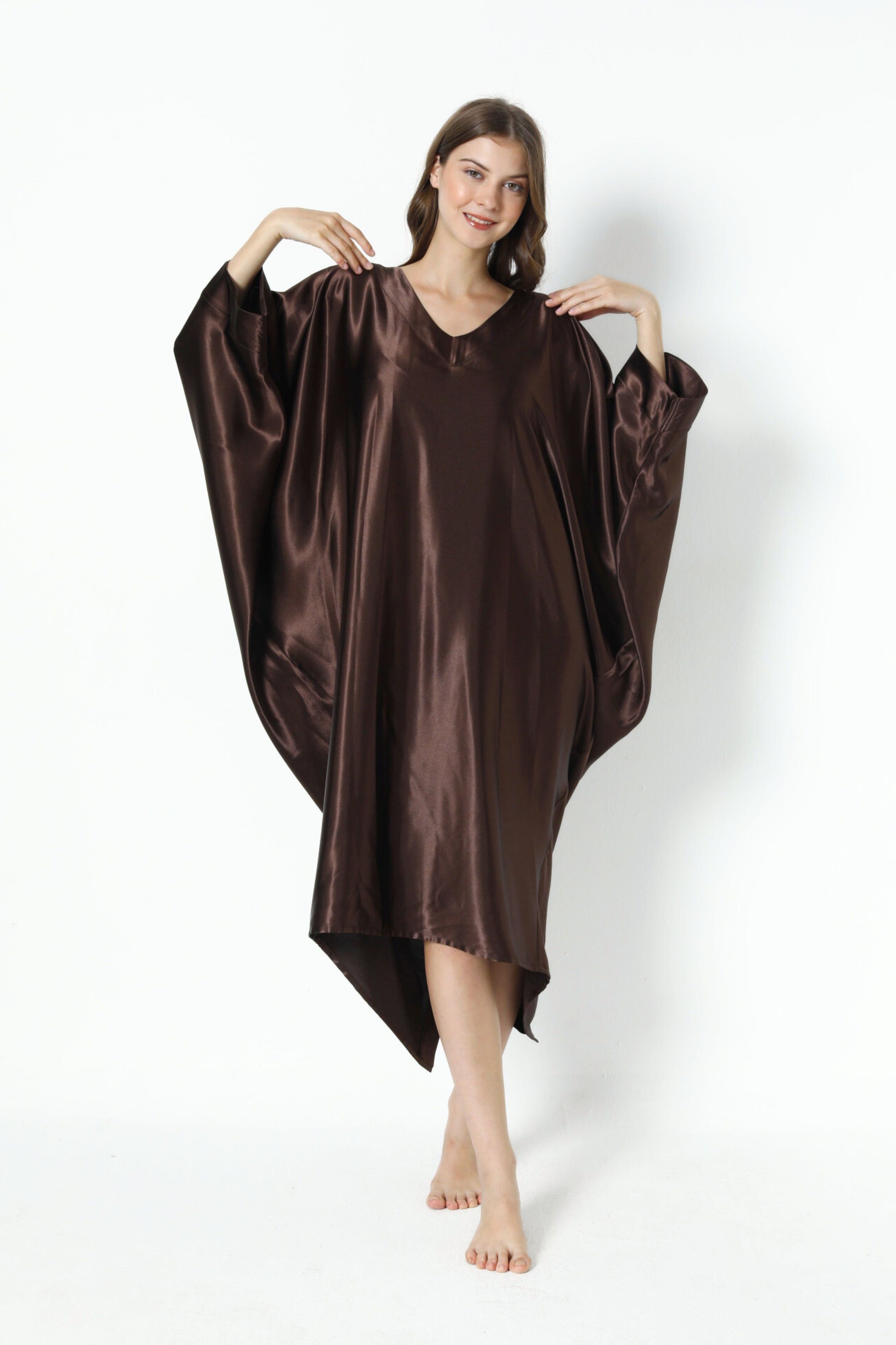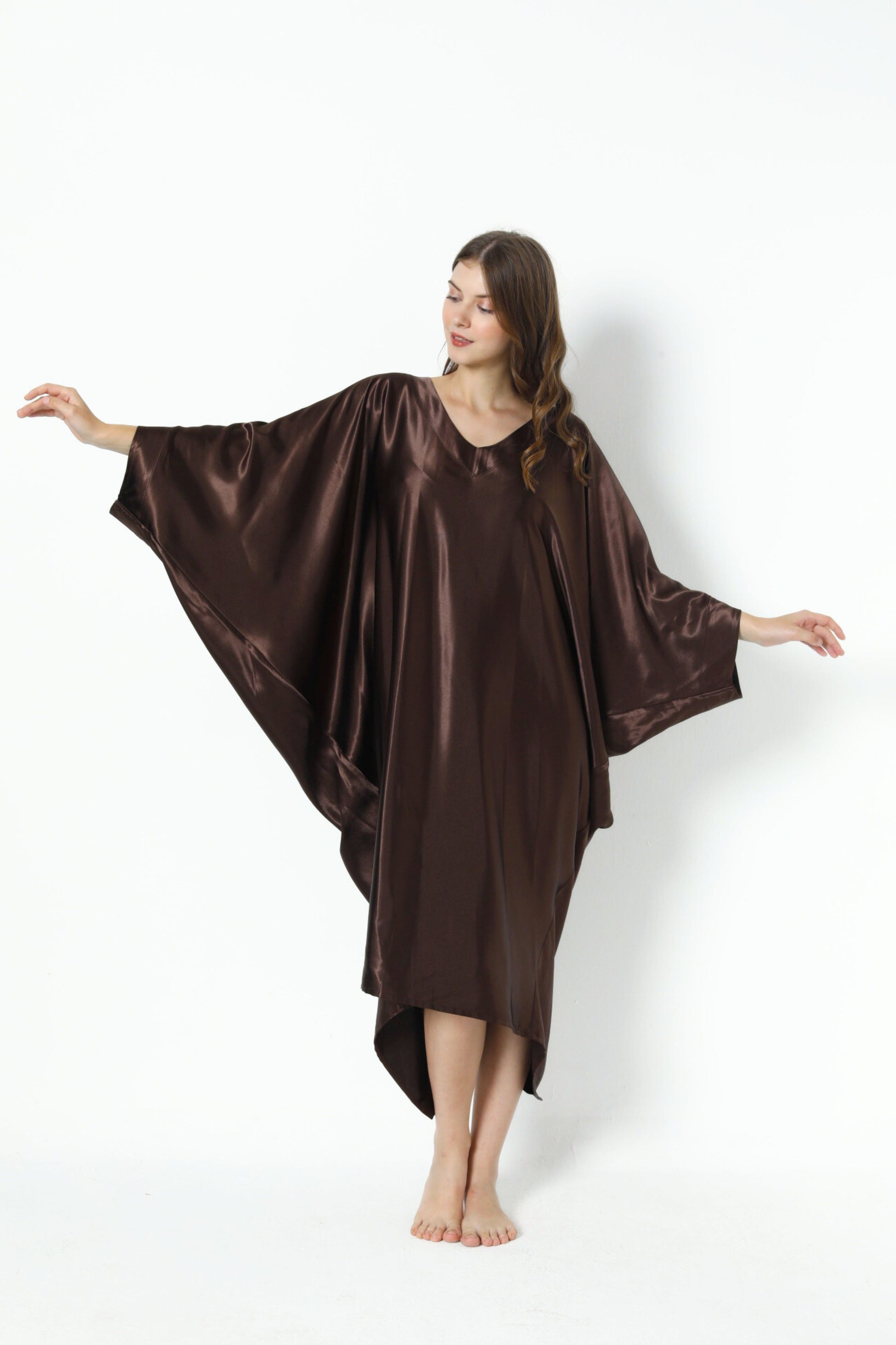 Embrace your inner goddess with this gorgeously luxurious silky satin dark brown kaftan. The satin weaving technique leaves a lustrous glossy shine that flows along the body like water. This gorgeous kaftan silhouette contains the signature aesthetic with distinctive Isabela Amie Paris elegance suitable for any body shape and perfect for a sophisticated event. You can easily accessorize it with a verity of textures, colors and sparkles.