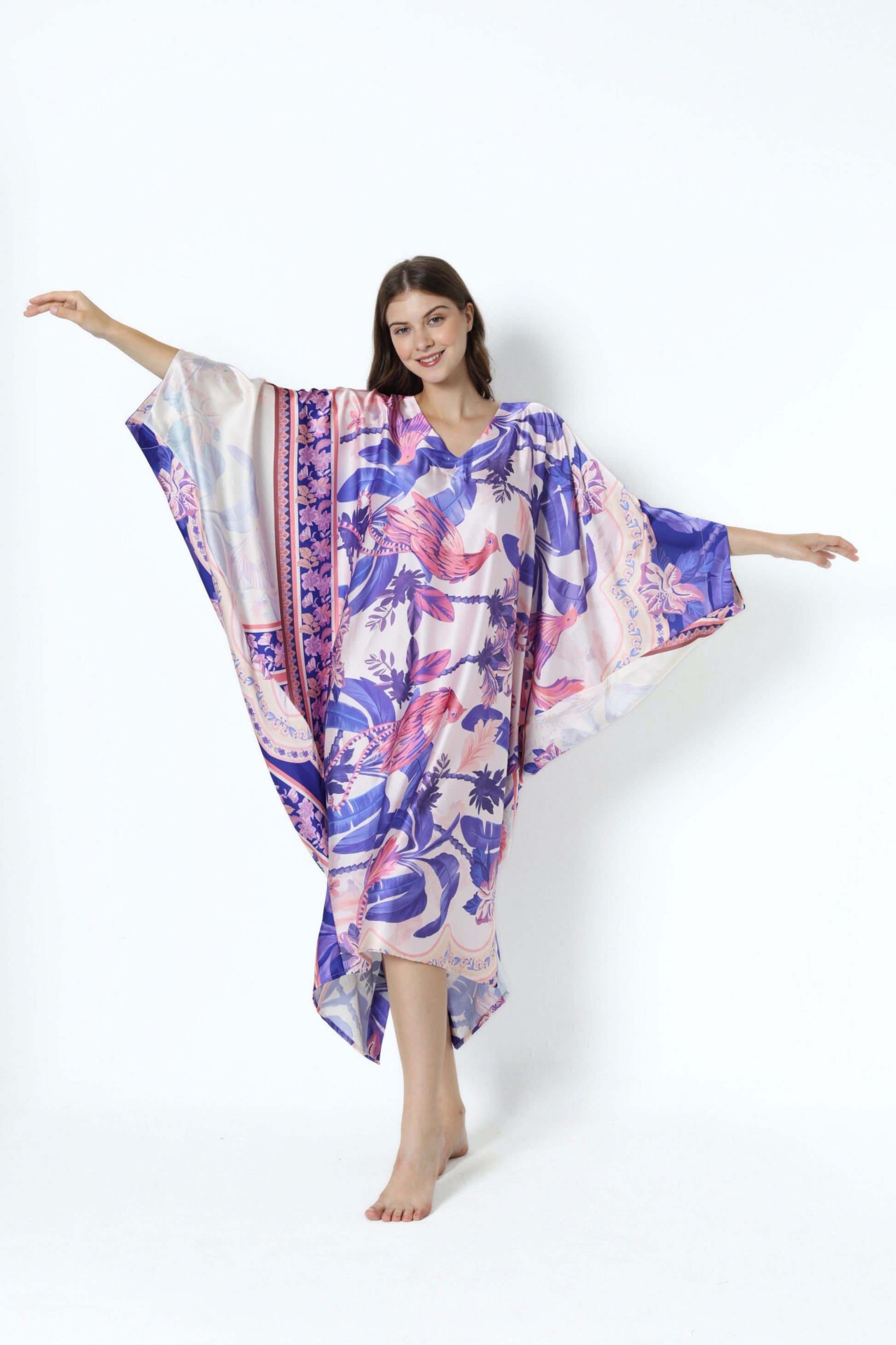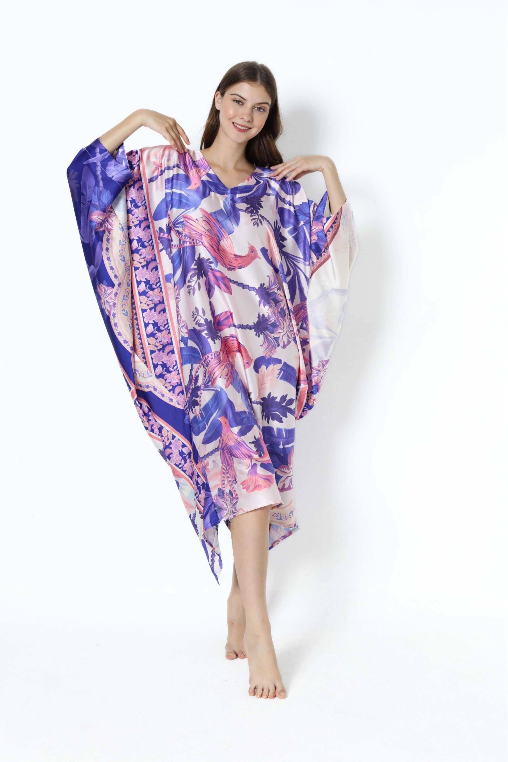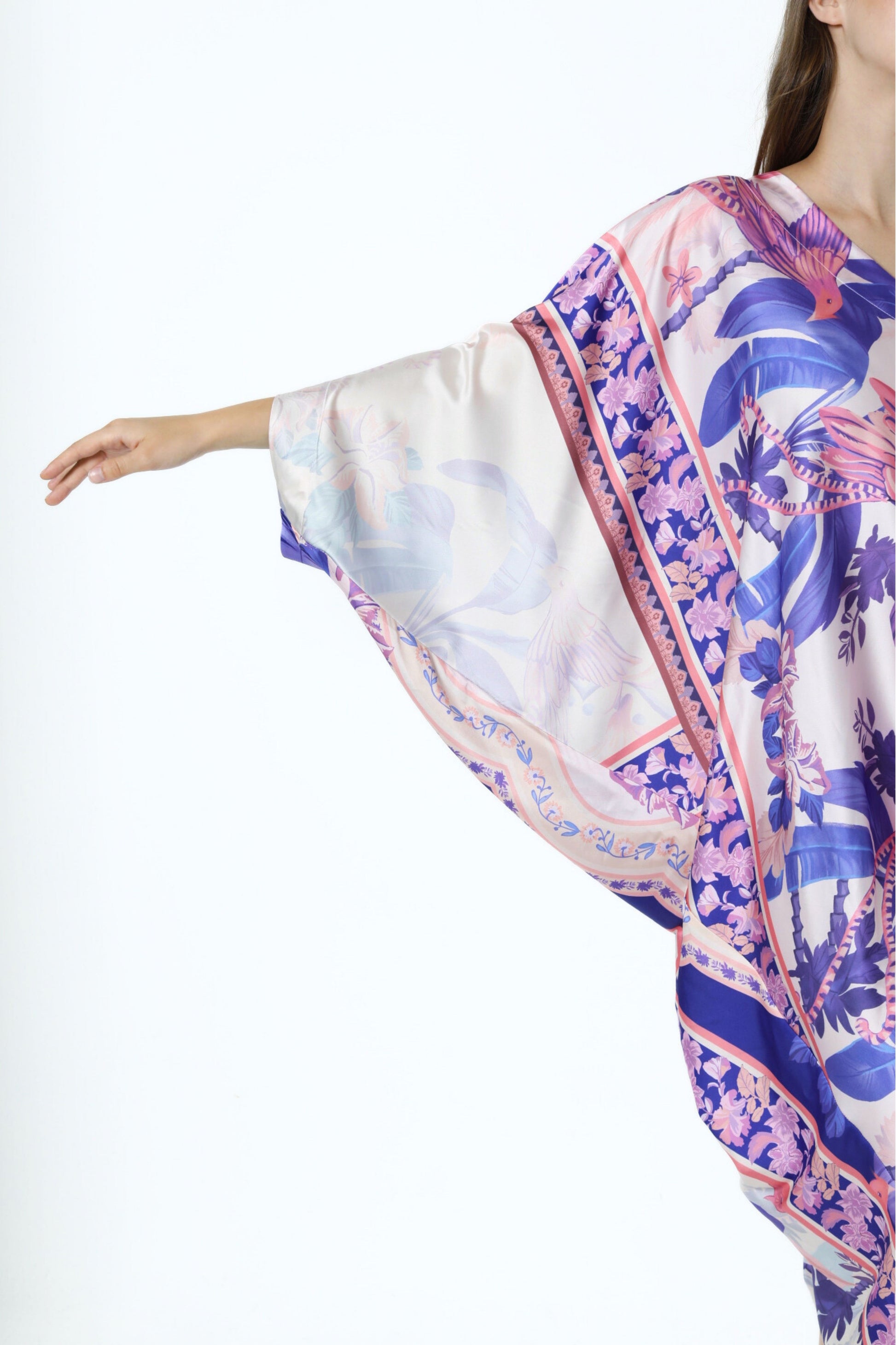 Hand crafted with awe inspiring luxury, this Kaftan is defined by a kaleidoscope of pink and purple poetry with tropical ornate details. This cool and breathable wrinkle-free kaftan is perfect for traveling, the beach or any formal occasion. This gorgeous silk satin reflects light giving it a touch of glamour and buttery soft to the touch, while perfectly fitting your body with its flawless drape. You can style this kaftan with, nude, metallic, purple or pink accessories for a perfectly feminine luxuriously conformable feel and look.