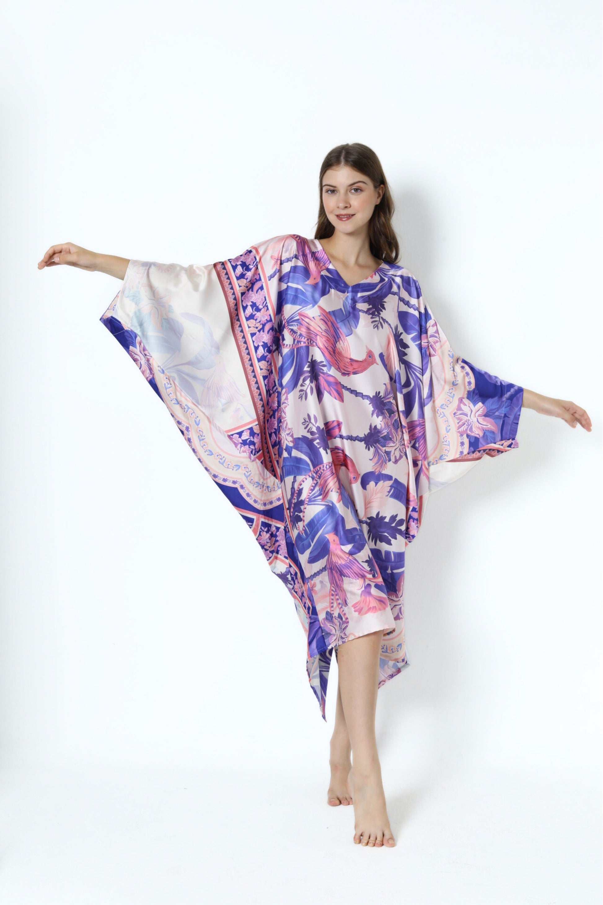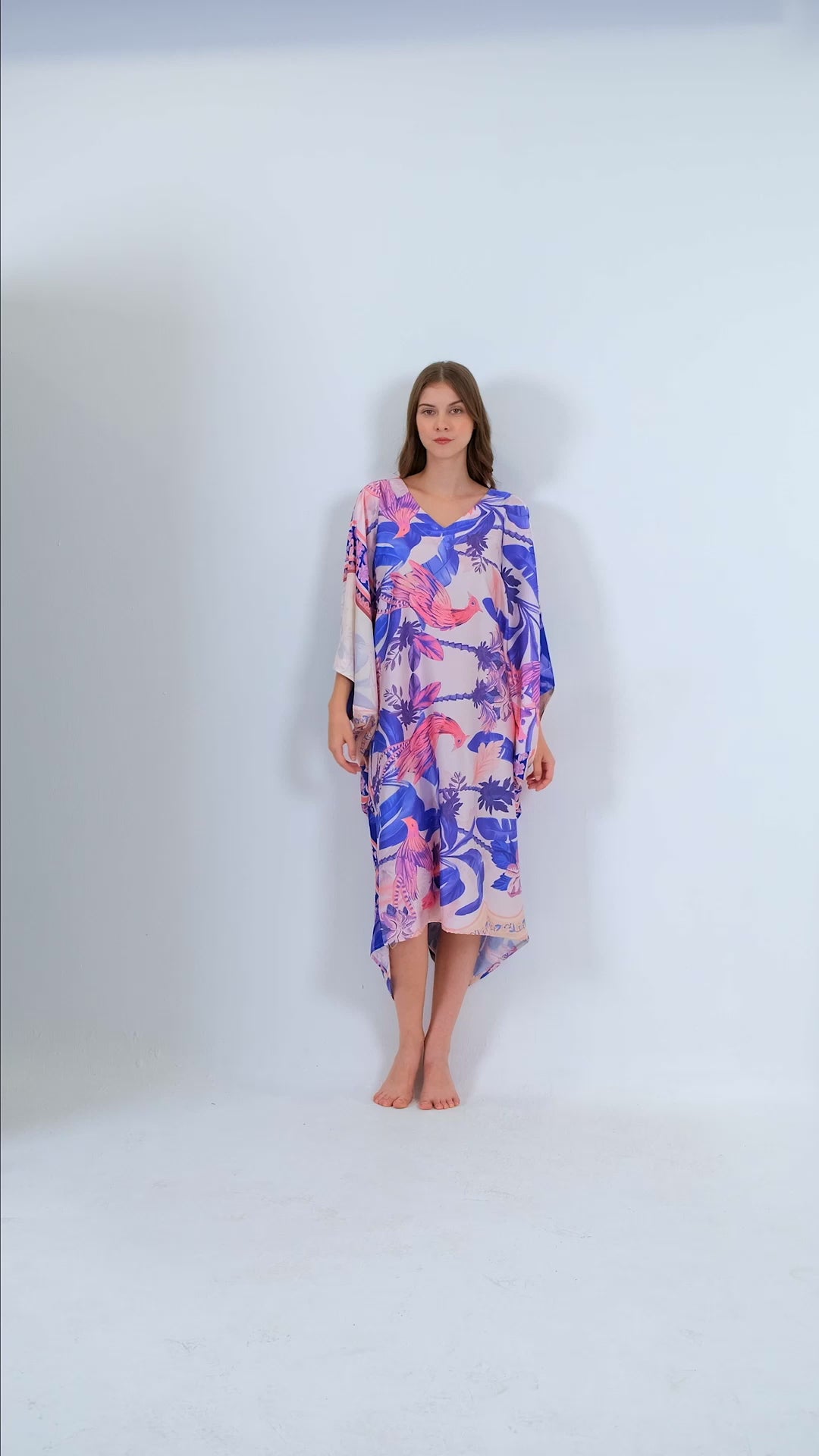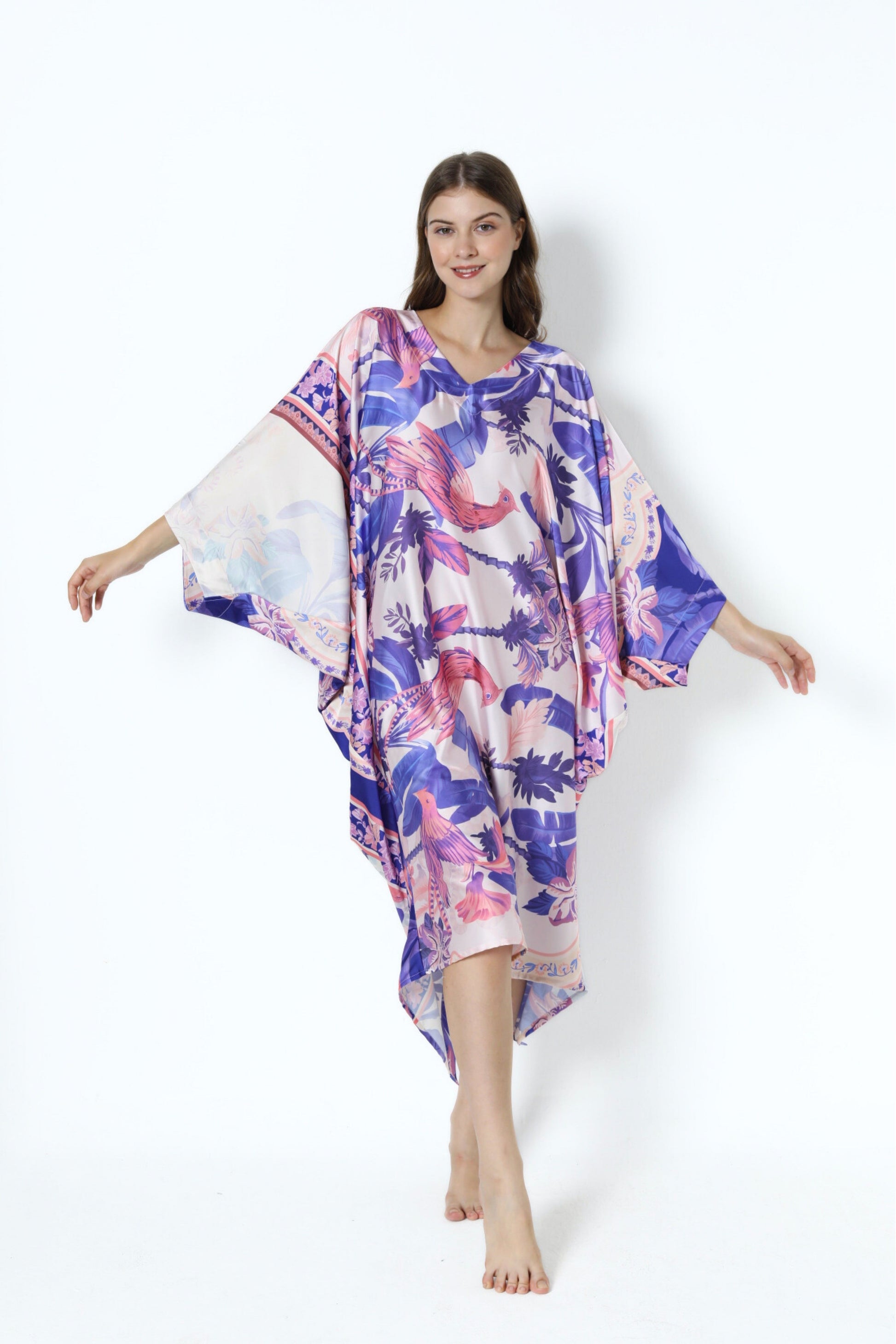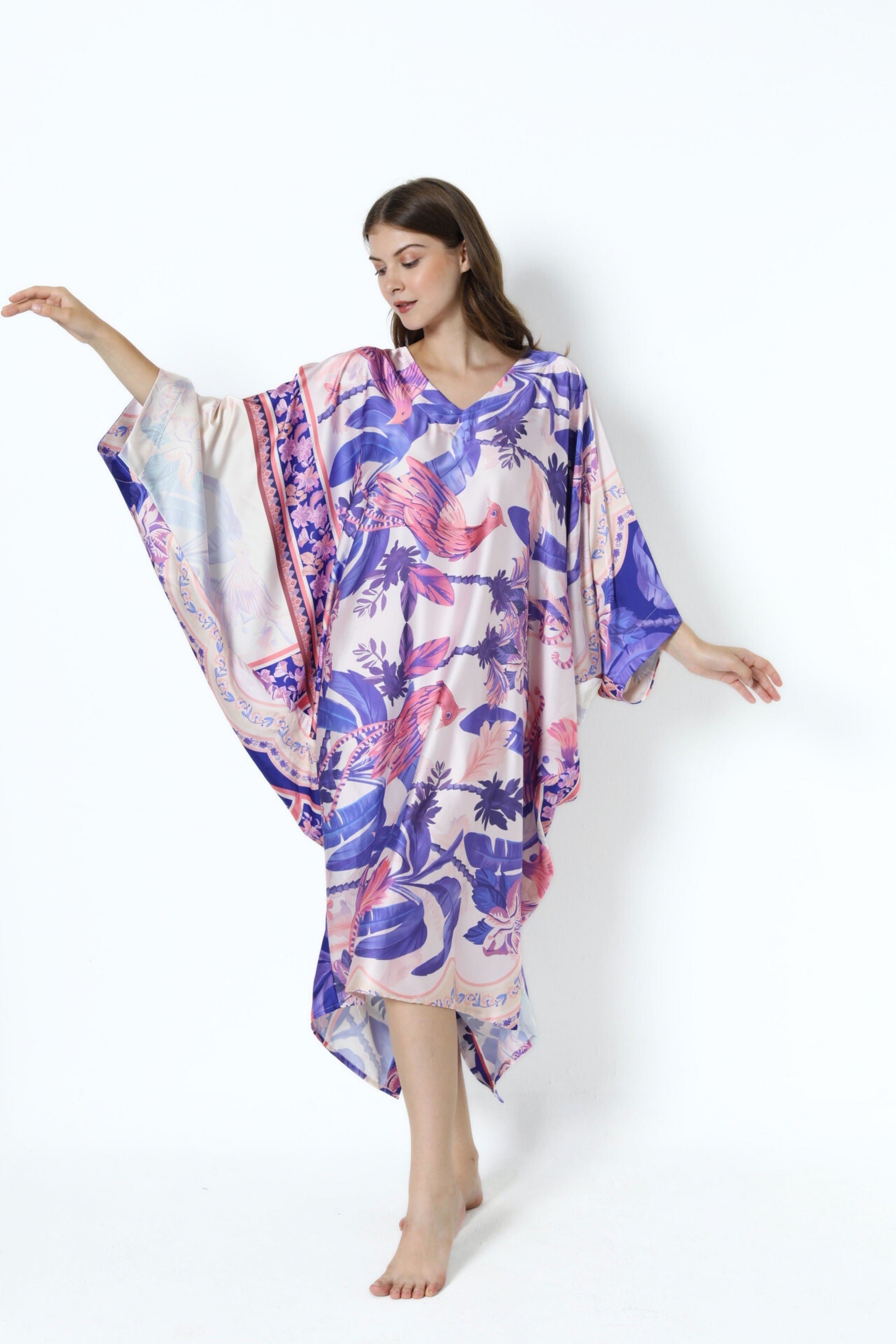 Hand crafted with awe inspiring luxury, this Kaftan is defined by a kaleidoscope of pink and purple poetry with tropical ornate details. This cool and breathable wrinkle-free kaftan is perfect for traveling, the beach or any formal occasion. This gorgeous silk satin reflects light giving it a touch of glamour and buttery soft to the touch, while perfectly fitting your body with its flawless drape. You can style this kaftan with, nude, metallic, purple or pink accessories for a perfectly feminine luxuriously conformable feel and look.