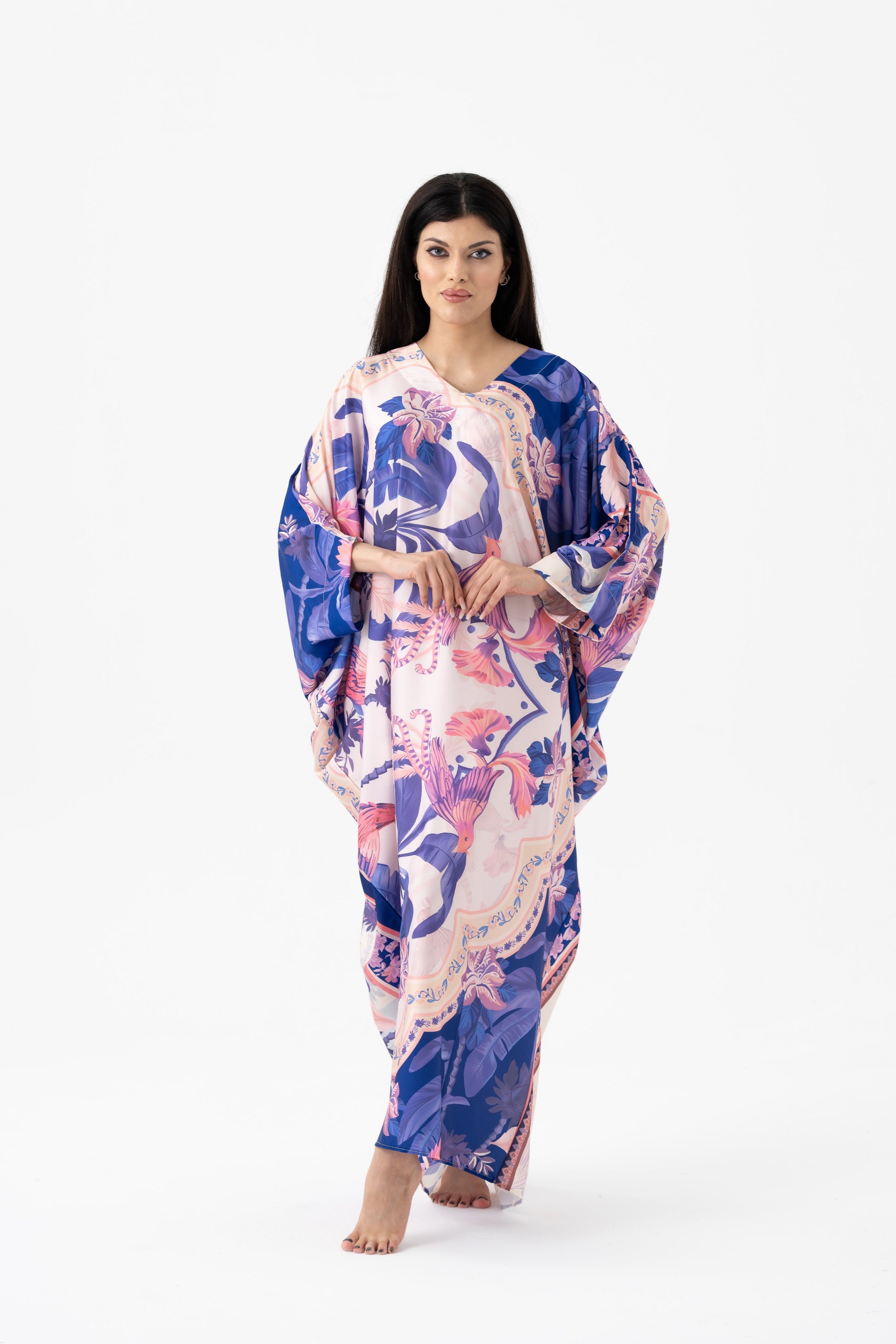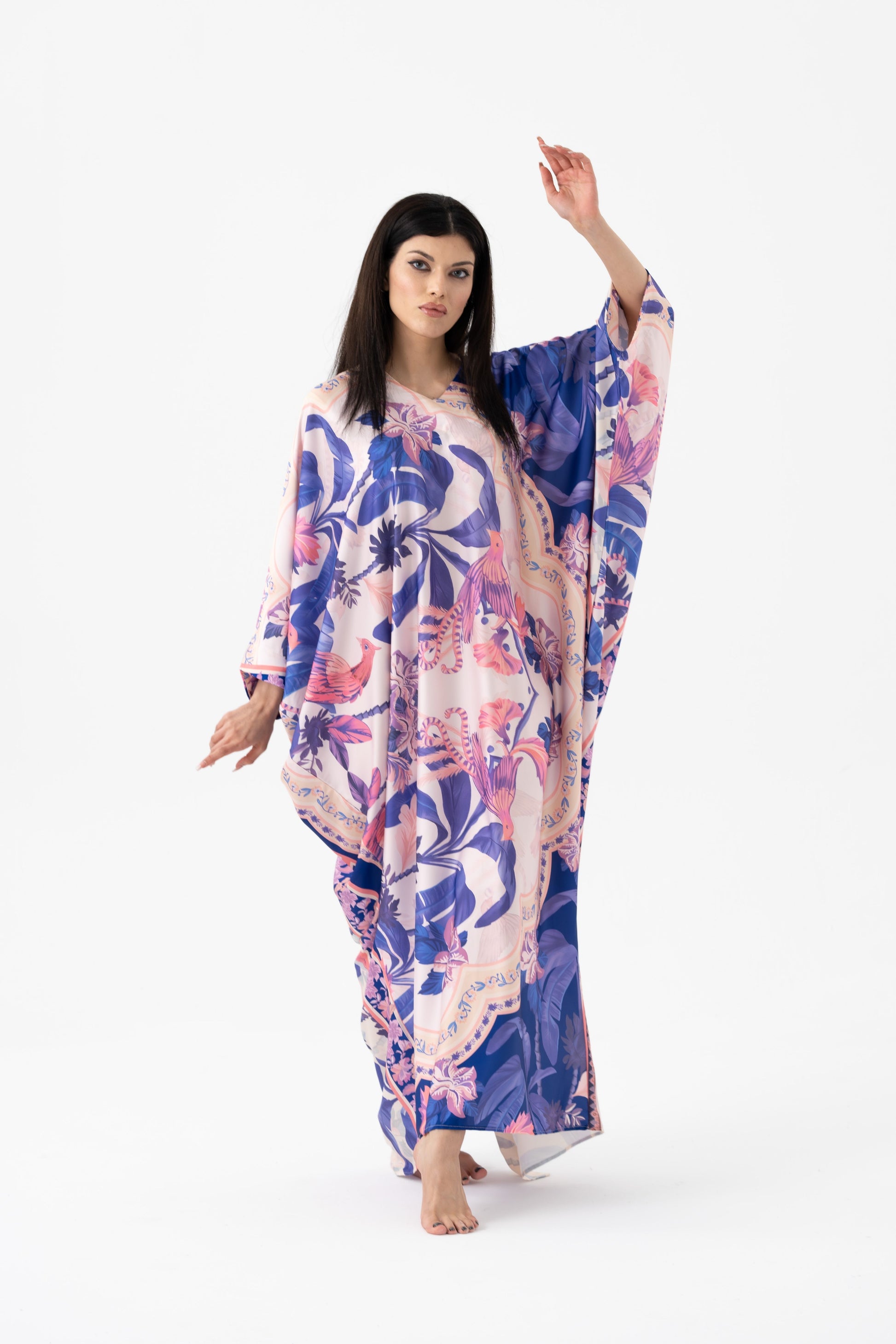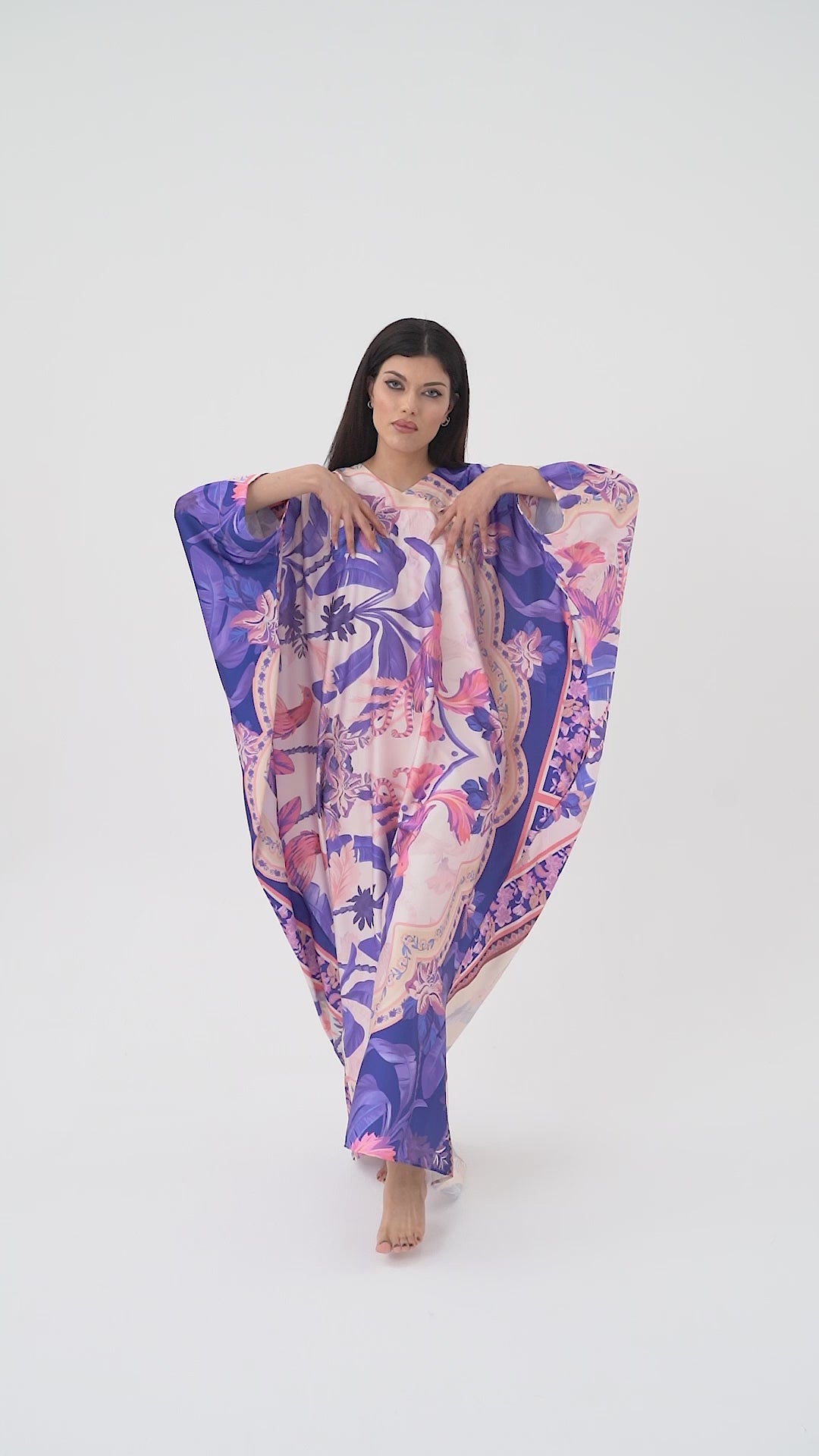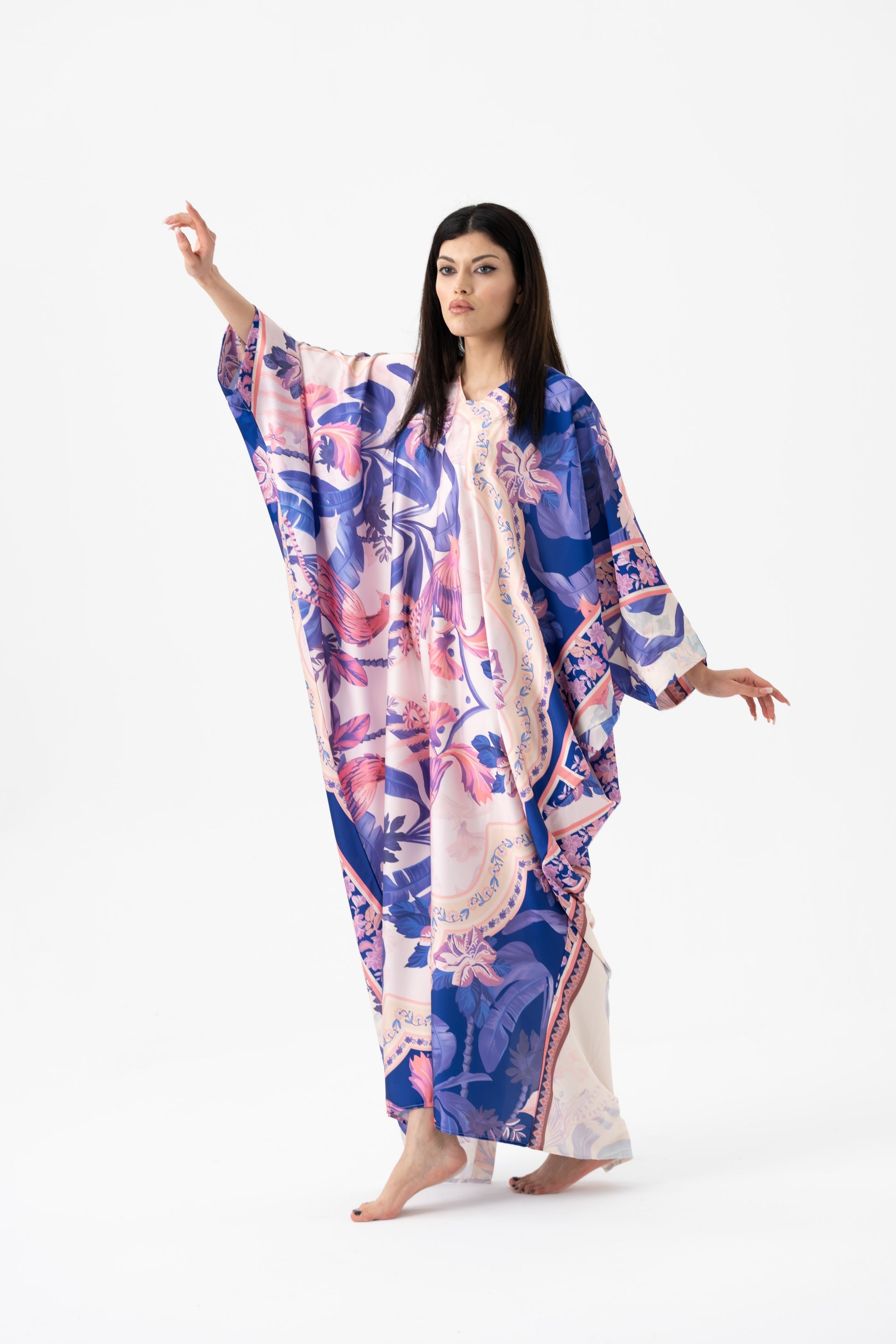 Hand crafted with awe inspiring luxury, this Kaftan is defined by a kaleidoscope of pink and purple poetry with tropical ornate details. This cool and breathable wrinkle-free kaftan is perfect for traveling, the beach or any formal occasion. This gorgeous silk satin reflects light giving it a touch of glamour and buttery soft to the touch, while perfectly fitting your body with its flawless drape. You can style this kaftan with, nude, metallic, purple or pink accessories for a perfectly feminine luxuriously conformable feel and look.