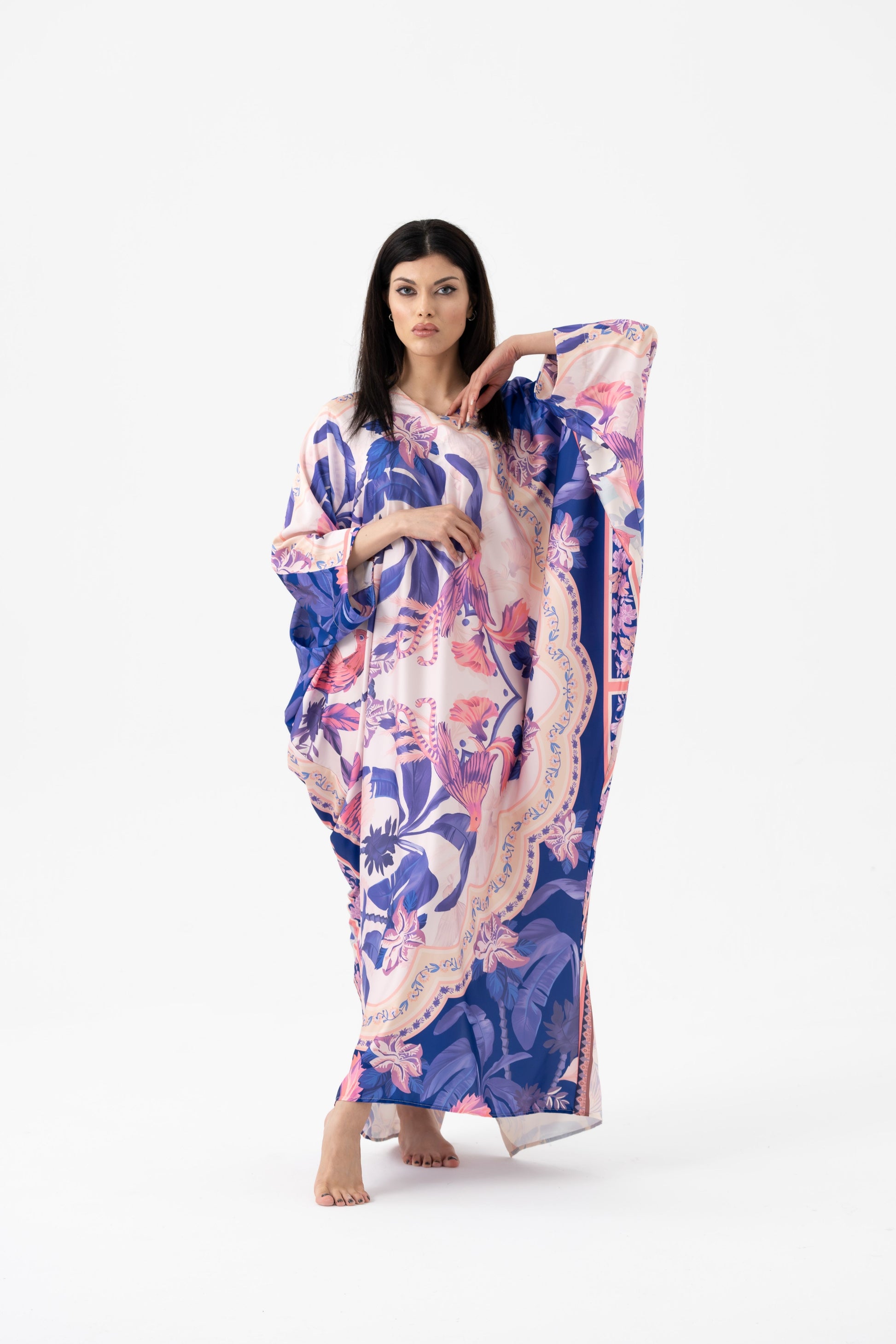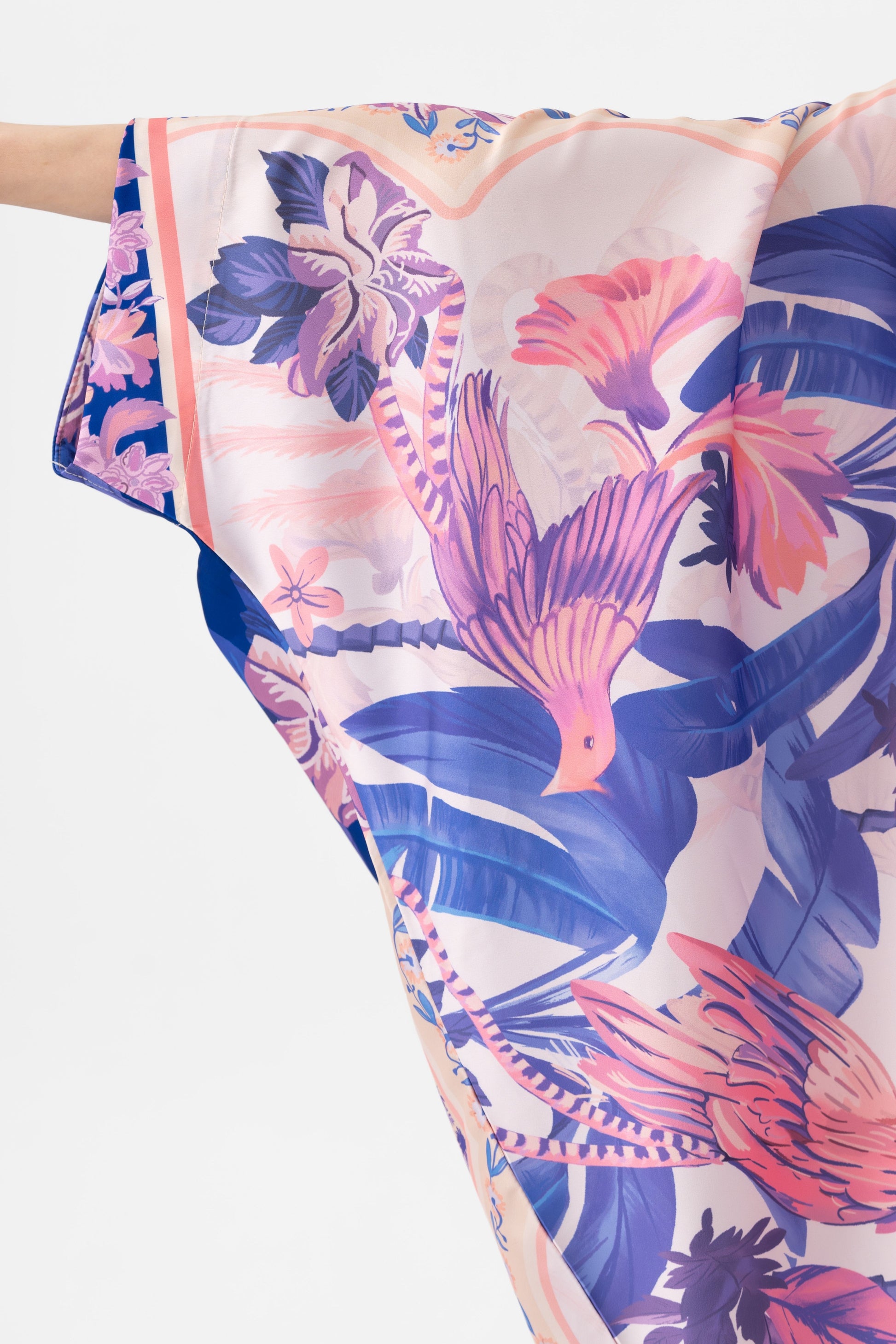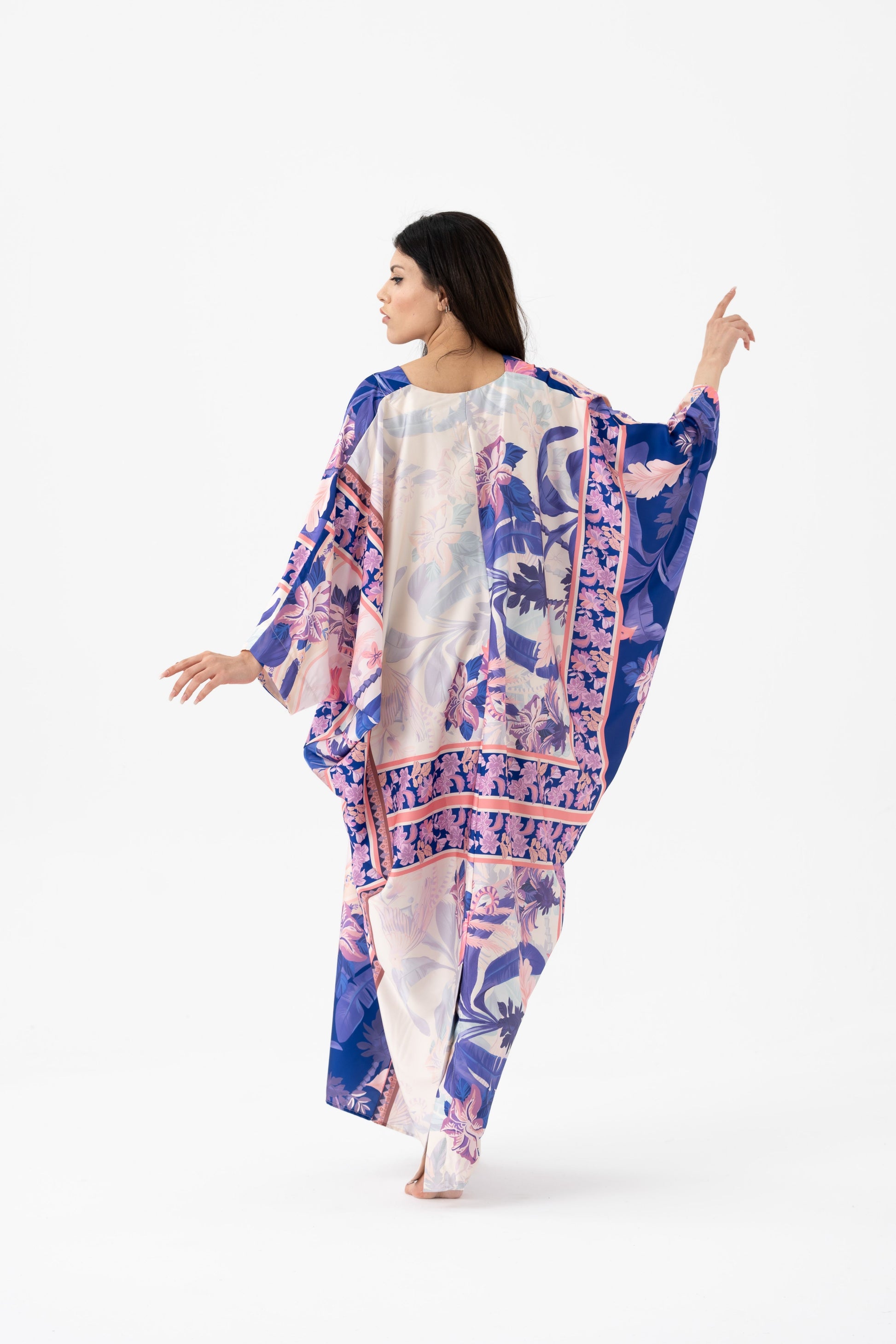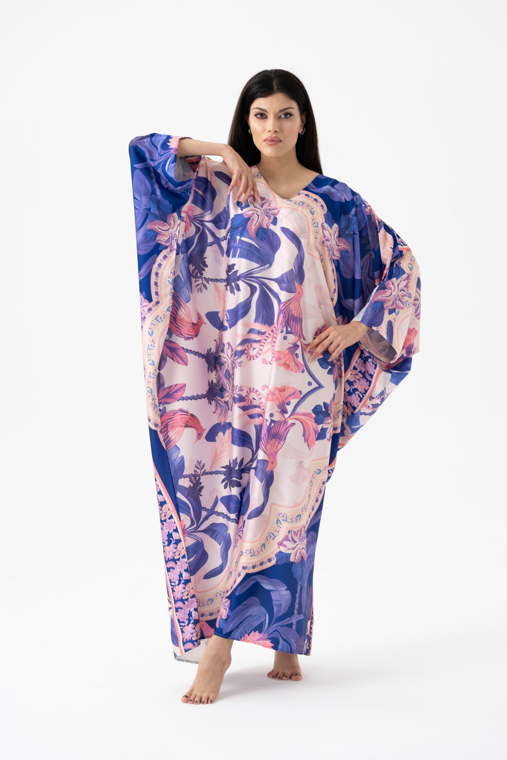 Hand crafted with awe inspiring luxury, this Kaftan is defined by a kaleidoscope of pink and purple poetry with tropical ornate details. This cool and breathable wrinkle-free kaftan is perfect for traveling, the beach or any formal occasion. This gorgeous silk satin reflects light giving it a touch of glamour and buttery soft to the touch, while perfectly fitting your body with its flawless drape. You can style this kaftan with, nude, metallic, purple or pink accessories for a perfectly feminine luxuriously conformable feel and look.