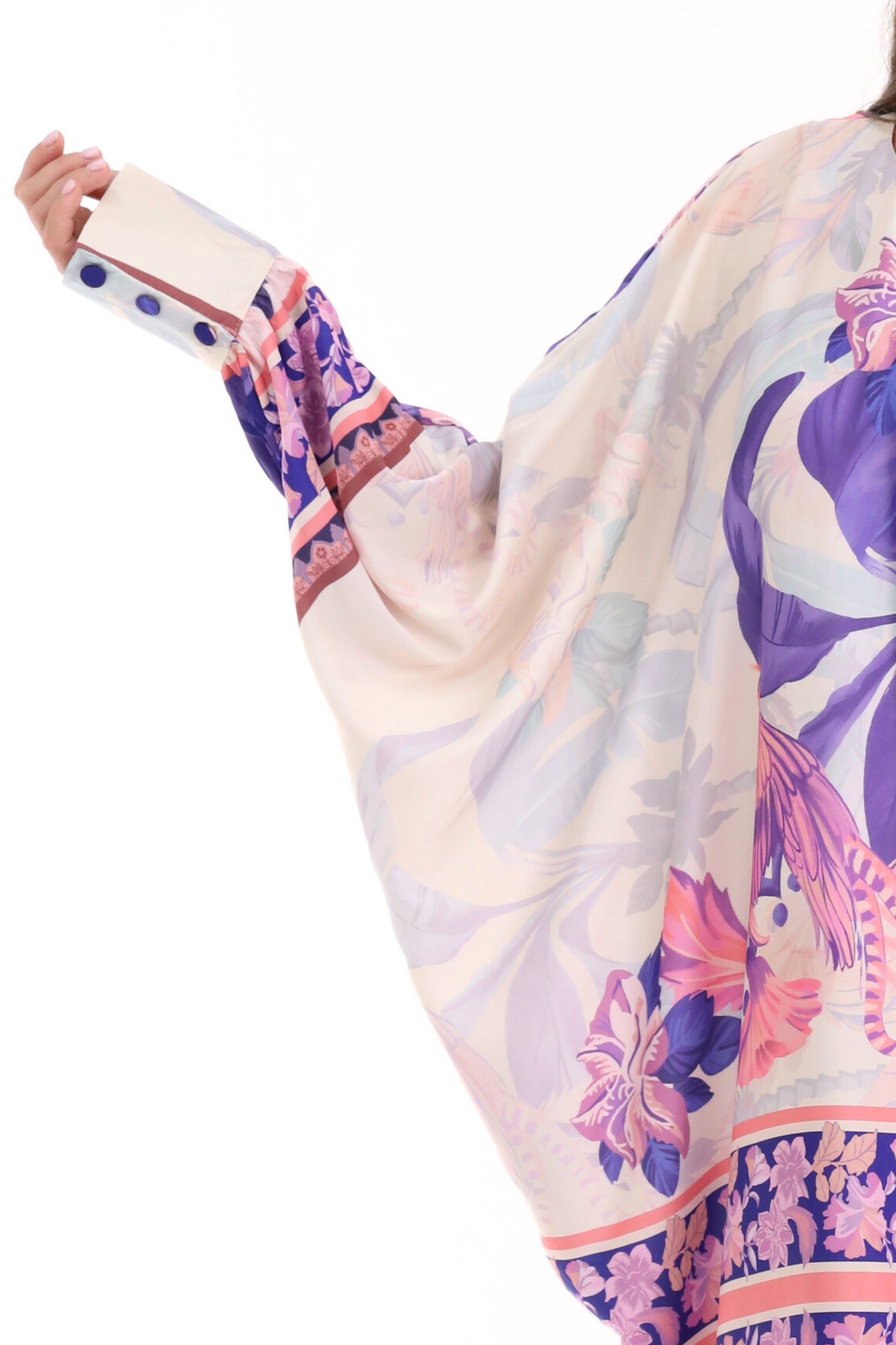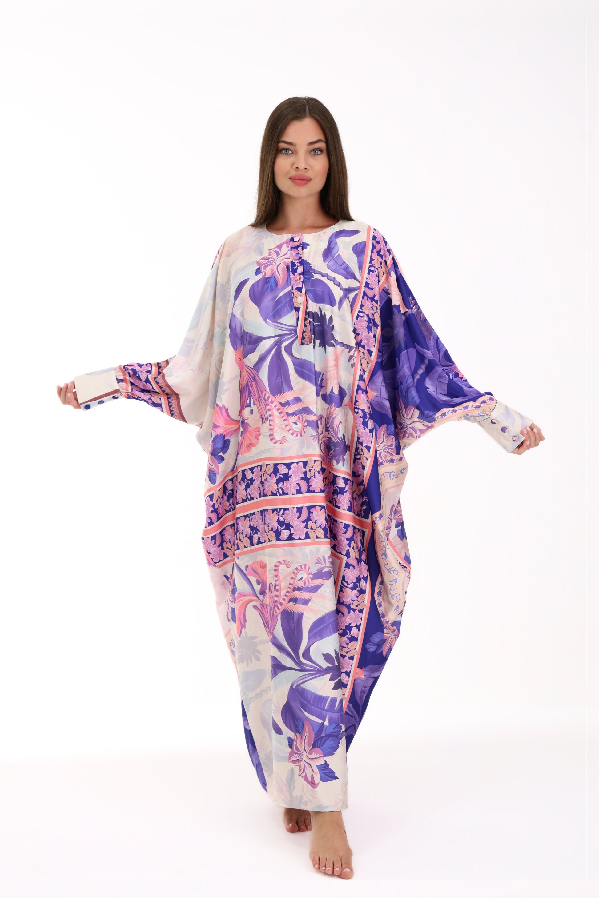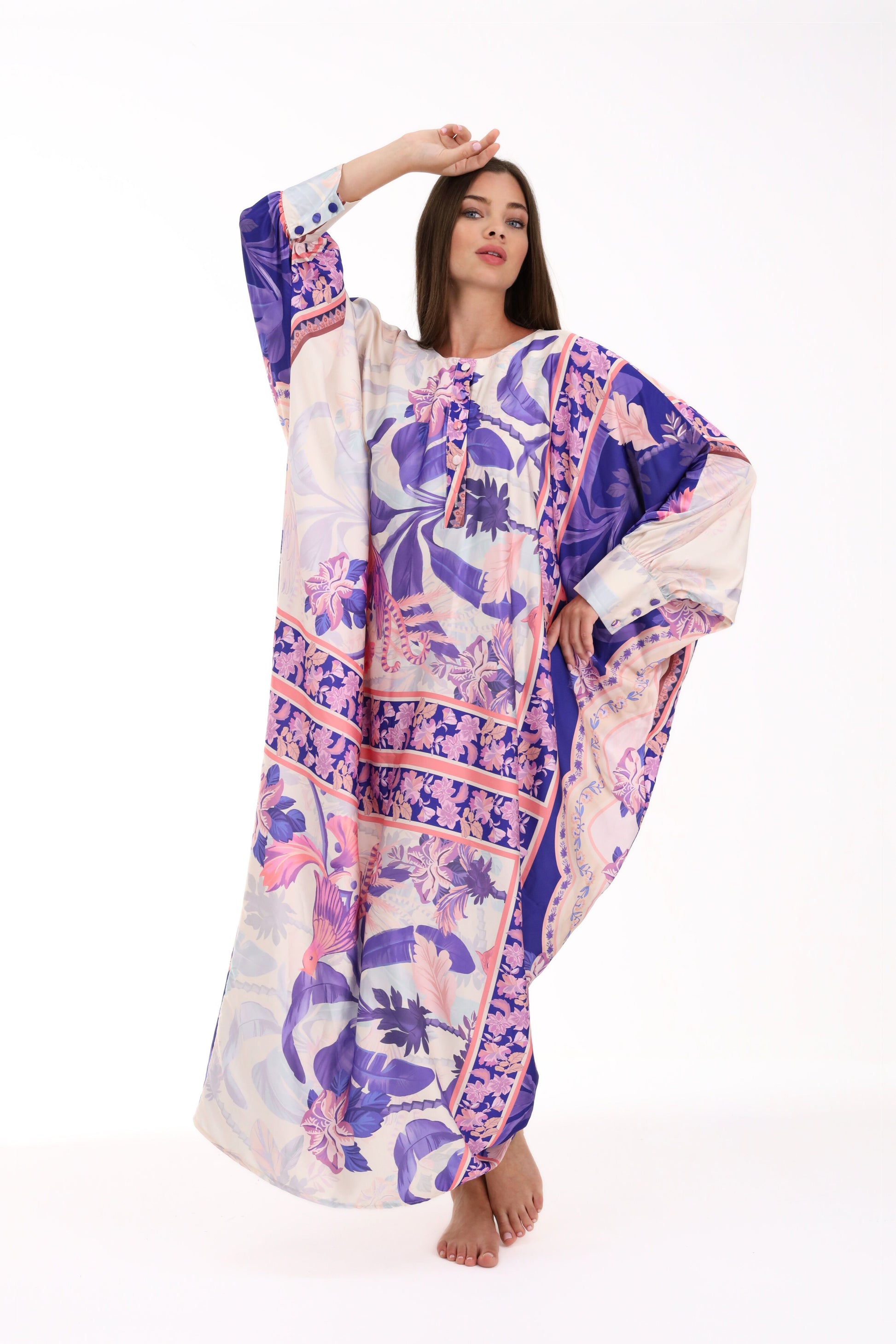 Indulge in full-coverage elegance with the Isabela Amie Paris Traditional Flowers Paradise Green Kaftan. Hand crafted with awe inspiring luxury, this Kaftan is defined by a kaleidoscope of pink and purple poetry with tropical ornate details. This cool and breathable wrinkle-free kaftan is perfect for traveling, the beach or any formal occasion. This gorgeous silk satin reflects light giving it a touch of glamour and buttery soft to the touch, while perfectly fitting your body with its flawless drape. You can style this kaftan with, nude, metallic, purple or pink accessories for a perfectly feminine luxuriously conformable feel and look.