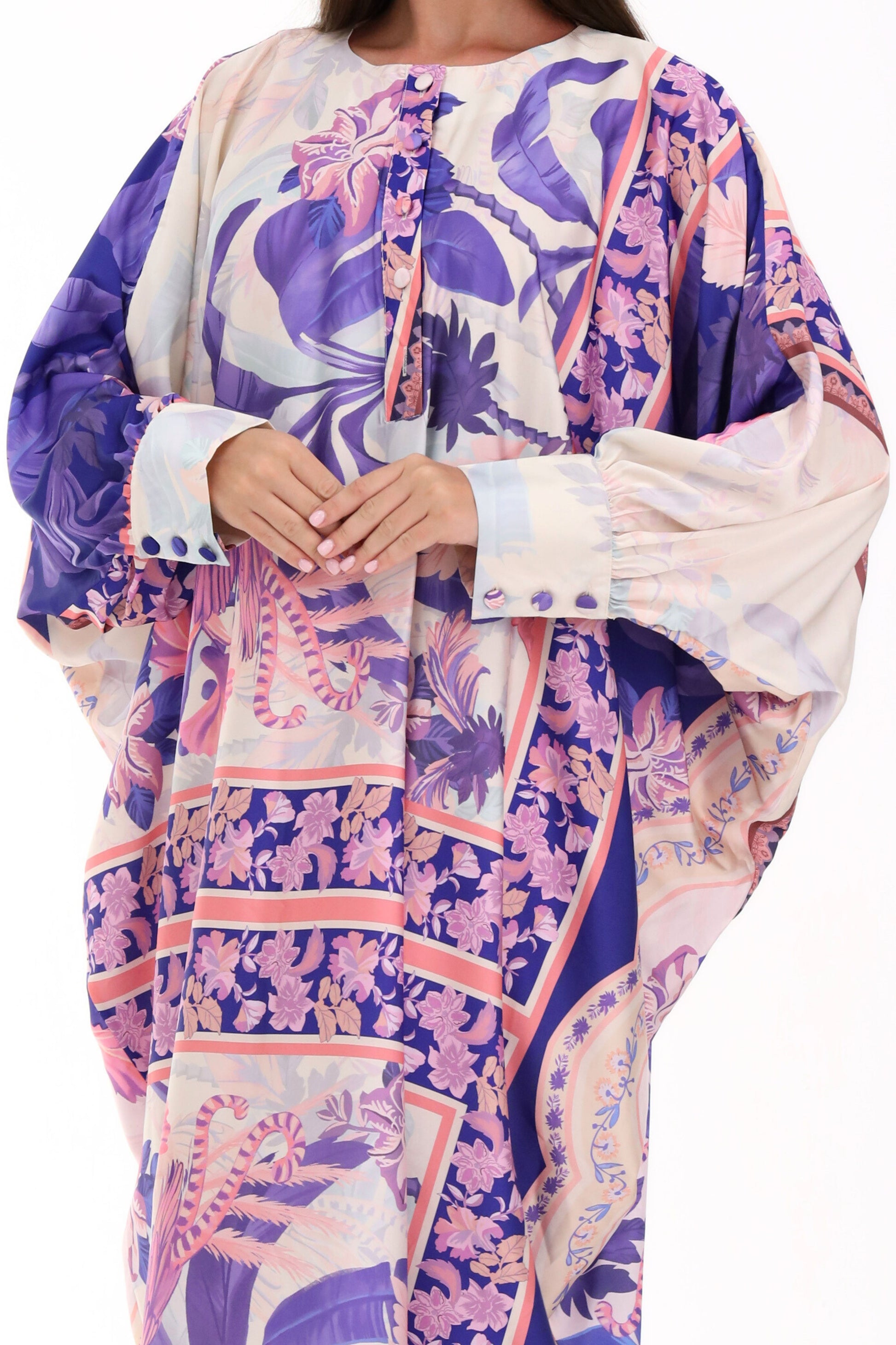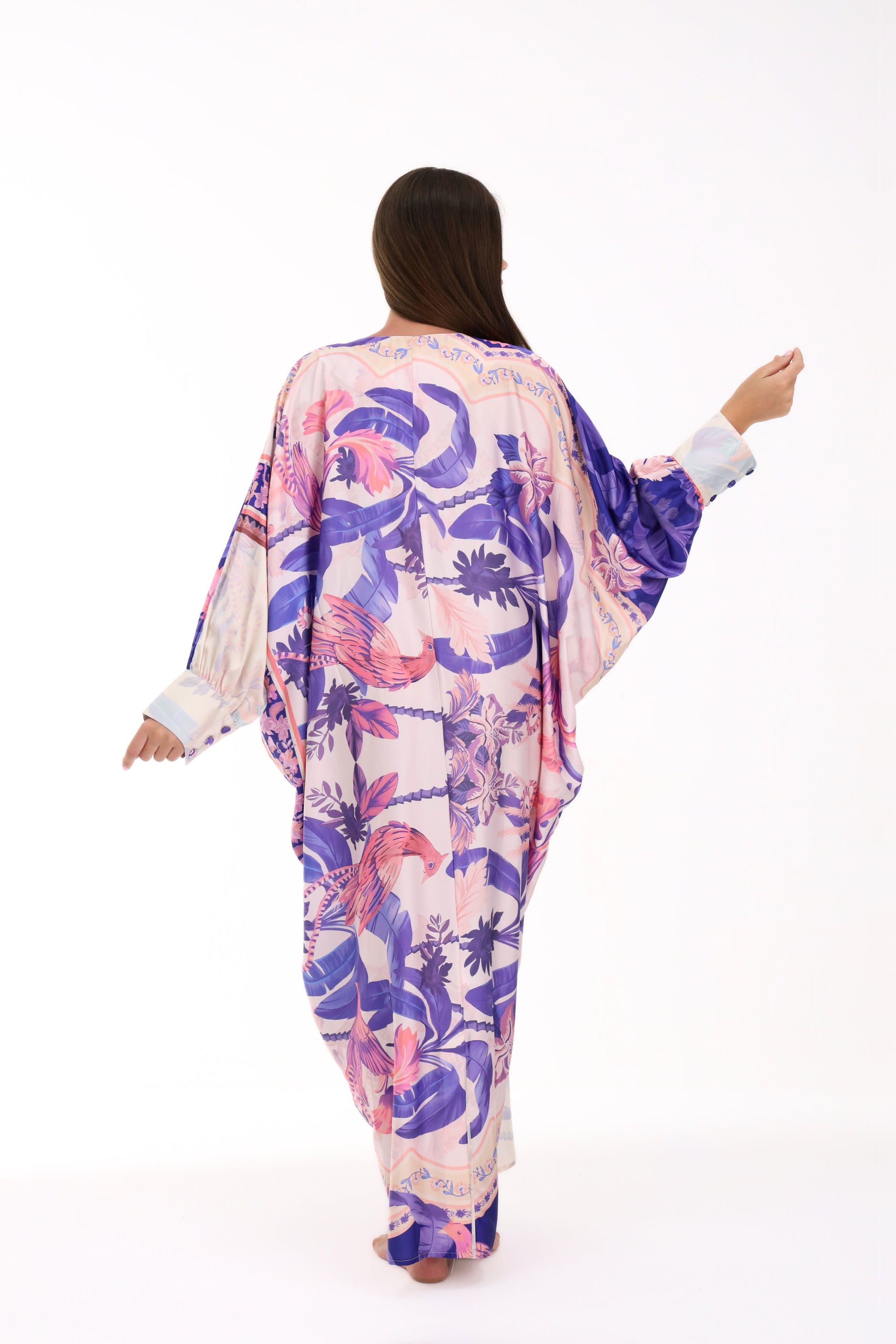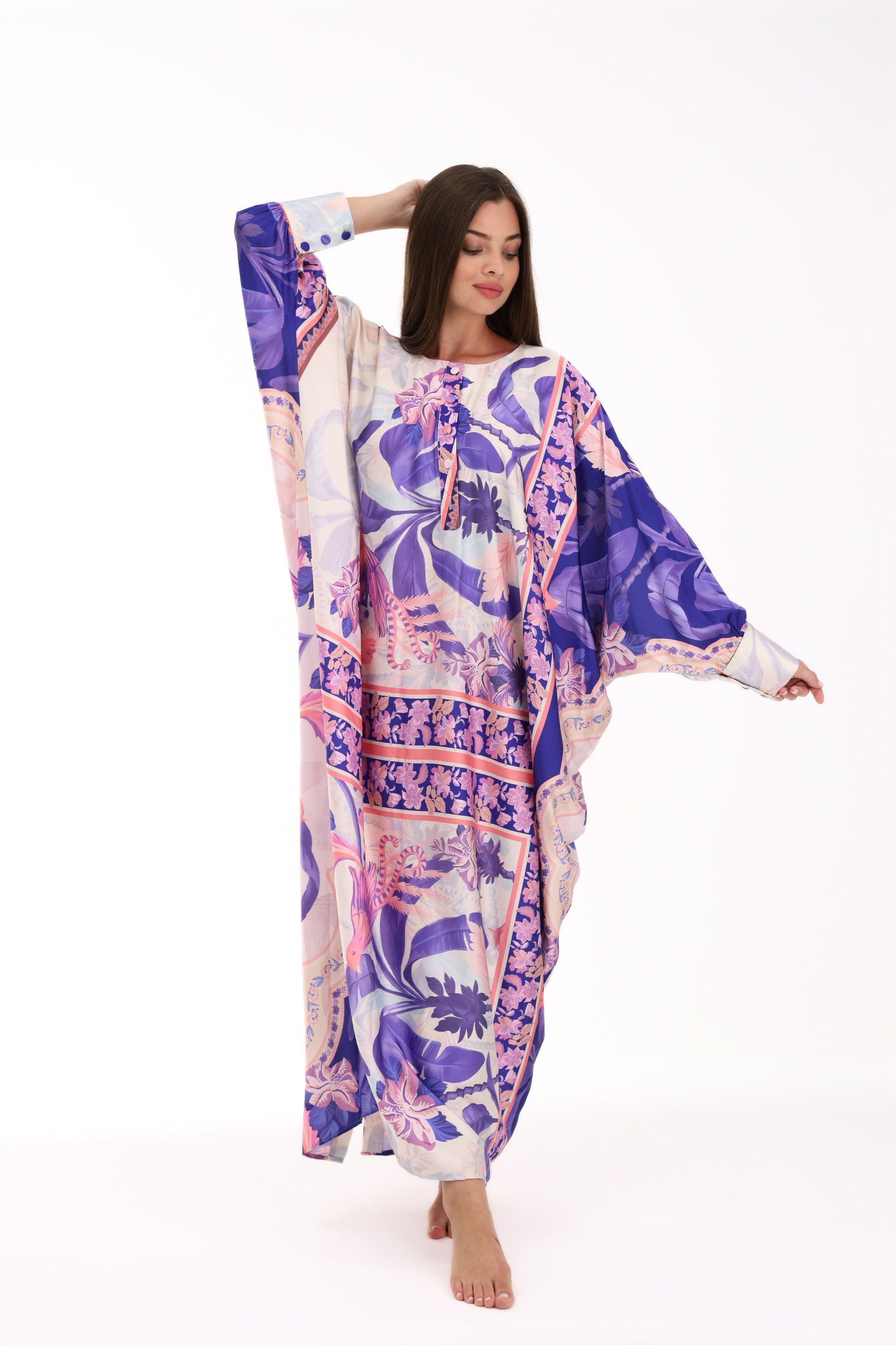 Indulge in full-coverage elegance with the Isabela Amie Paris Traditional Flowers Paradise Green Kaftan. Hand crafted with awe inspiring luxury, this Kaftan is defined by a kaleidoscope of pink and purple poetry with tropical ornate details. This cool and breathable wrinkle-free kaftan is perfect for traveling, the beach or any formal occasion. This gorgeous silk satin reflects light giving it a touch of glamour and buttery soft to the touch, while perfectly fitting your body with its flawless drape. You can style this kaftan with, nude, metallic, purple or pink accessories for a perfectly feminine luxuriously conformable feel and look.
