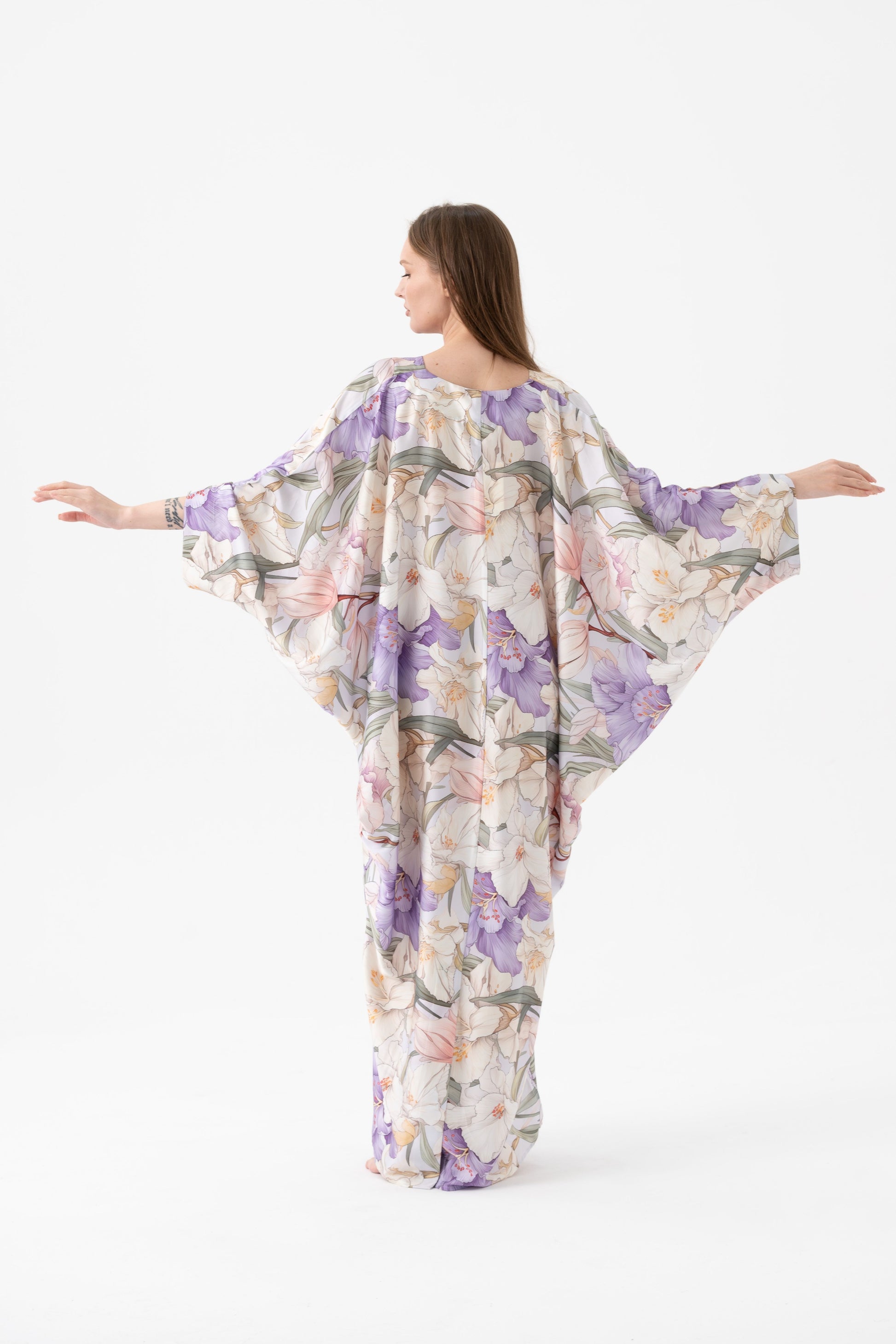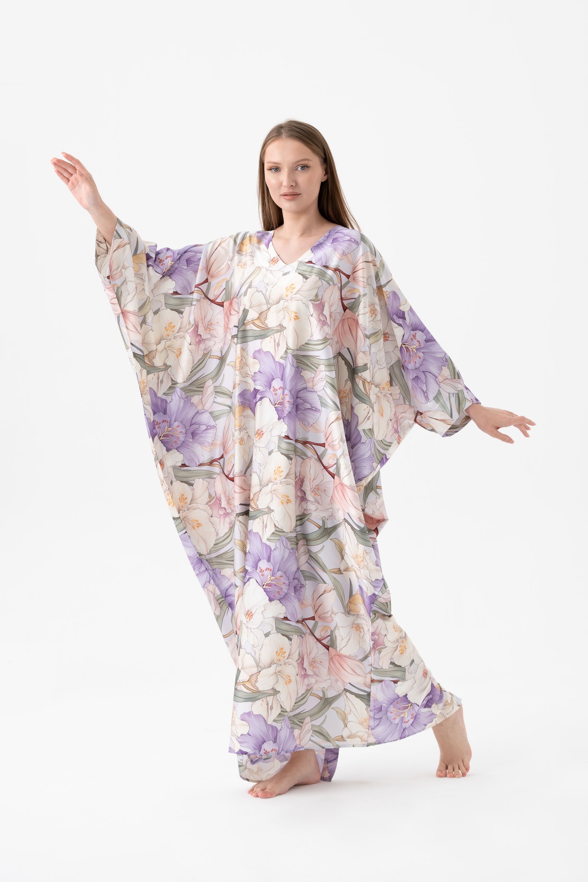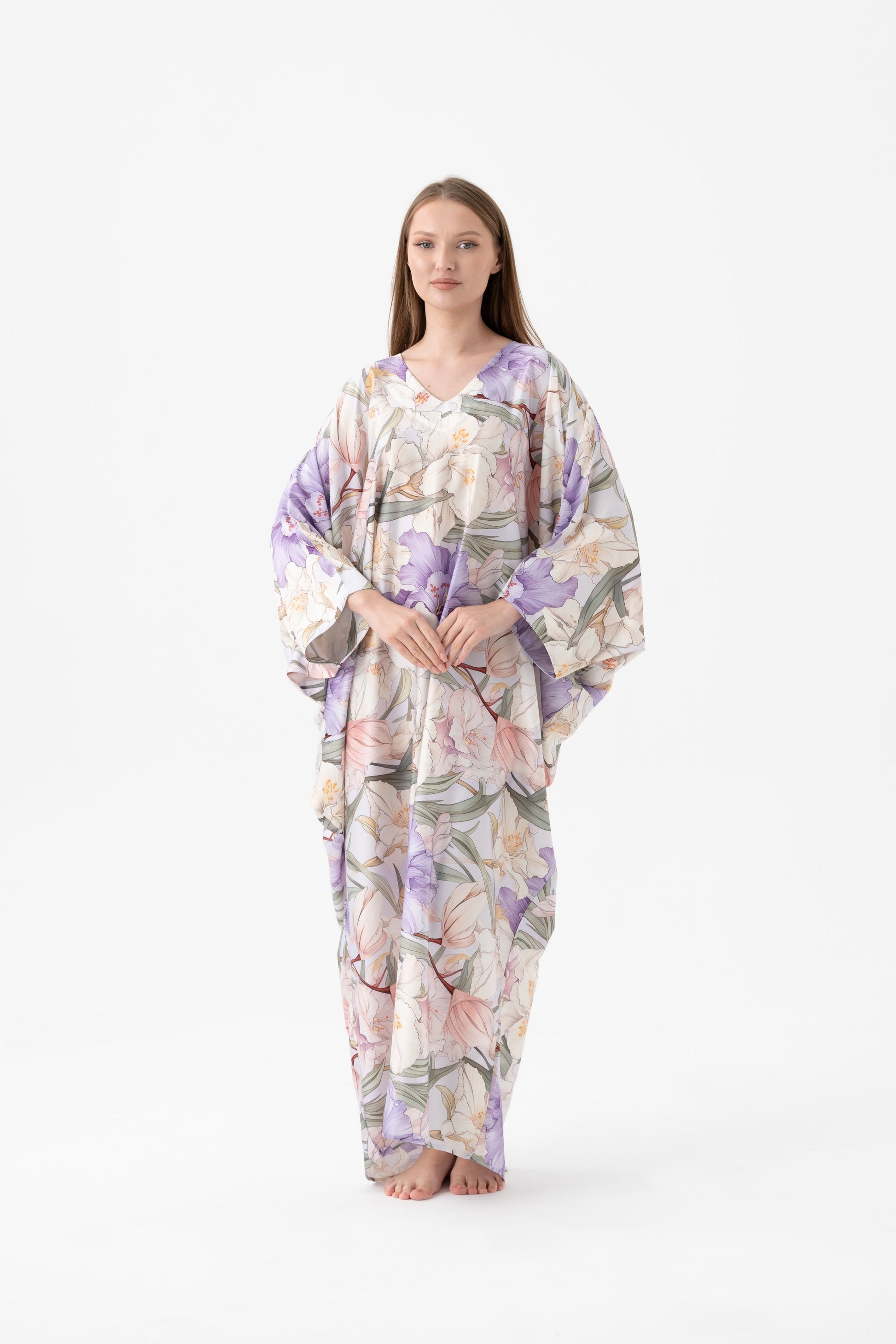 Celebrate modest fashion with the Isabela Amie Paris Modest French Lilies Kaftan. The Lilly is a delicate flower is that recognized by France as symbol of royalty, culture, light, purity and chastity. Whether your plans are to drink tea in a French garden in Paris or champagne on yacht at the French Riviera this kaftan will be sure to suit your body and your lifestyle perfectly. The silk satin drapes beautifully over your body showing a sensual silhouette as you walk by due the satin weaving techniques. The kaftan is hypoallergenic, cool, butterfly soft, elegantly shiny and wrinkle free. You can easily pack it for any trip and style with comfortable sandals or a sexy heel for a more sophisticated look.