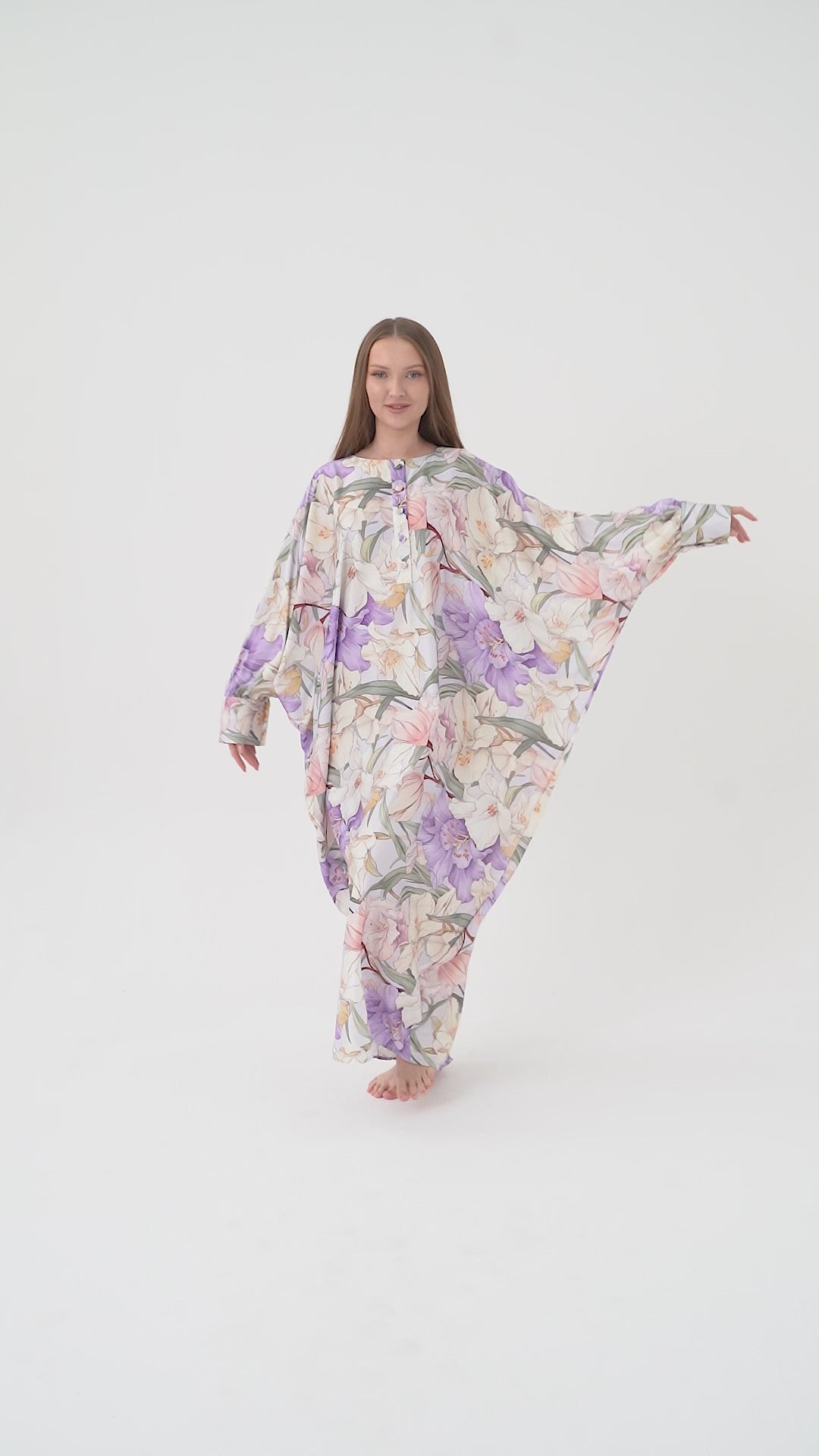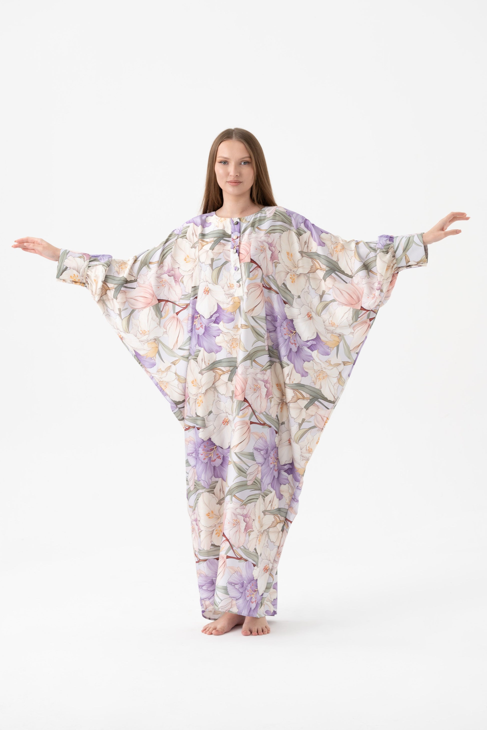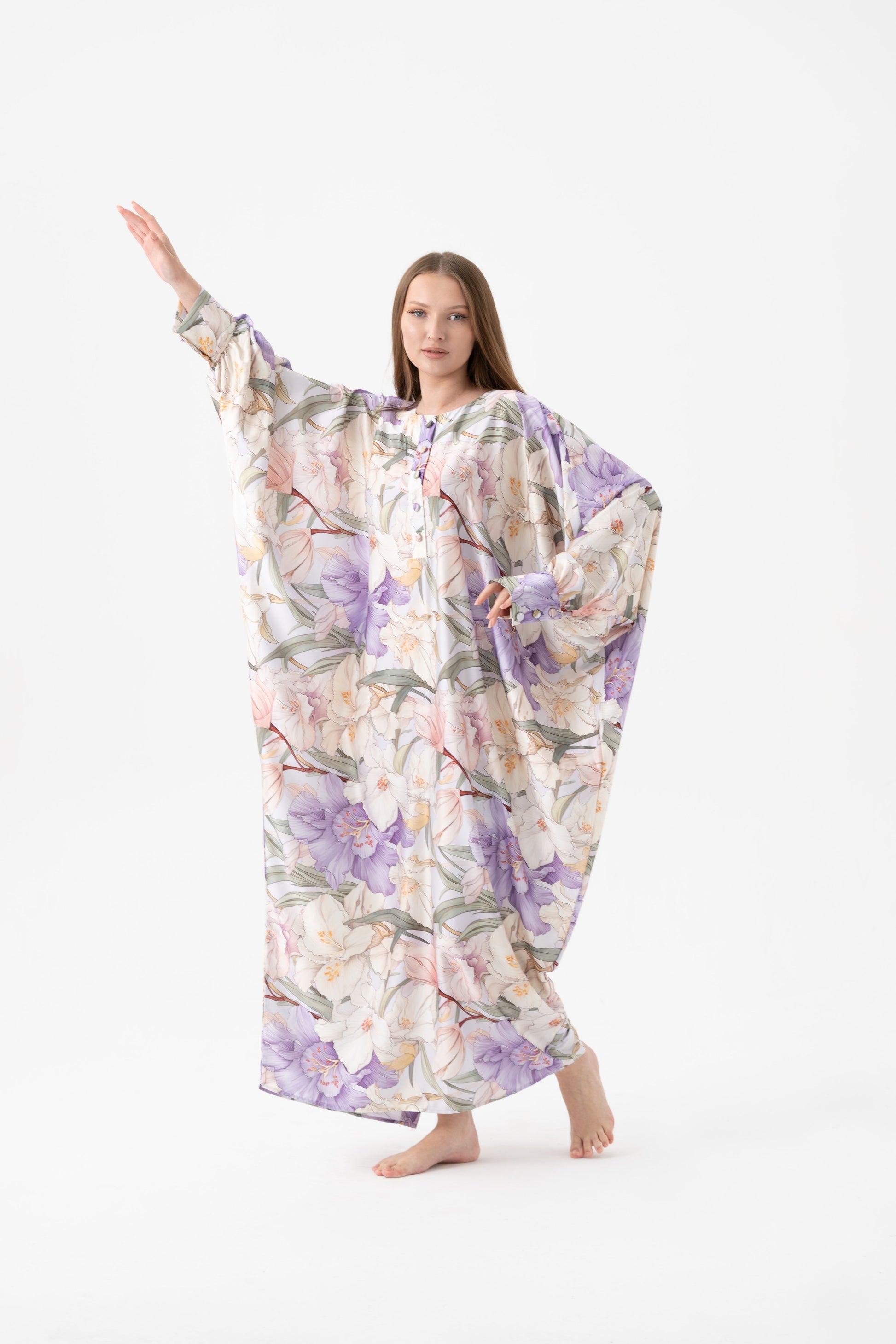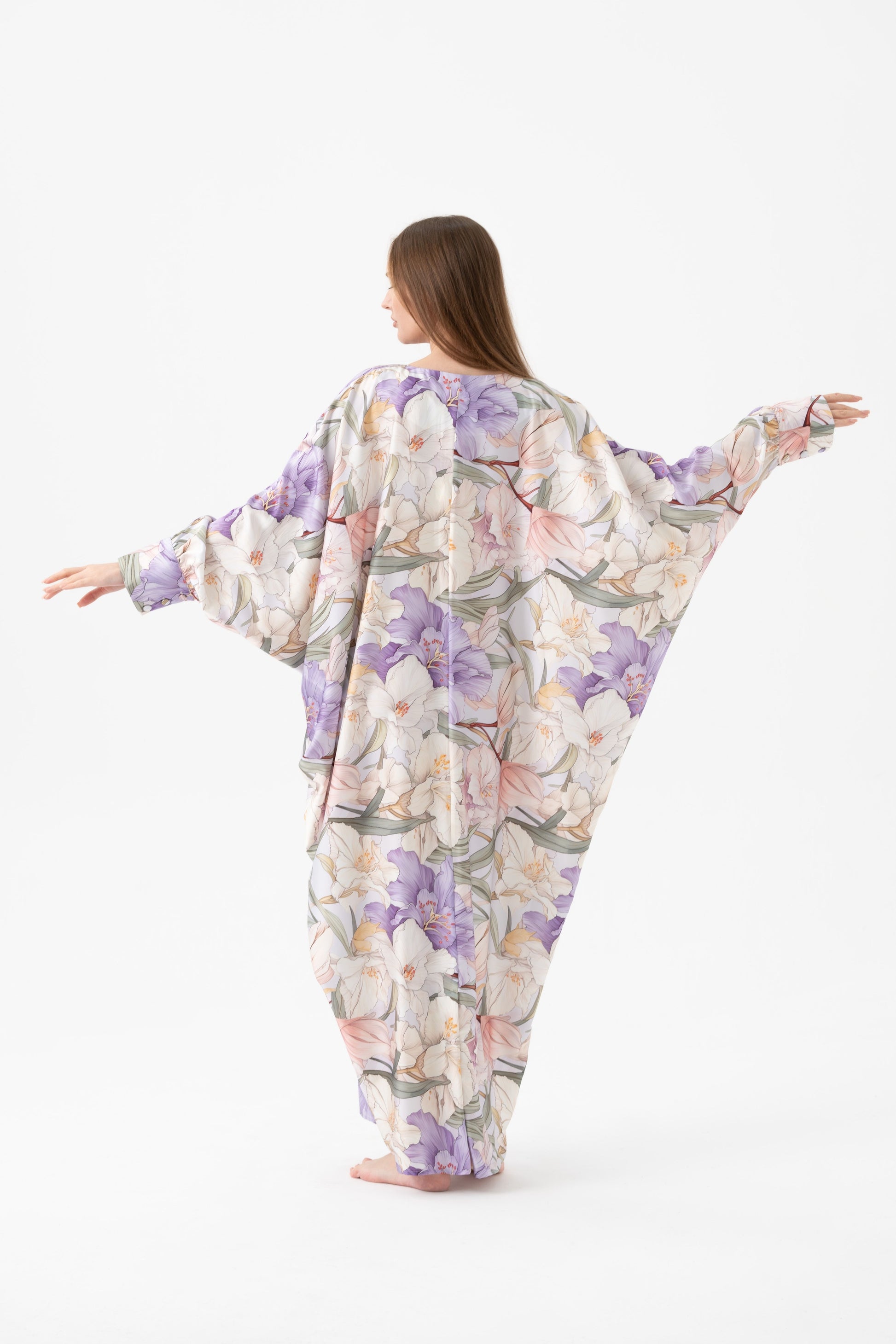Step into full-coverage luxury with the Isabela Amie Paris Traditional French Lilies Kaftan. The Lilly is a delicate flower is that recognized by France as symbol of royalty, culture, light, purity and chastity. Whether your plans are to drink tea in a French garden in Paris or champagne on yacht at the French Riviera this kaftan will be sure to suit your body and your lifestyle perfectly. The silk satin drapes beautifully over your body showing a sensual silhouette as you walk by due the satin weaving techniques. The kaftan is hypoallergenic, cool, butterfly soft, elegantly shiny and wrinkle free. You can easily pack it for any trip and style with comfortable sandals or a sexy heel for a more sophisticated look.