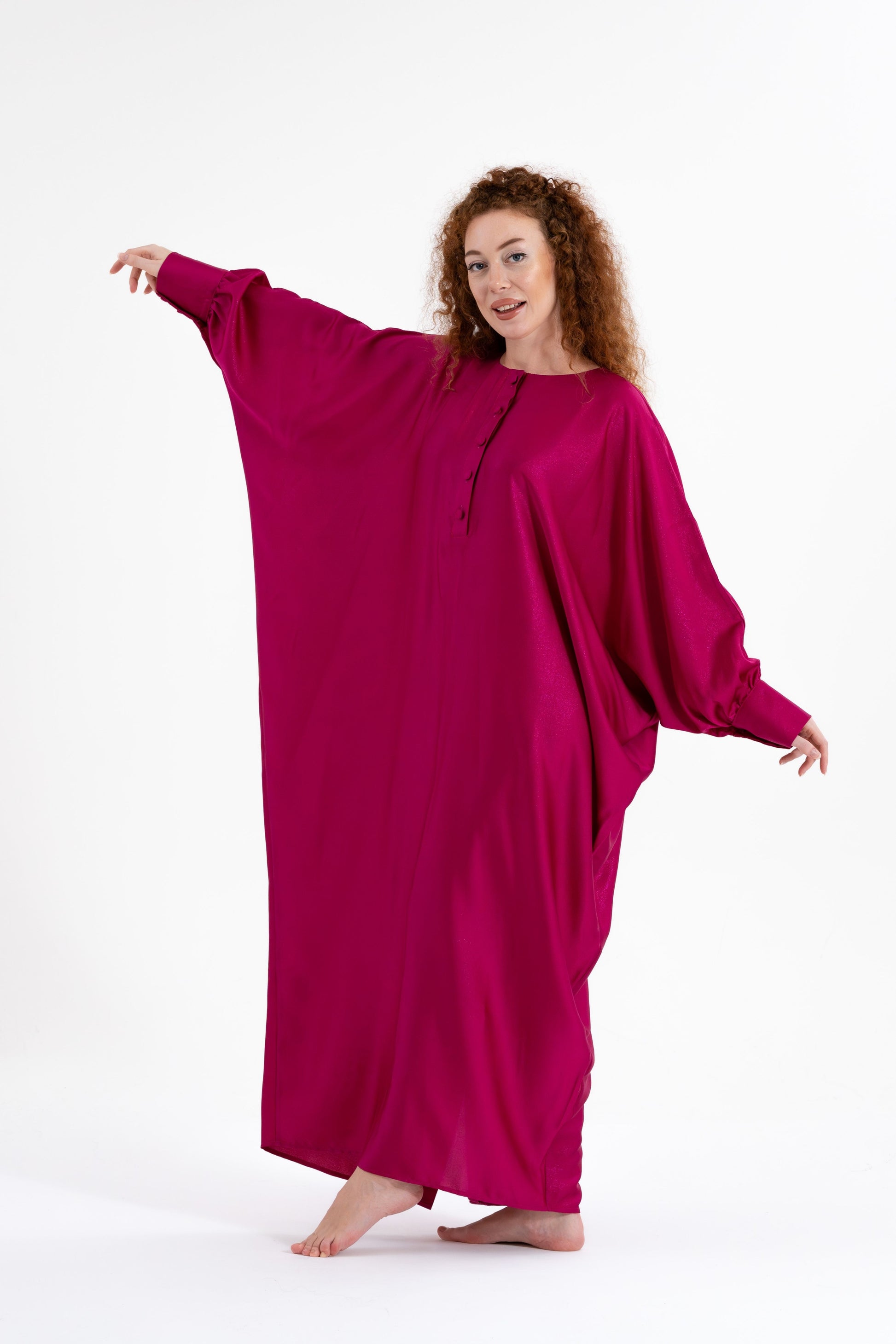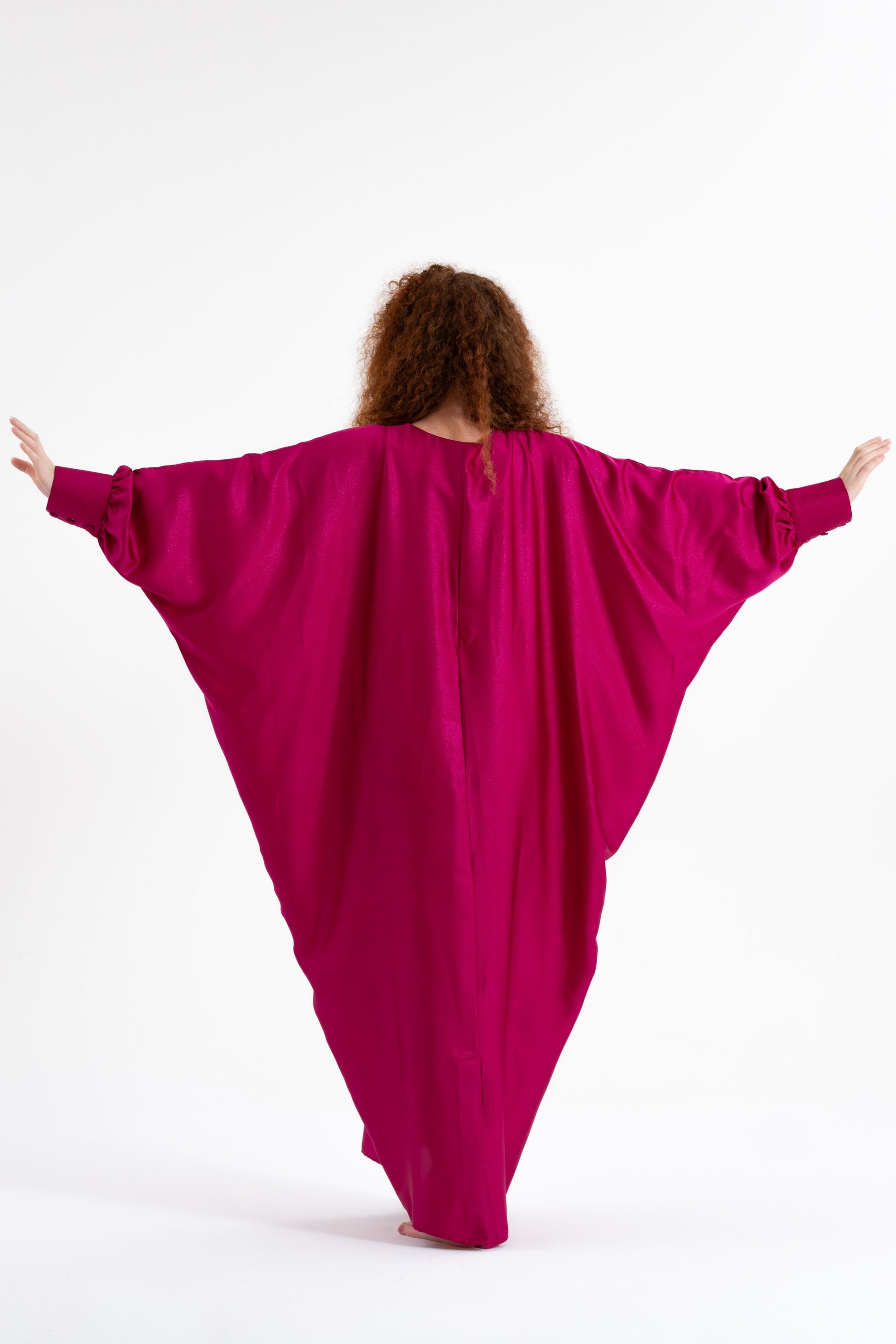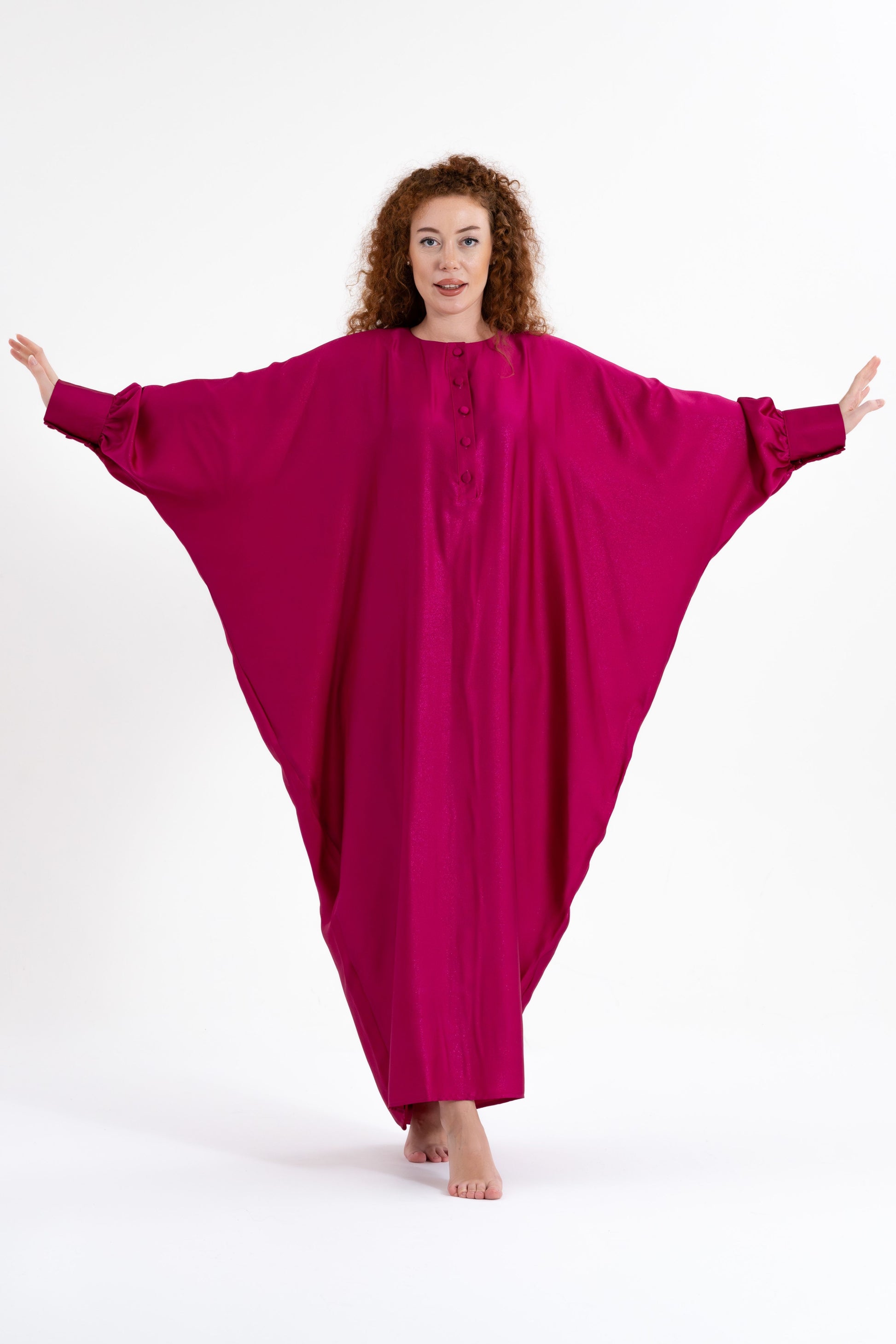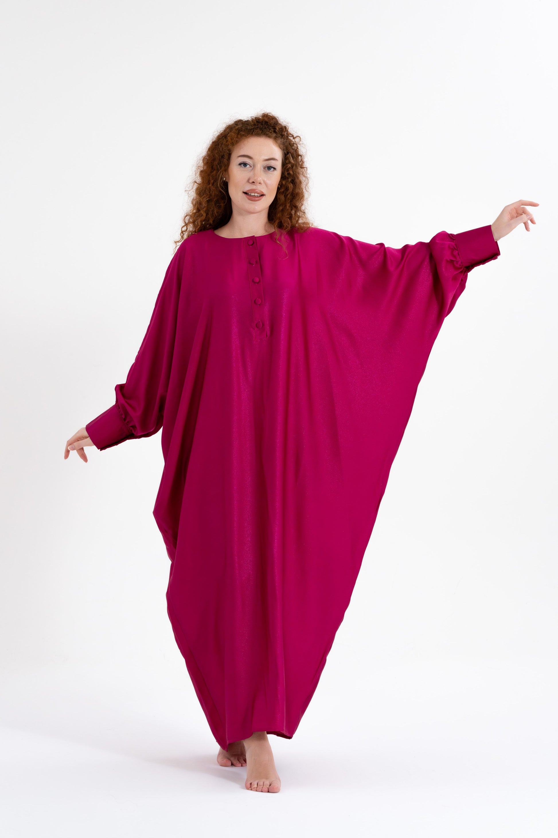 Unveil your boldest self with the Isabela Amie Paris Traditional Fuchsia Glitter Kaftan, where full-coverage elegance meets vibrant energy. The luxurious silk satin fabric, in a striking fuchsia hue, is inspired by the boldness and confidence of the Fuchsia Plant. This kaftan flows gracefully over your silhouette, with tailored sleeves fastened with delicate buttons at the wrists, ensuring a modest yet glamorous look. The glittering finish adds a touch of sparkle, making it perfect for any occasion, from formal events to travel. Style it with silver or metallic accessories to embrace the elegance of traditional fashion with a bold twist.