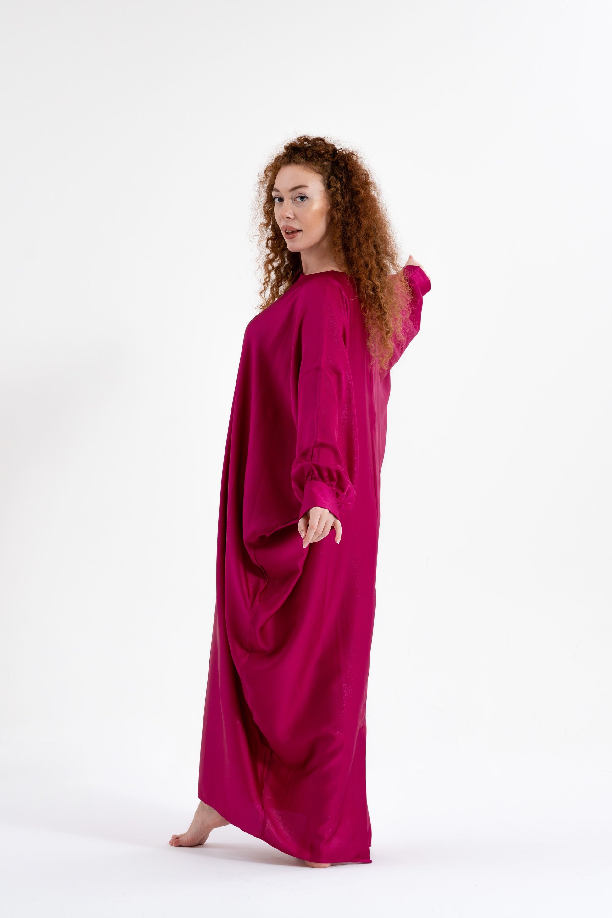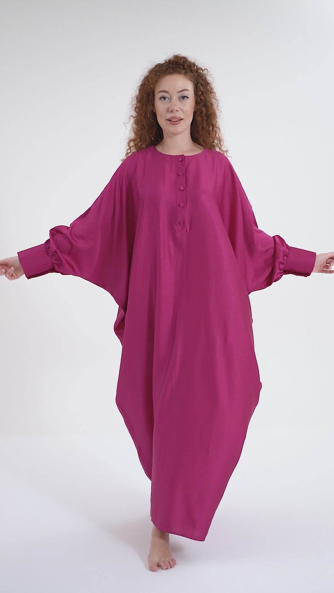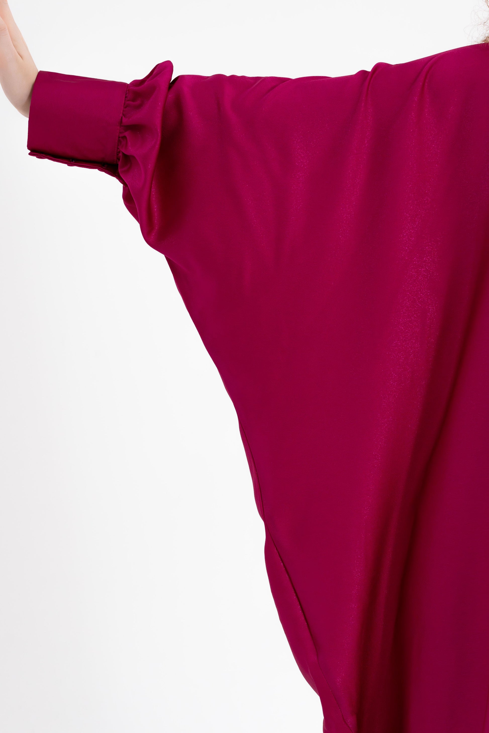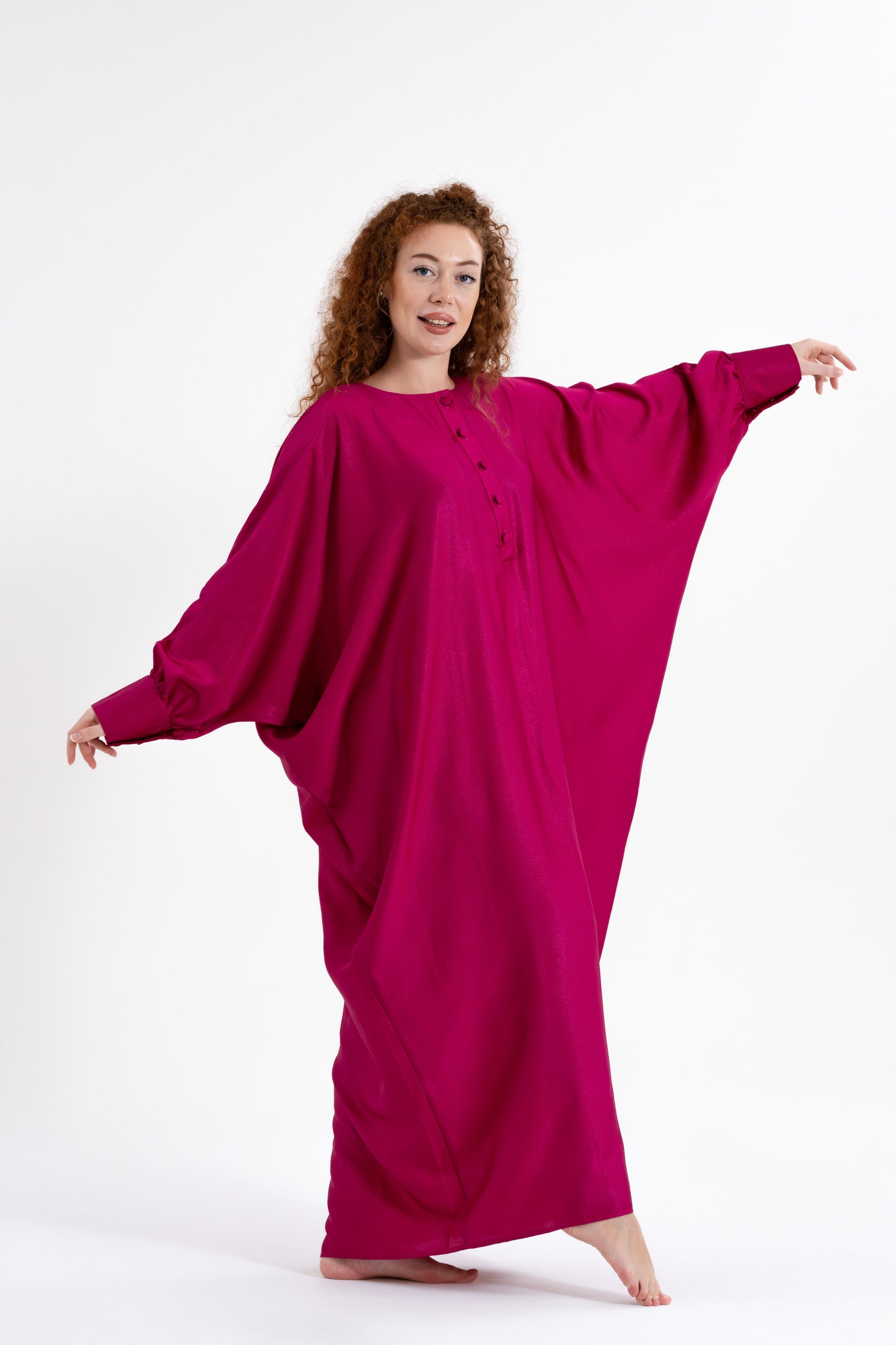 Unveil your boldest self with the Isabela Amie Paris Traditional Fuchsia Glitter Kaftan, where full-coverage elegance meets vibrant energy. The luxurious silk satin fabric, in a striking fuchsia hue, is inspired by the boldness and confidence of the Fuchsia Plant. This kaftan flows gracefully over your silhouette, with tailored sleeves fastened with delicate buttons at the wrists, ensuring a modest yet glamorous look. The glittering finish adds a touch of sparkle, making it perfect for any occasion, from formal events to travel. Style it with silver or metallic accessories to embrace the elegance of traditional fashion with a bold twist.