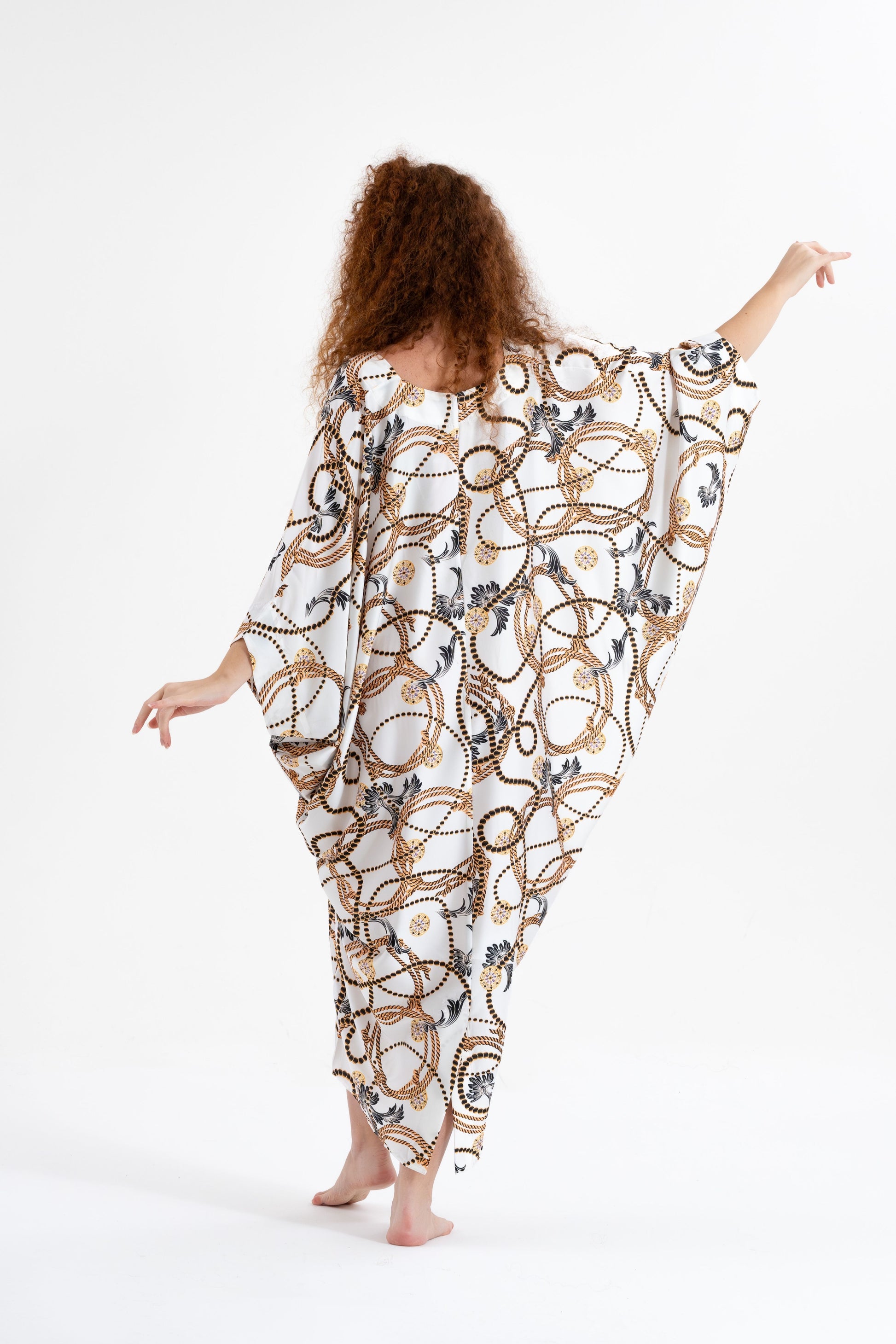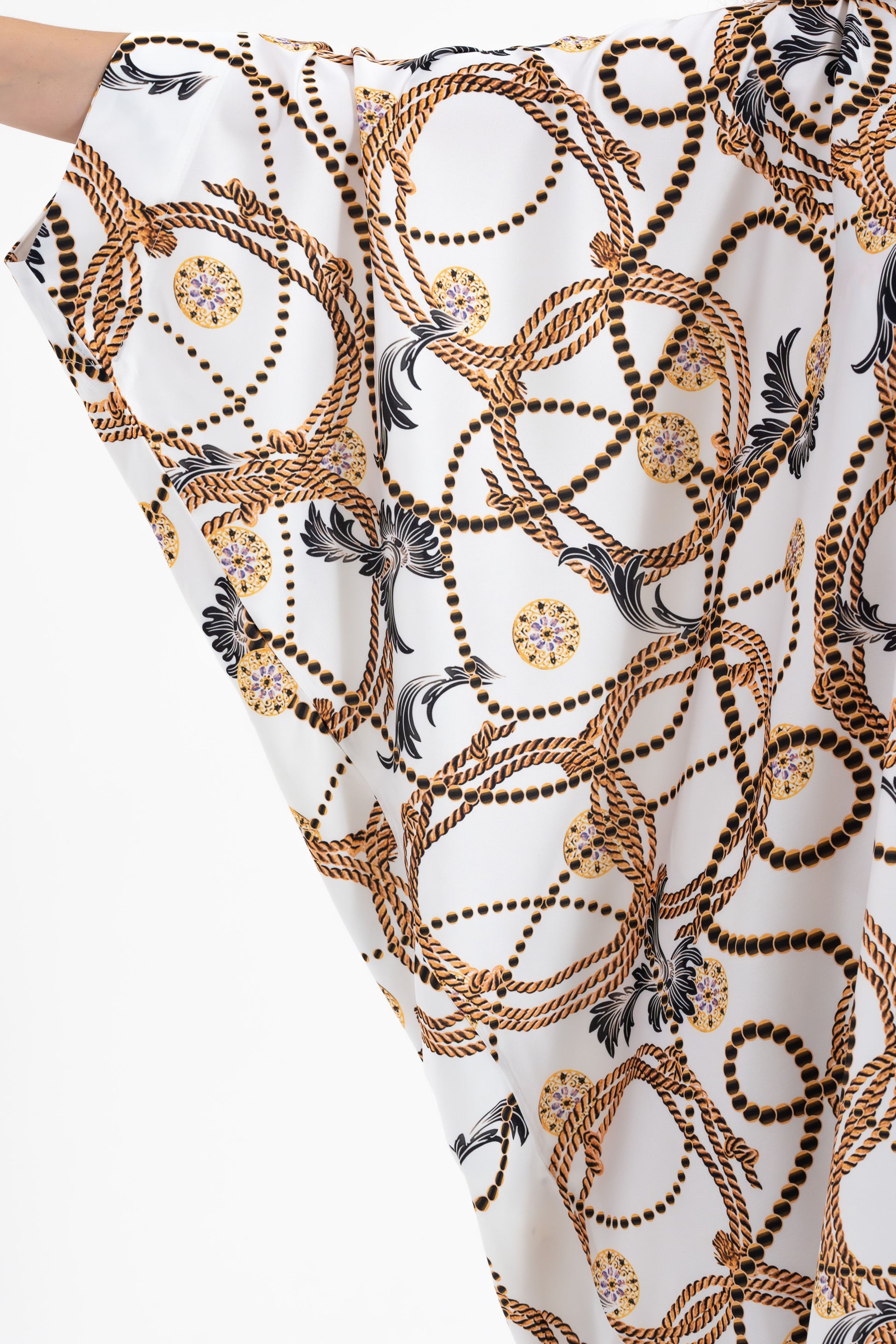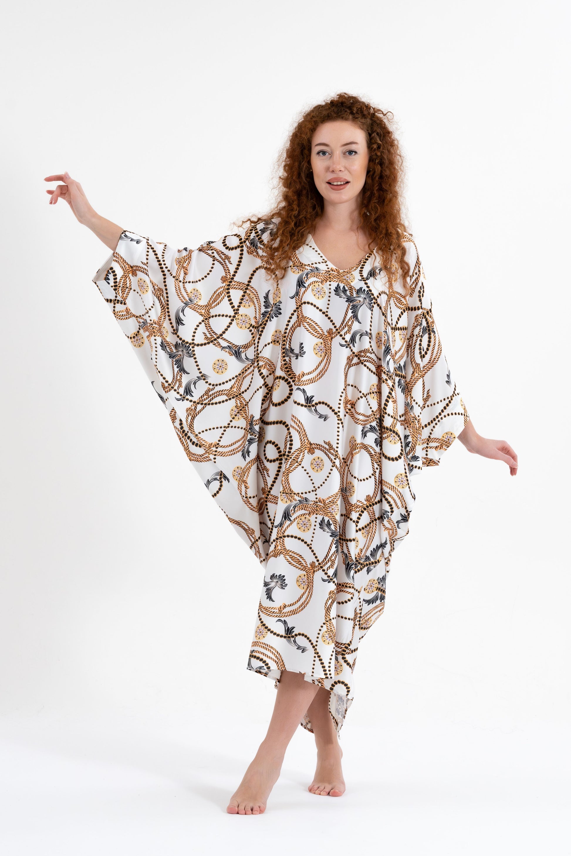 Allow the world to revolve around you in this glamorous European vintage vibe silk satin kaftan. The exquisite Isabela Amie Paris design and craftsmanship is detailed with a knotted rope design and royal tassel accents. This lustrous light reflecting silk stain gives a rich buttery touch and a masterful full bunce drape detail and shine stemming from the satin weaving technique. This silky, cool, and good for the skin kaftan is perfect for any occasion and setting. You can style it endlessly with any color including gold, nude and dark earth tones, and a touch of lavender purple.