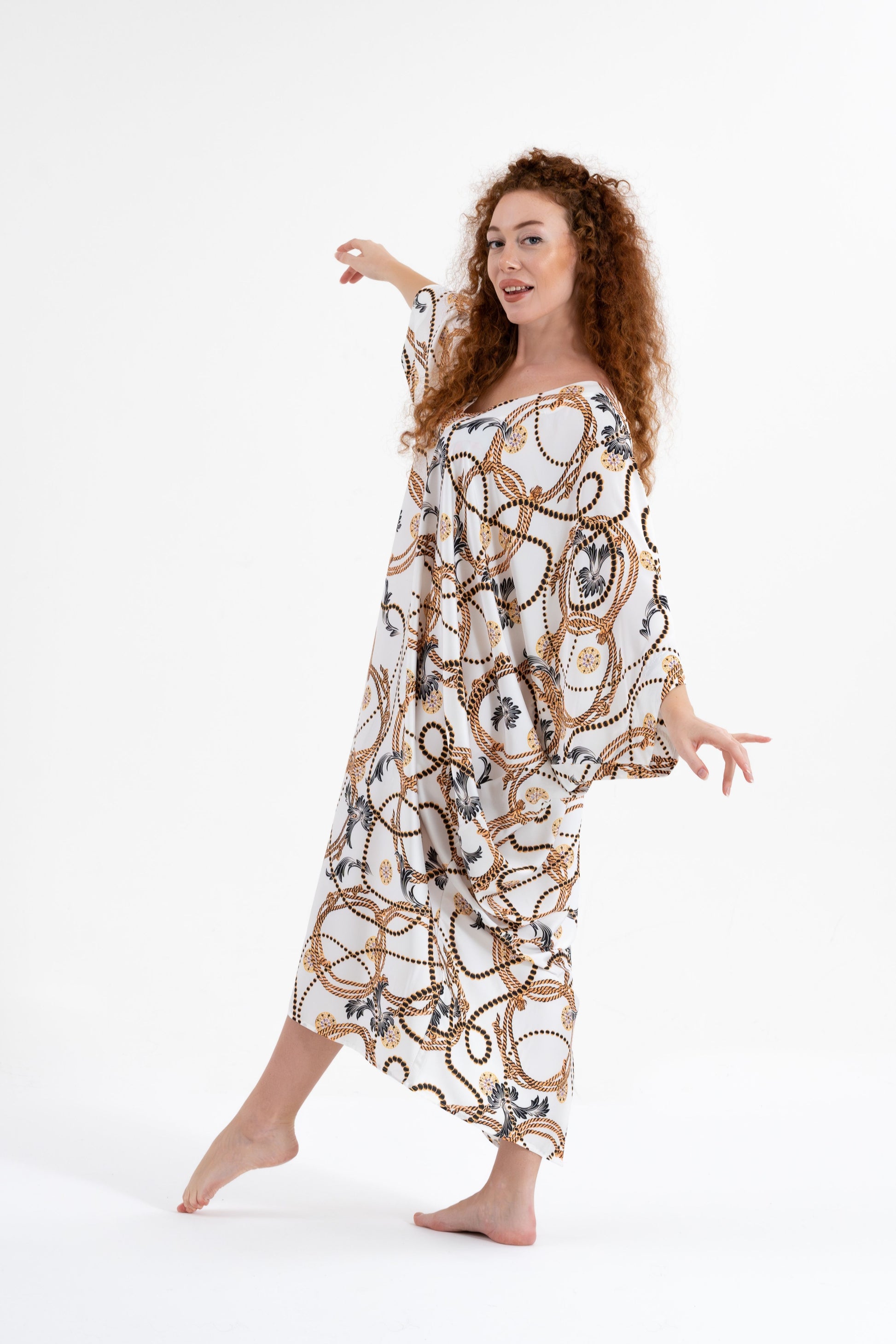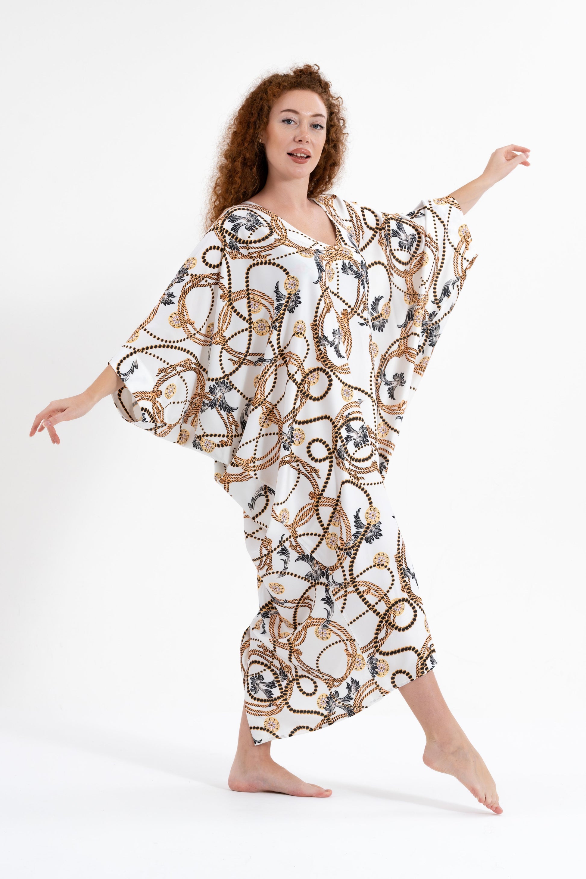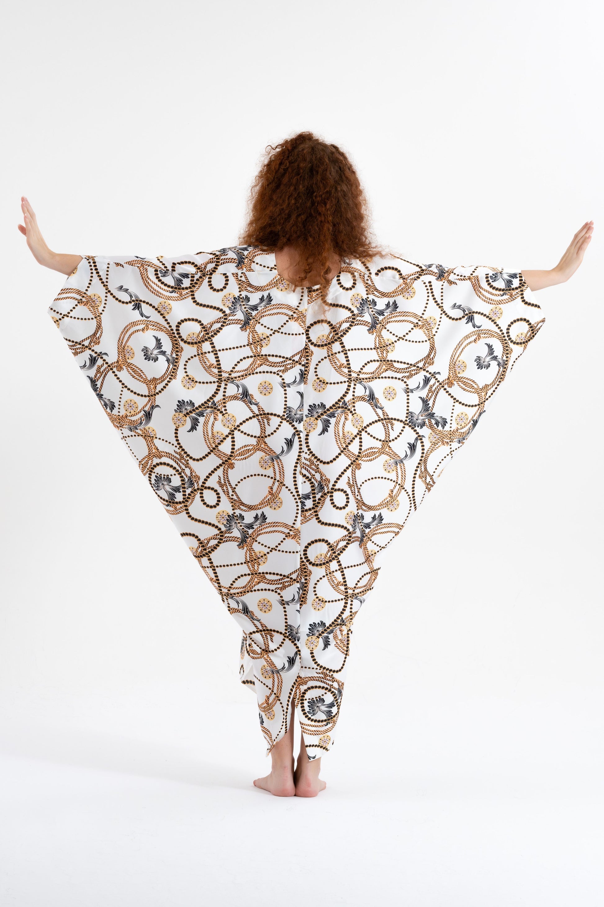 Allow the world to revolve around you in this glamorous European vintage vibe silk satin kaftan. The exquisite Isabela Amie Paris design and craftsmanship is detailed with a knotted rope design and royal tassel accents. This lustrous light reflecting silk stain gives a rich buttery touch and a masterful full bunce drape detail and shine stemming from the satin weaving technique. This silky, cool, and good for the skin kaftan is perfect for any occasion and setting. You can style it endlessly with any color including gold, nude and dark earth tones, and a touch of lavender purple.