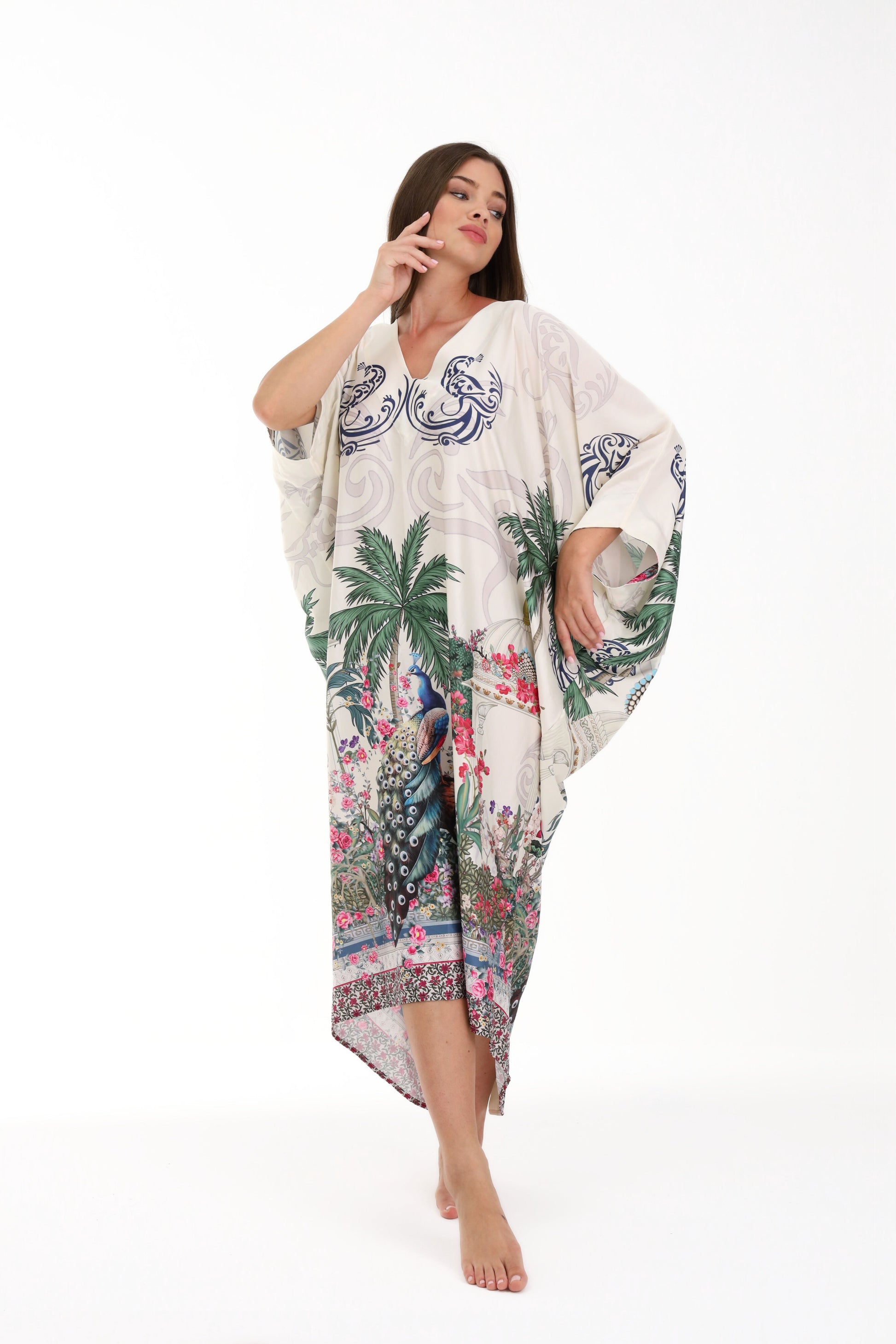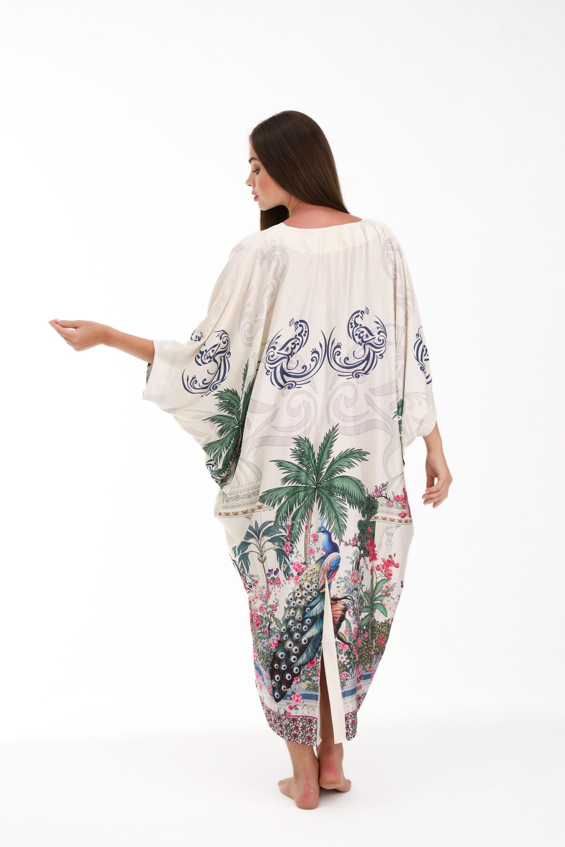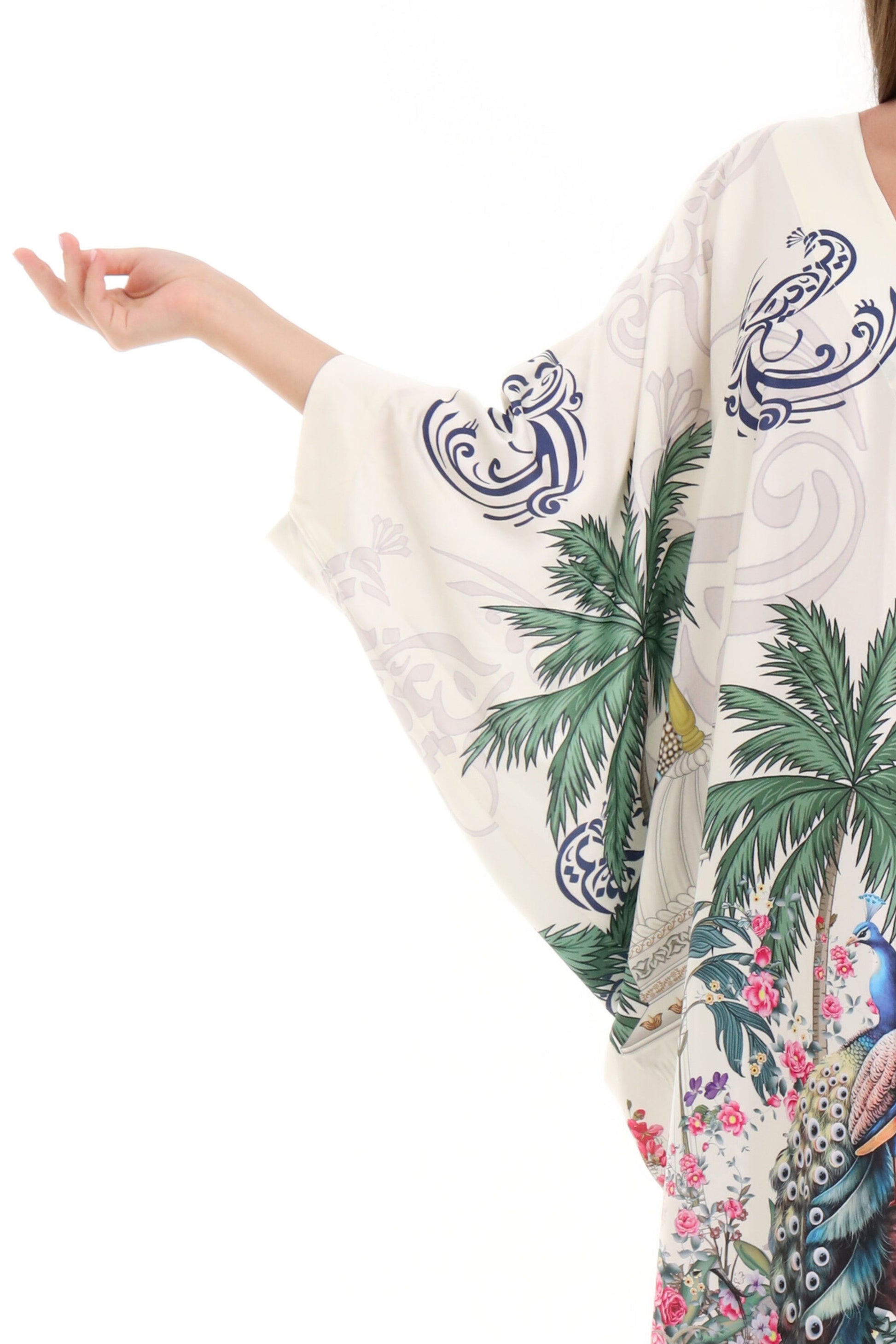 Discover the essence of timeless elegance with the Isabela Amie Paris "Ottoman Heritage" Kaftan, a masterpiece that blends traditional Turkish artistry with contemporary sophistication. Crafted from premium cream silk, this kaftan features exquisite handcrafted prints paying homage to iconic Ottoman symbols: elegant palm trees, a majestic peacock, and the emblematic silhouette of a Turkish temple. Every detail evokes the grandeur of an empire, designed for the woman who graces luxury resorts and private beaches with equal distinction.