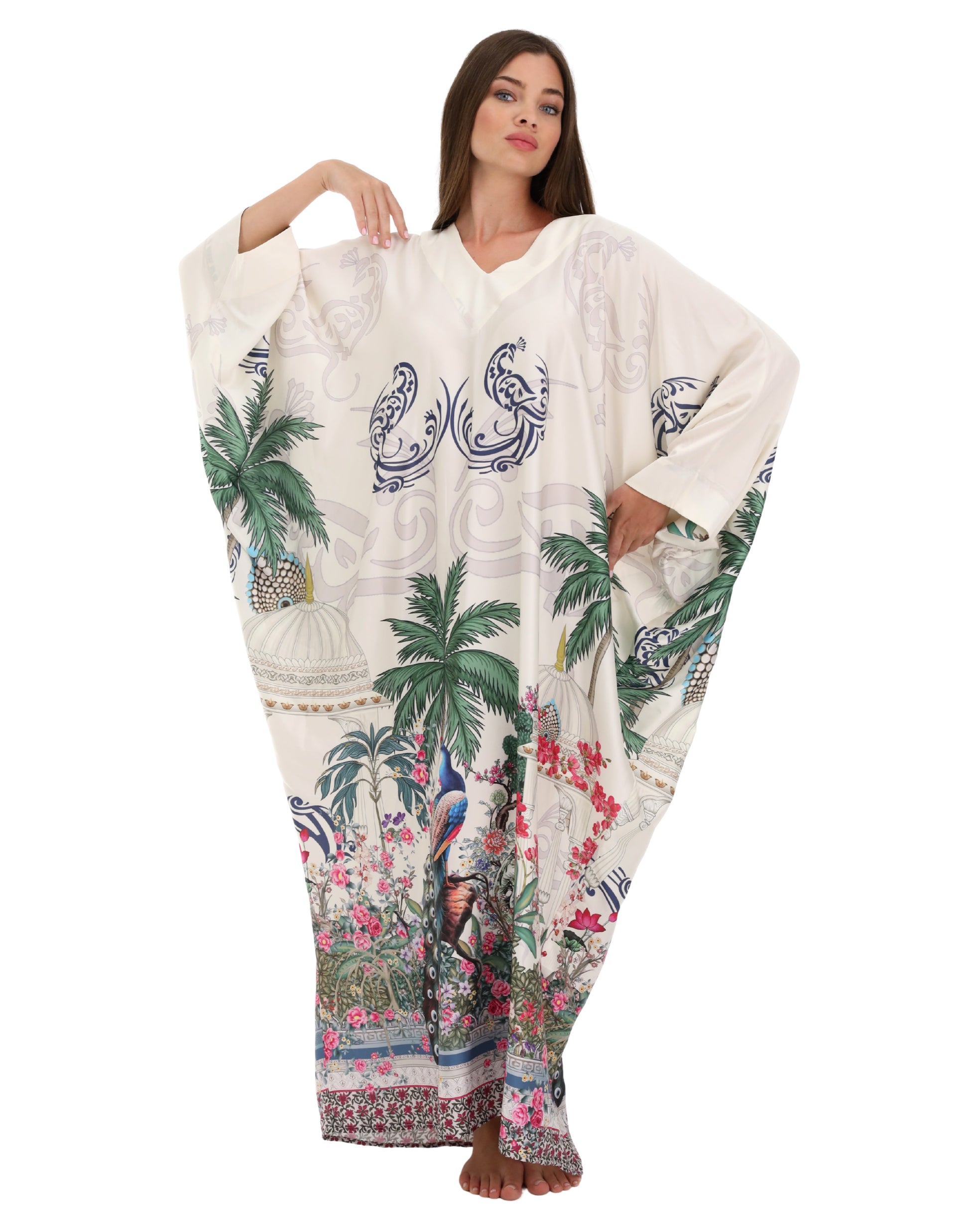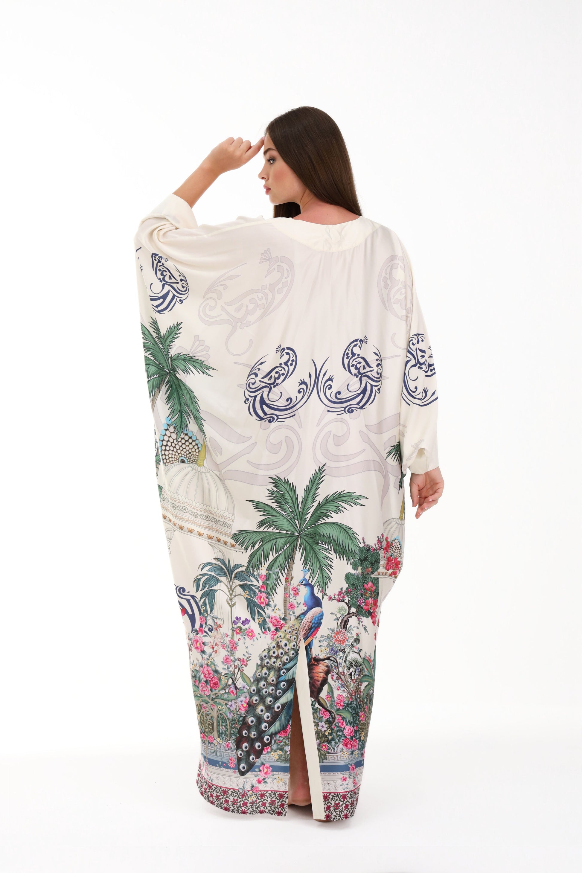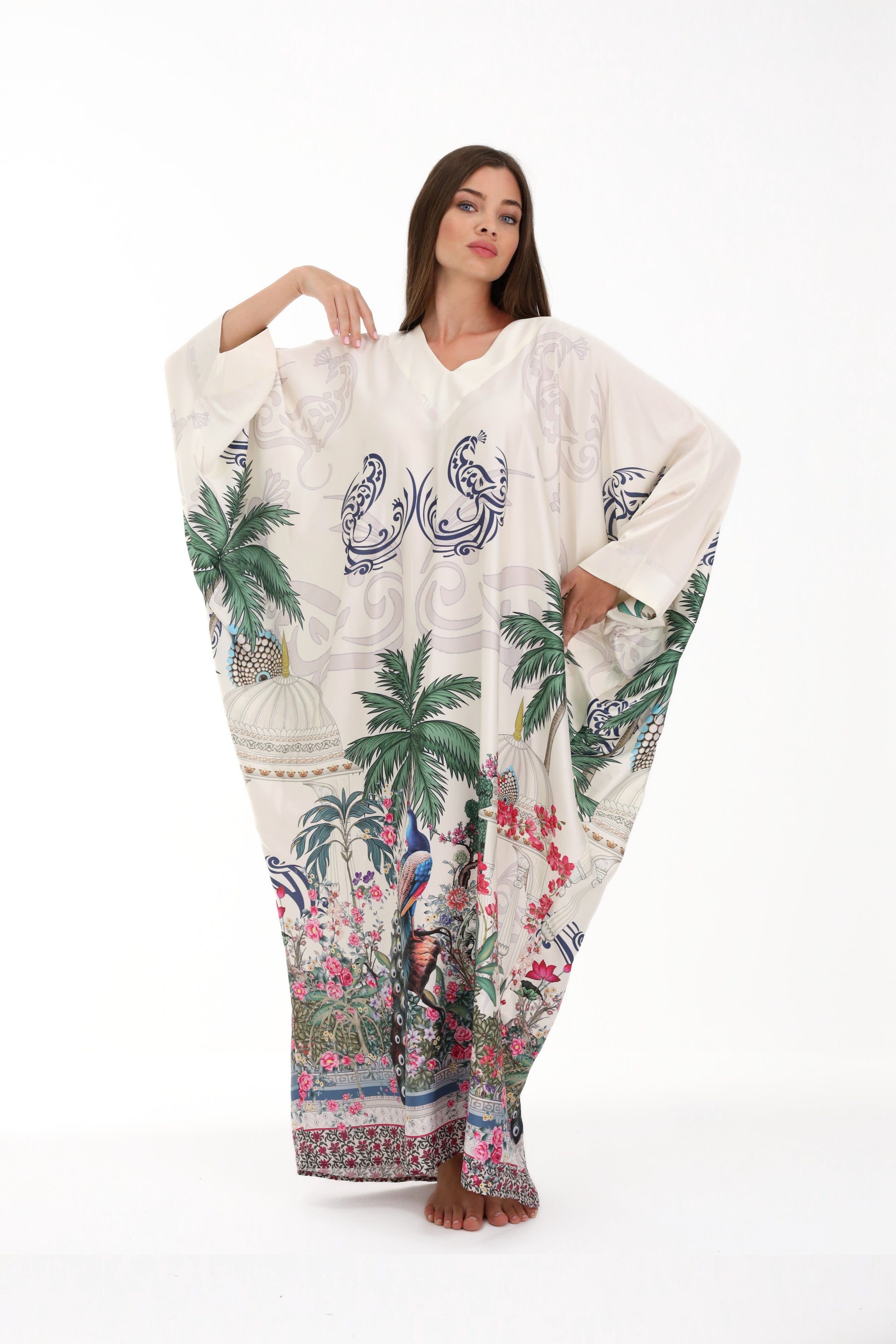Discover the essence of timeless elegance with the Isabela Amie Paris "Ottoman Heritage" Kaftan, a masterpiece that blends traditional Turkish artistry with contemporary sophistication. Crafted from premium cream silk, this kaftan features exquisite handcrafted prints paying homage to iconic Ottoman symbols: elegant palm trees, a majestic peacock, and the emblematic silhouette of a Turkish temple. Every detail evokes the grandeur of an empire, designed for the woman who graces luxury resorts and private beaches with equal distinction.