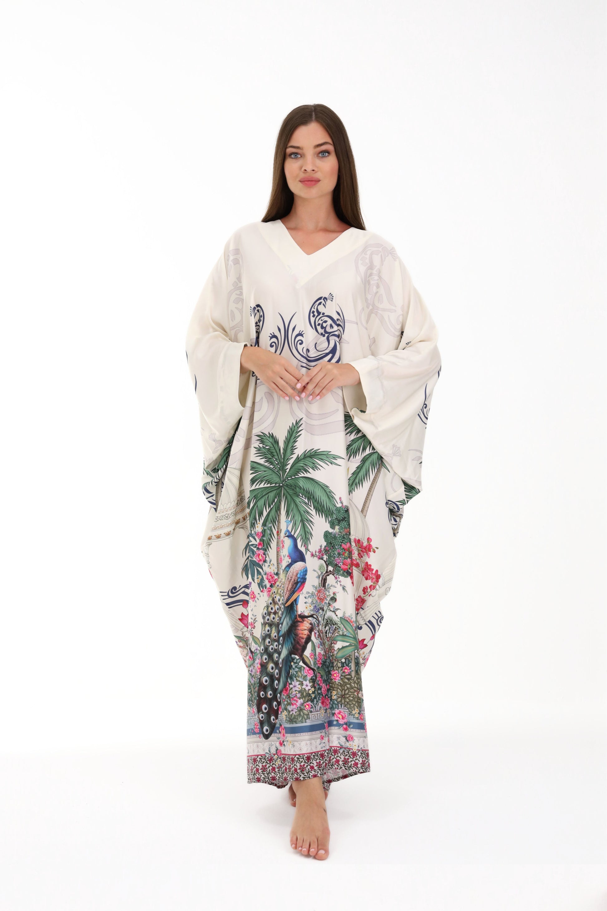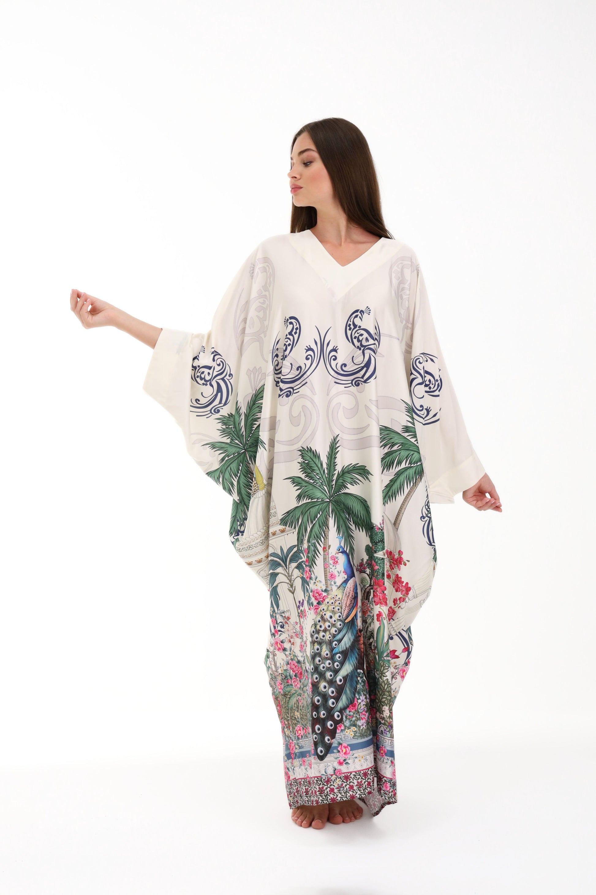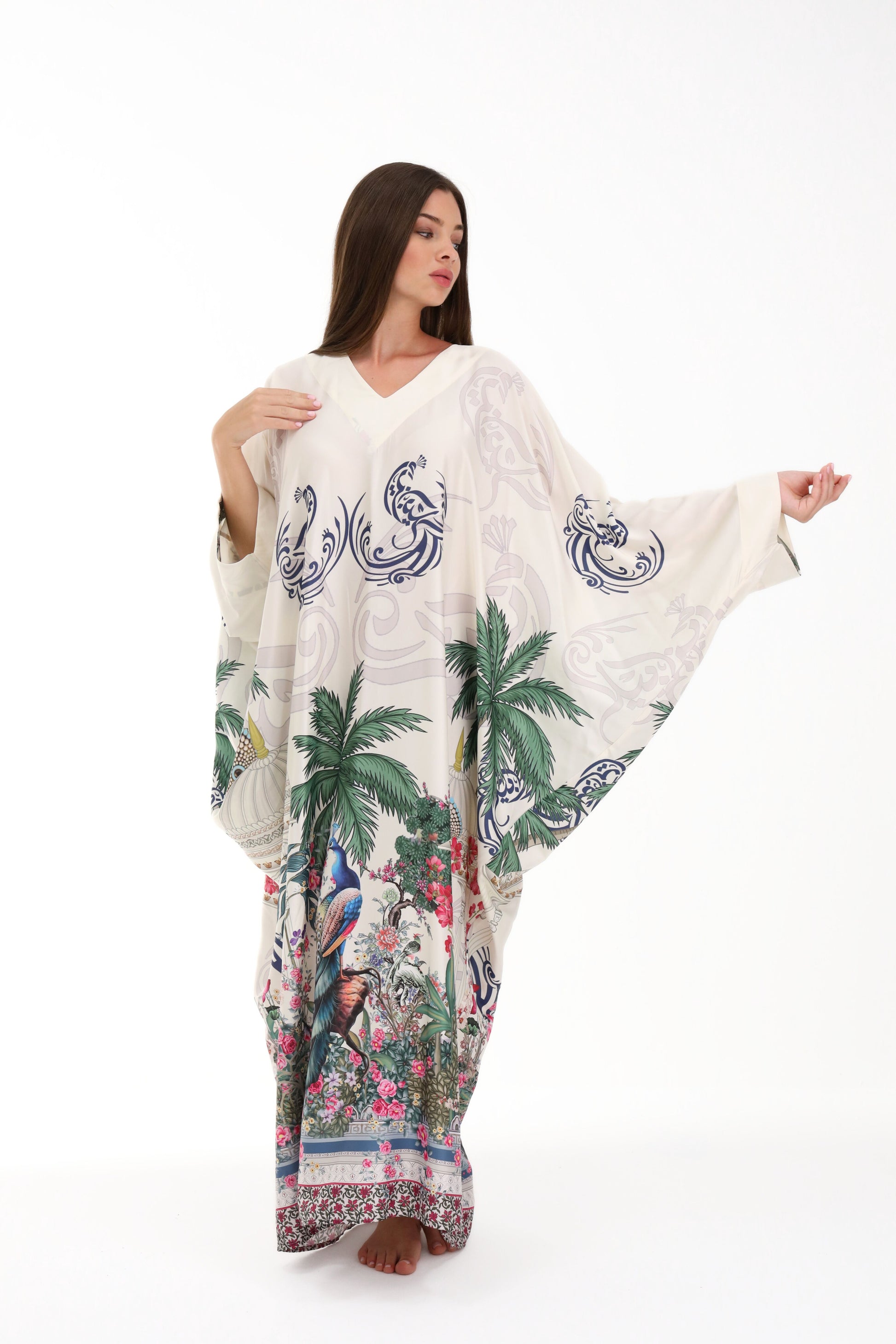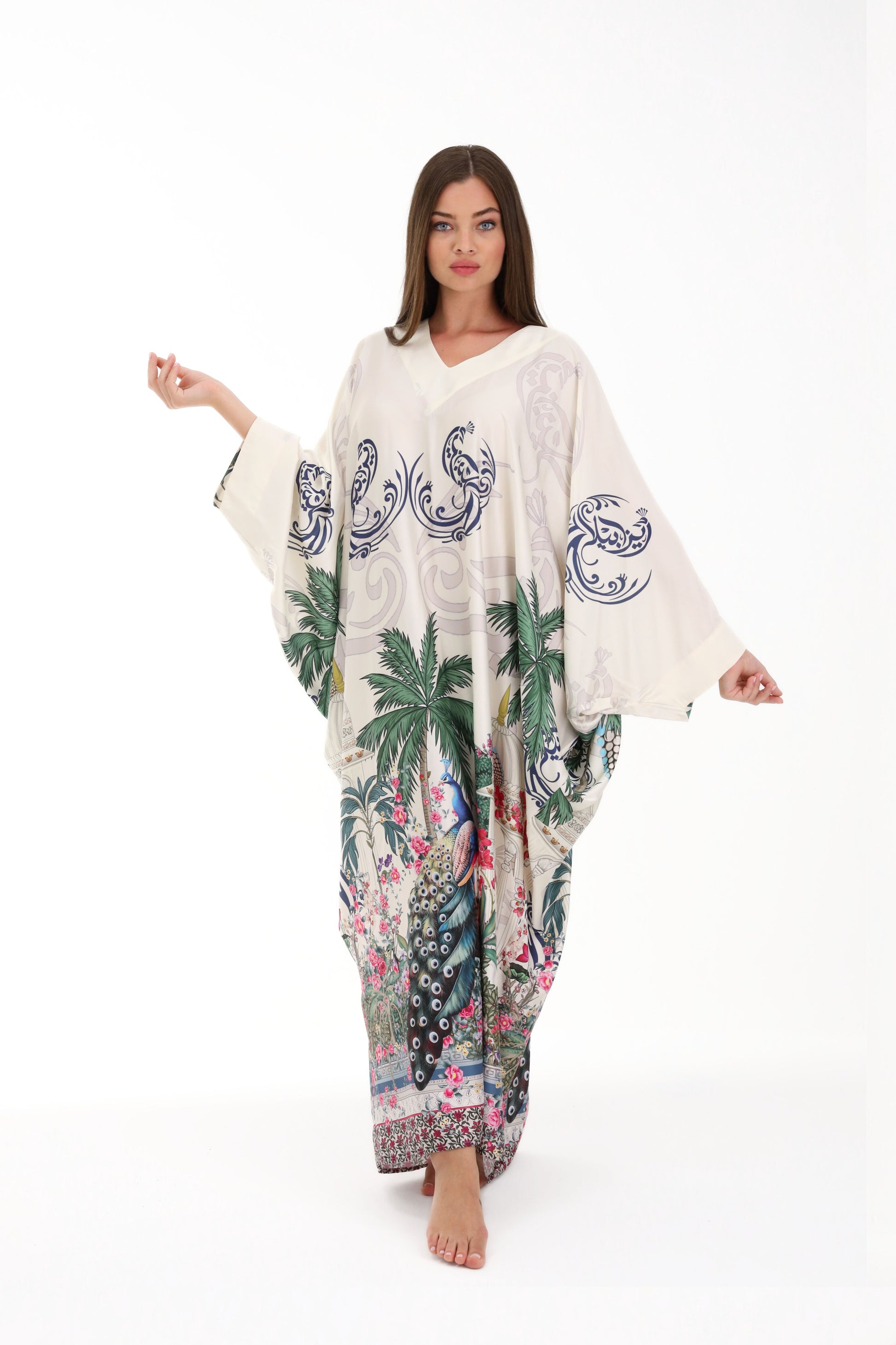 Discover the essence of timeless elegance with the Isabela Amie Paris "Ottoman Heritage" Kaftan, a masterpiece that blends traditional Turkish artistry with contemporary sophistication. Crafted from premium cream silk, this kaftan features exquisite handcrafted prints paying homage to iconic Ottoman symbols: elegant palm trees, a majestic peacock, and the emblematic silhouette of a Turkish temple. Every detail evokes the grandeur of an empire, designed for the woman who graces luxury resorts and private beaches with equal distinction.