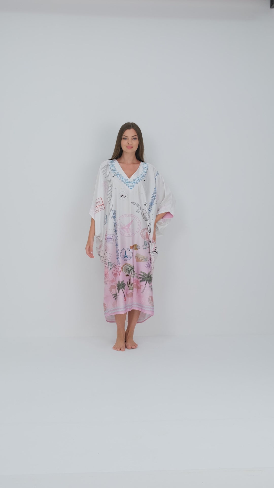 Isabela Amie Paris Jetsetter's Diary Modern Kaftan Where Wanderlust Meets Timeless Glamour Embrace the art of effortless sophistication with the Isabela Amie Paris Jetsetter's Diary Kaftan, a masterpiece designed for the modern globetrotter. Crafted from lustrous silk satin, this kaftan drapes romantically over your silhouette, offering a slimming yet sensual fit that commands attention—whether you’re lounging at a 5-star resort or attending an elegant soirée. Lightweight and breathable, it’s the epitome of versatile luxury for every adventure. Exquisite Craftsmanship, Made for Movement Handmade in Turkey by generations of skilled artisans, this kaftan is a tribute to slow fashion.
