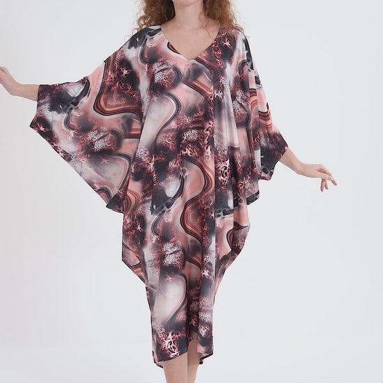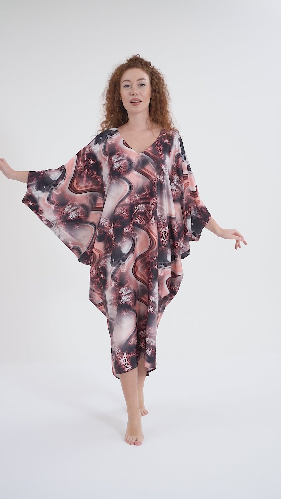 Be the center of attention with this luxuriously elegant kaftan with an elaborate animal print arrangement and fanciful swirls. This silk satin kaftan is ready to wear at any event and travel destination as it is sophisticated and light weight, cool and hydrating. It will sensually drape over your body due to the satin draping effect, feeling soft and comfortable. You can style the kaftan with any preferred shoe style including a knee-high boot and matching hat; and colors such as peach, burgundy, black or silver accessories.