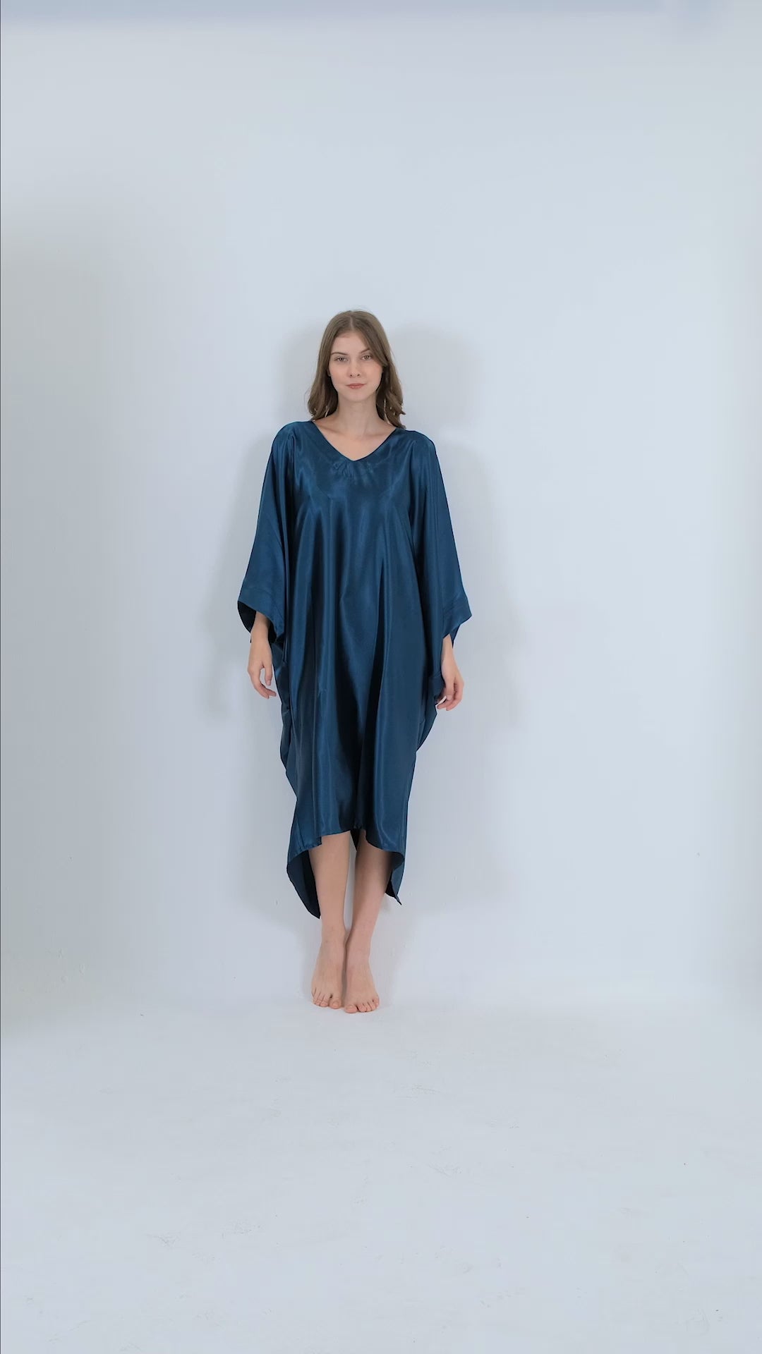 Invest in yourself by adding this stunning sultry dark blue silk kaftan to your closet. Midnight blue is a beautiful intriguing deep cool blue with gray and a hint of black shades. The fabric is wrinkle-free by nature, light weight, has full bounce and luxuriously reflects light due to the satin weave. You can wear this kaftan in any setting; and it can be styled in the same way as a plain black (dress as opposed to a Navy dress), with endless color and textile combinations including burgundy, dusty rose, gold, jewels and animal prints, and eclectic accessories.