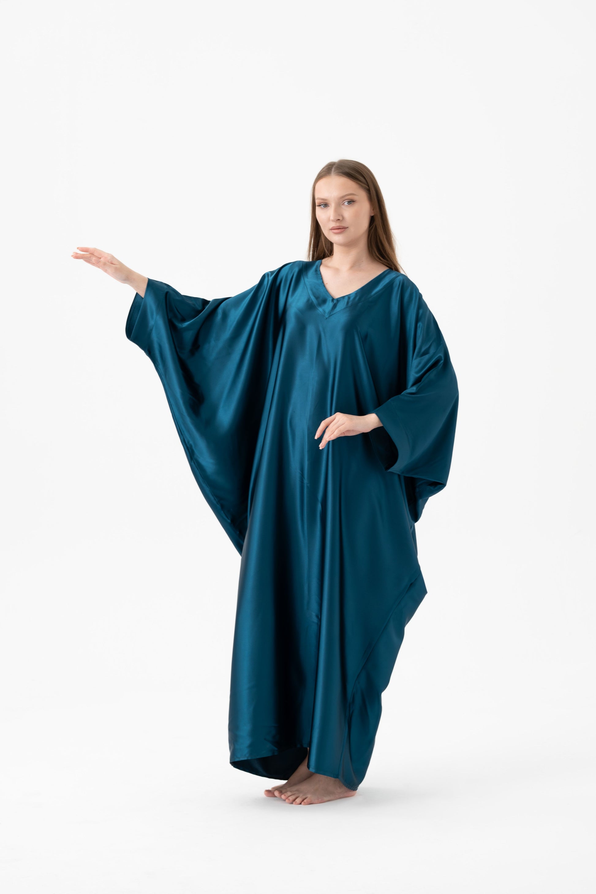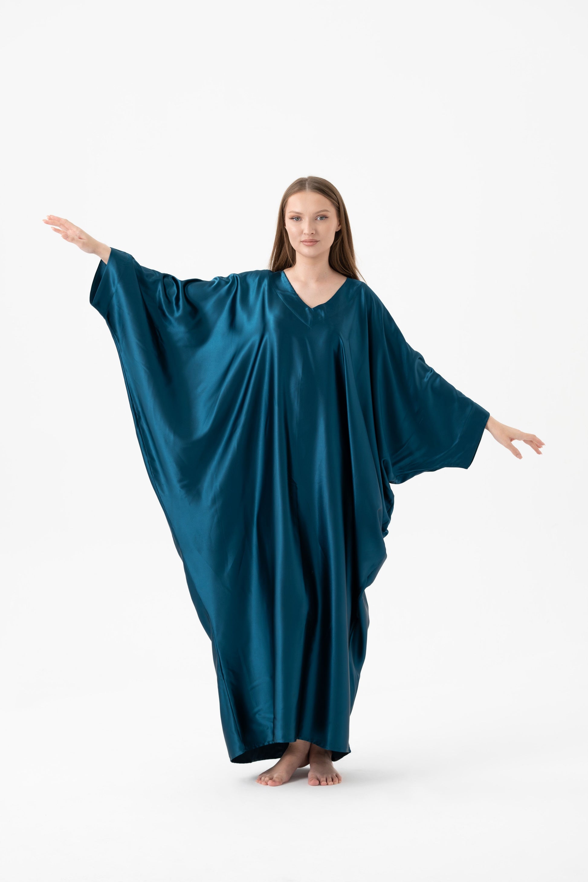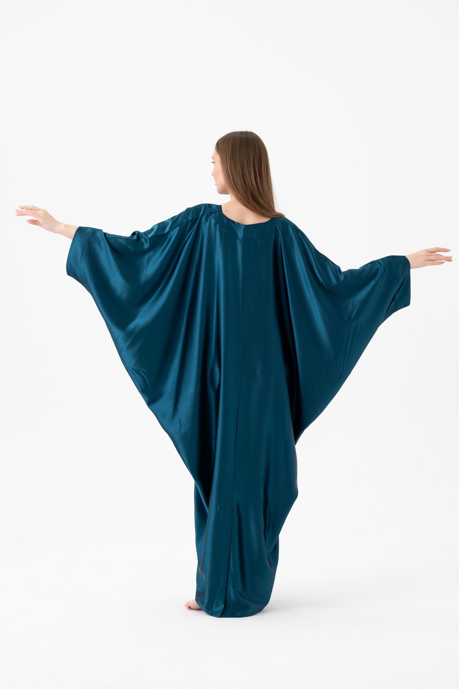 Embrace the beauty of modest fashion with the Isabela Amie Paris Modest Midnight Blue Kaftan. Invest in yourself by adding this stunning sultry dark blue silk kaftan to your closet. Midnight blue is a beautiful intriguing deep cool blue with gray and a hint of black shades. The fabric is wrinkle-free by nature, light weight, has full bounce and luxuriously reflects light due to the satin weave. You can wear this kaftan in any setting; and it can be styled in the same way as a plain black (dress as opposed to a Navy dress), with endless color and textile combinations including burgundy, dusty rose, gold, jewels and animal prints, and eclectic accessories.