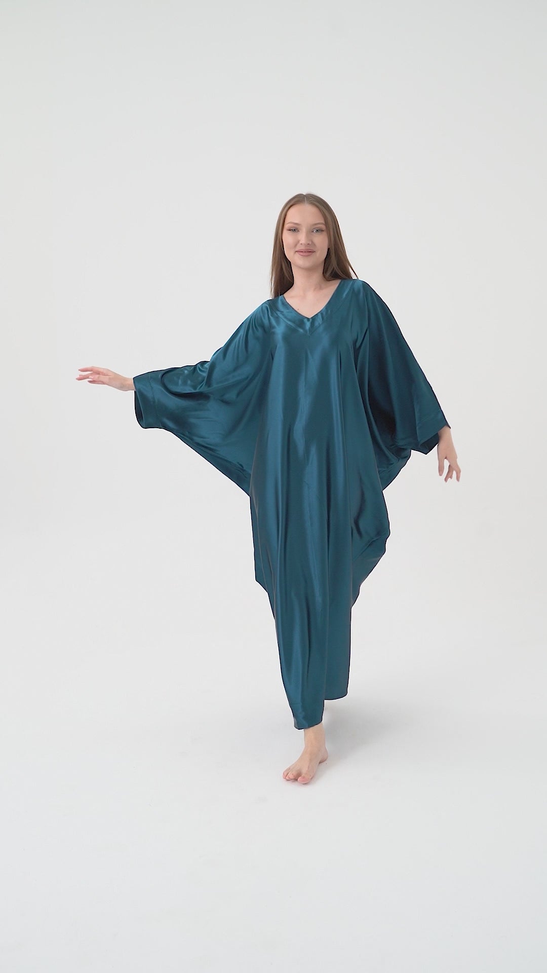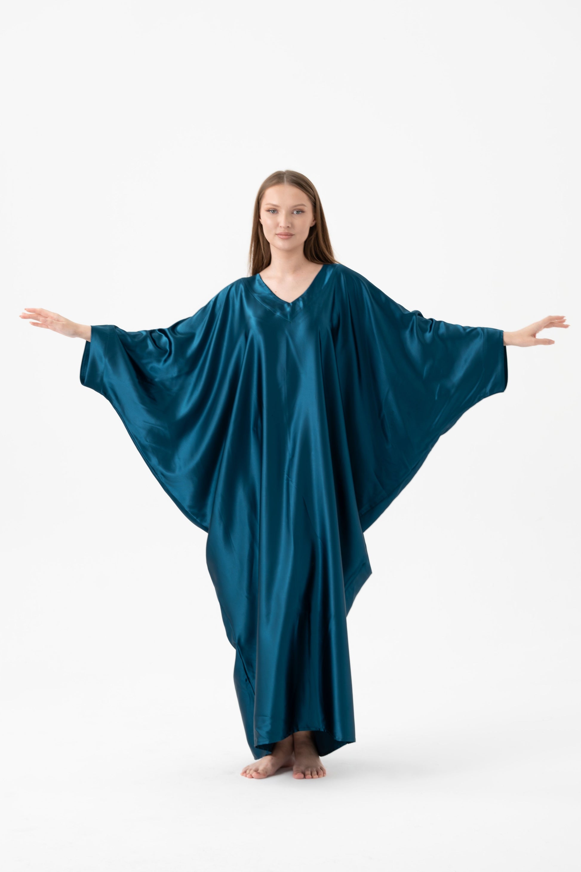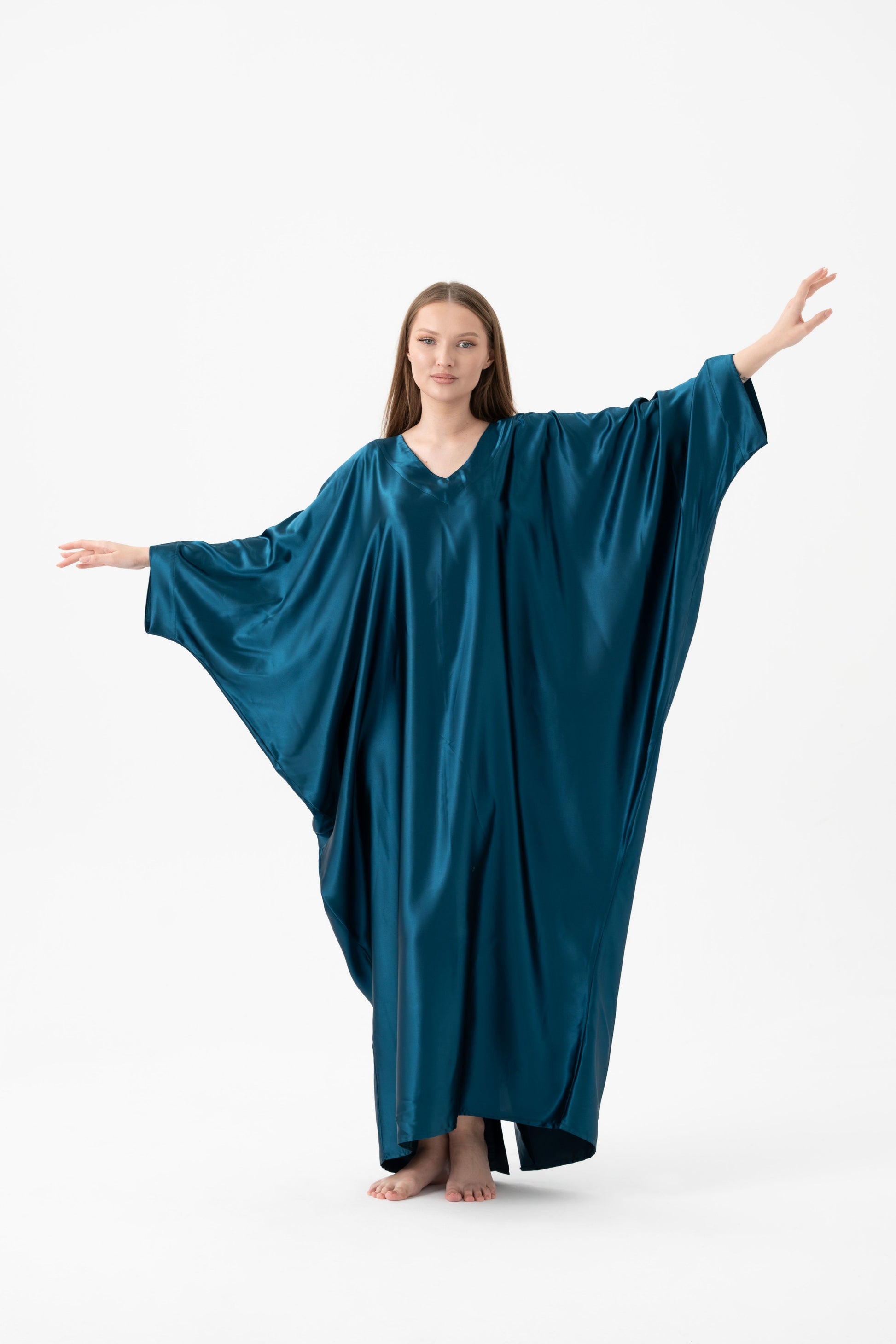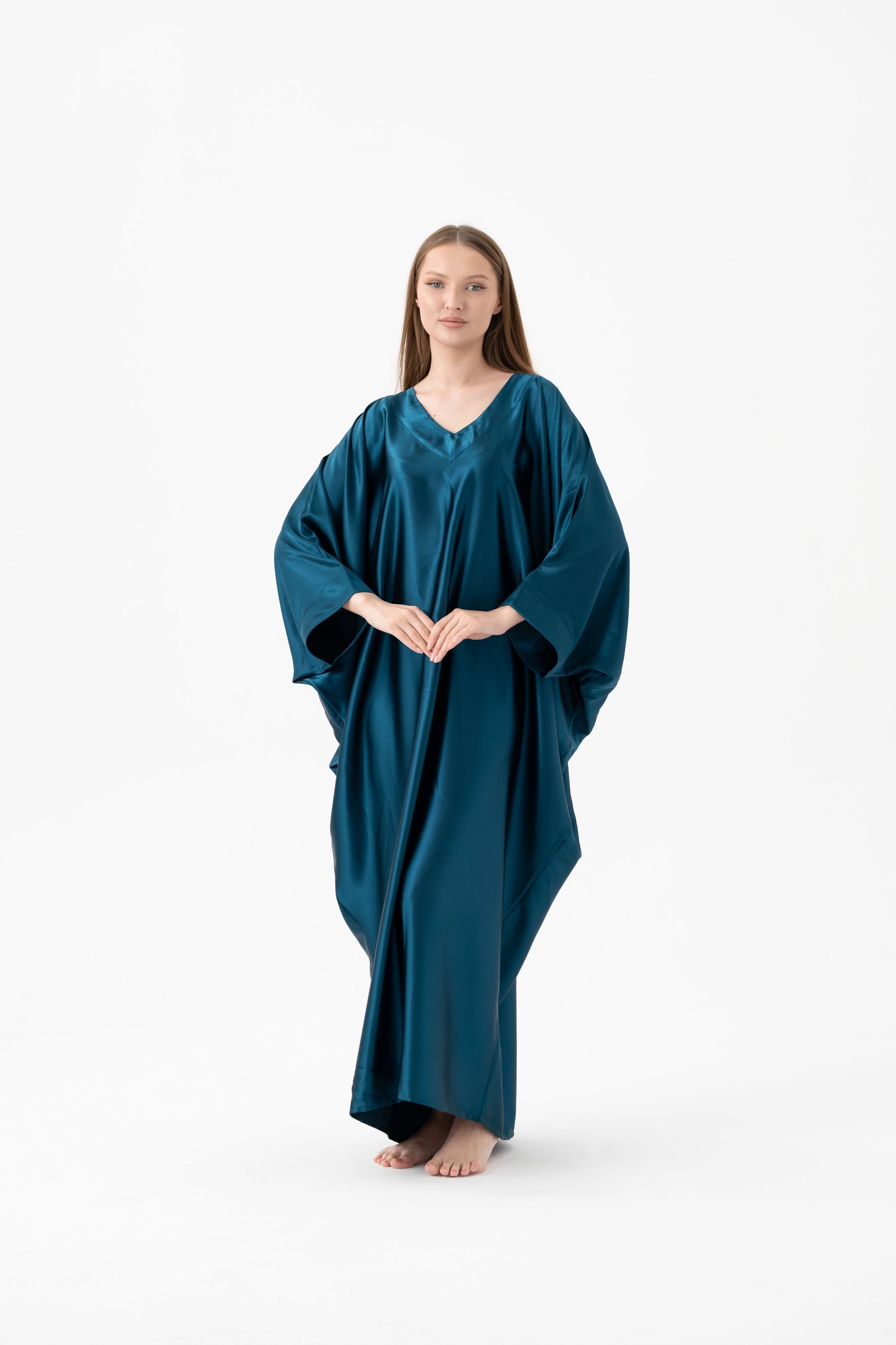 Embrace the beauty of modest fashion with the Isabela Amie Paris Modest Midnight Blue Kaftan. Invest in yourself by adding this stunning sultry dark blue silk kaftan to your closet. Midnight blue is a beautiful intriguing deep cool blue with gray and a hint of black shades. The fabric is wrinkle-free by nature, light weight, has full bounce and luxuriously reflects light due to the satin weave. You can wear this kaftan in any setting; and it can be styled in the same way as a plain black (dress as opposed to a Navy dress), with endless color and textile combinations including burgundy, dusty rose, gold, jewels and animal prints, and eclectic accessories.