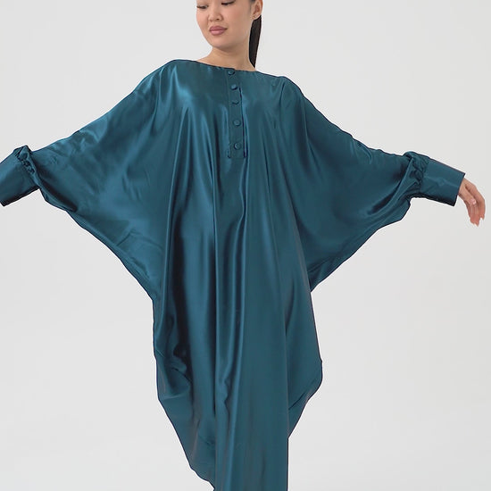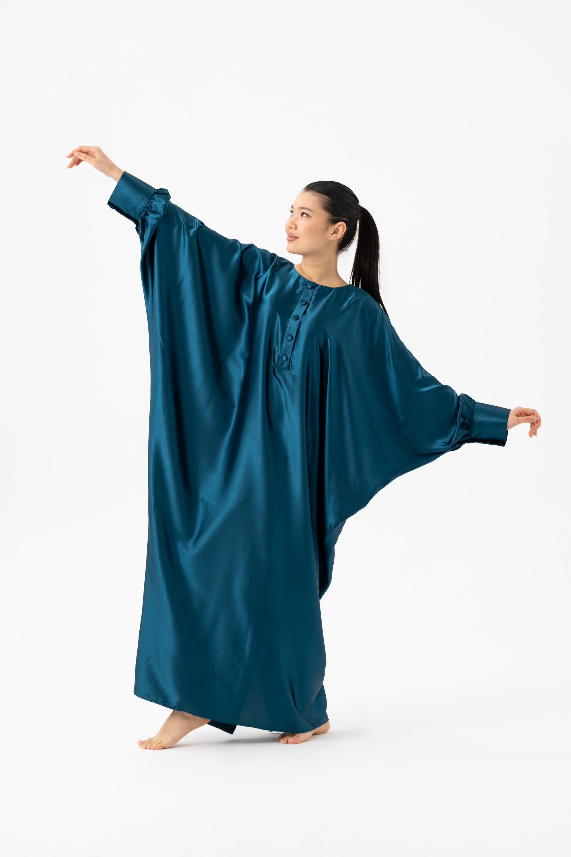 Step into full-coverage luxury with the Isabela Amie Paris Traditional Midnight Blue Kaftan. Invest in yourself by adding this stunning sultry dark blue silk kaftan to your closet. Midnight blue is a beautiful intriguing deep cool blue with gray and a hint of black shades. The fabric is wrinkle-free by nature, light weight, has full bounce and luxuriously reflects light due to the satin weave. You can wear this kaftan in any setting; and it can be styled in the same way as a plain black (dress as opposed to a Navy dress), with endless color and textile combinations including burgundy, dusty rose, gold, jewels and animal prints, and eclectic accessories.