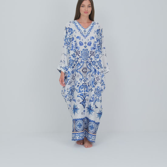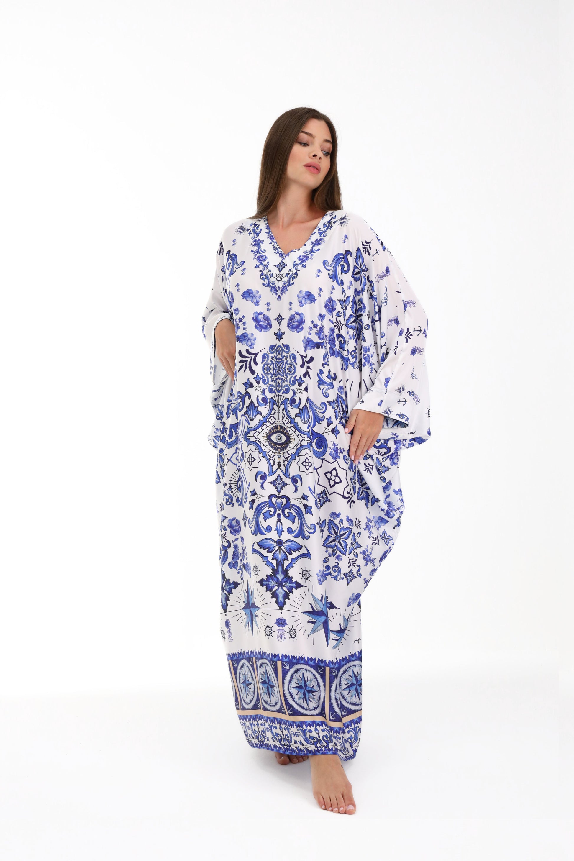 Isabela Amie Paris Nazar Luxe Kaftan Sacred Elegance in Silk Embrace the mystical allure of Mediterranean tradition with the Isabela Amie Paris Nazar Luxe Kaftan, where ancient symbolism meets modern luxury. This exquisite piece is crafted from pristine white silk satin and adorned with intricate blue floral mandala patterns inspired by the spiritual art of henna and meditation circles. At its heart, a Turkish Nazar — centuries-old talisman of protection— guarding the wearer with grace and elegance. The kaftan’s fluid drape and lightweight feel make it ideal for serene retreats or celestial celebrations. Artisan Legacy: Guardianship in Silk Handcrafted in Turkey by master artisans, this kaftan honors: ✔ Mandala-inspired florals symbolizing unity and harmony ✔ Breathable white silk satin that offers cooling comfort ✔ Flowing silhouette with side slits for effortless movement Styled for Spiritual Glamour: 🌀 Boho Goddess Layer with silver ankle bracelets and turquoise rings Woven straw bag with blue tassels 🌊 Seaside Ceremony Pair with pearl-embellished sandals and a linen shawl Delicate crystal hair accessories 🏺 Cultural Evening Cinch with a braided indigo belt Statement silver earrings with lapis lazuli Perfect For: ✔ Yoga Retreats in Santorini ✔ Mediterranean Blessing Ceremonies ✔ Wellness Weddings ✔ Museum Galas with Spiritual Themes Why This Kaftan Is a Talisman ✔ Protective Symbolism: The Nazar guards against negative energy ✔ Travel-Ready Serenity: Wrinkle-resistant silk for stress-free journeys ✔ Versatile Palette: White and blue complement gold or silver accessories ✔ Gift of Protection: Presented in a gift box A Wearable Blessing More than a garment, this kaftan is a vessel of positive energy—blending Turkish craftsmanship with the universal language of protection and peace. Whether you’re meditating in a Balinese sanctuary or dancing at a Mykonos party, the Nazar Luxe Kaftan ensures you do so with sacred grace. Design Note: The mandala patterns radiate symmetrically from the Nazar, creating a visual mantra of balance and harmony.