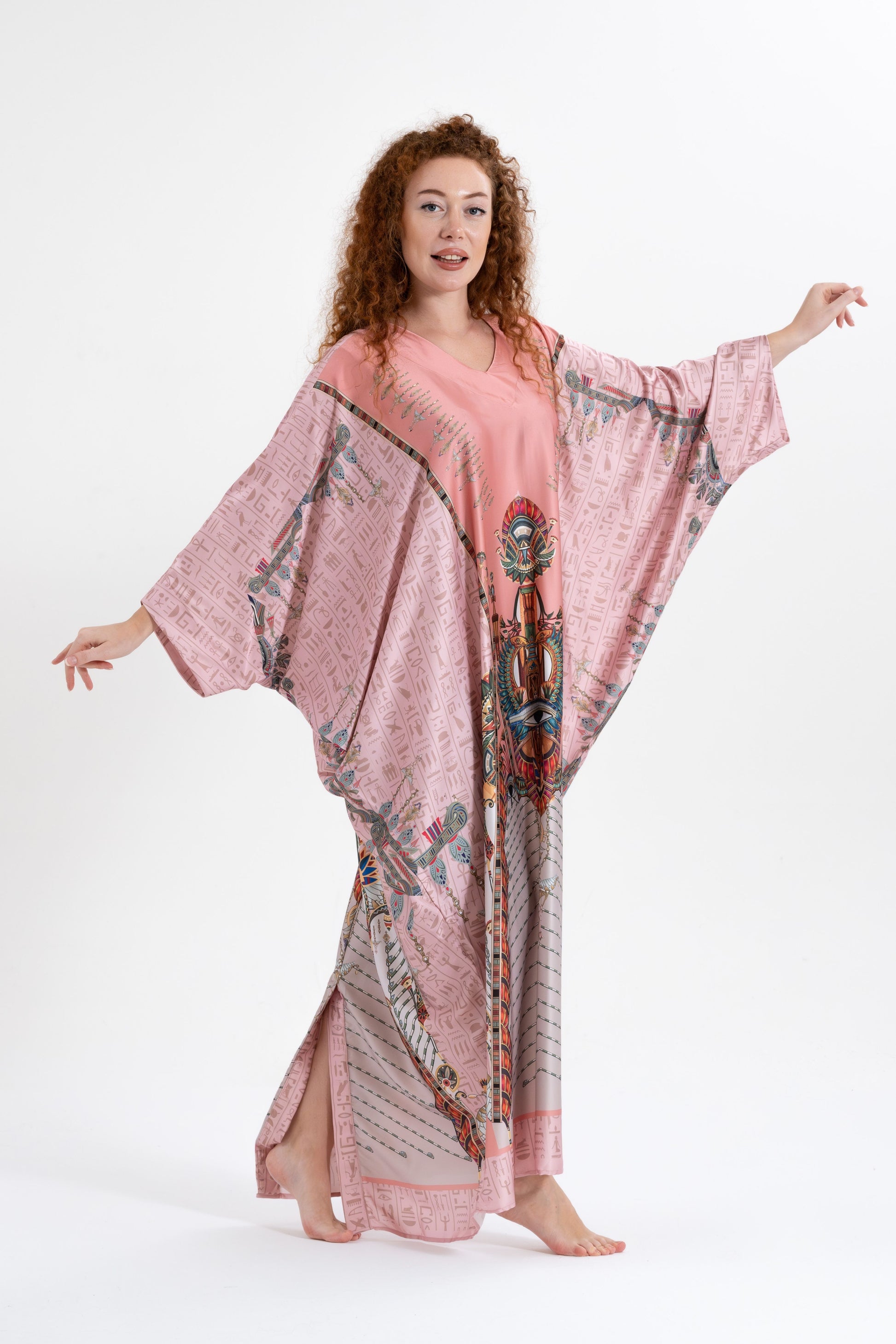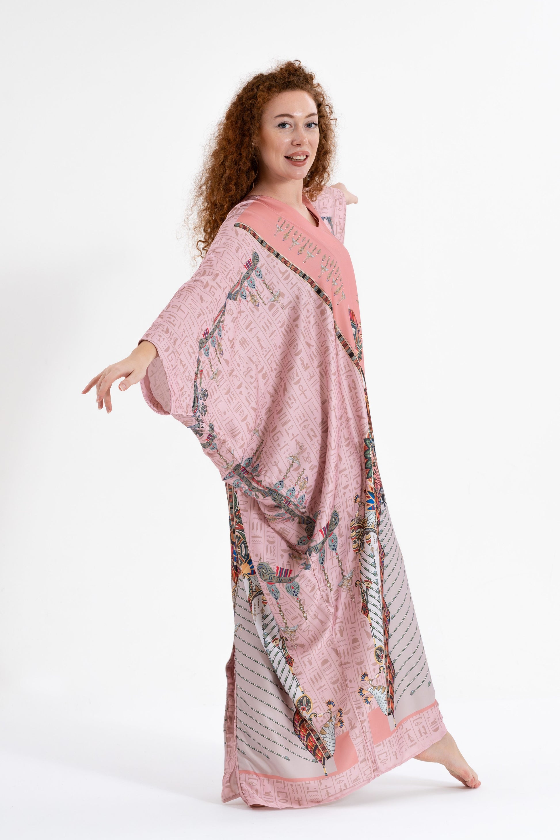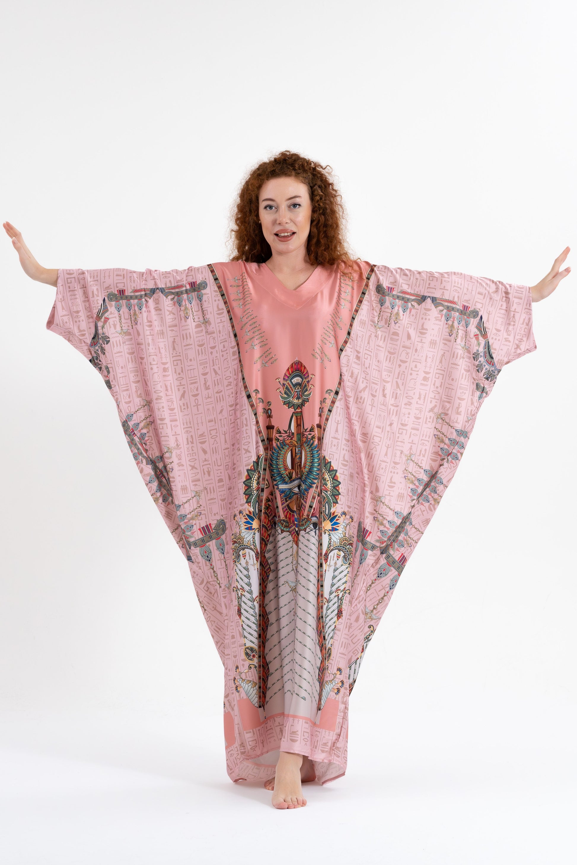 Elevate your international travel fashion with the Isabela Amie Paris Modest Pink Egyptian Oracles Kaftan, where rich history and style come together. Inspired by the mystique of ancient Egyptian gods and goddesses, this kaftan features sacred symbols and hieroglyphs woven into the luxurious silk satin fabric. With a bit more coverage than traditional styles, it offers a modest yet sophisticated silhouette that flows beautifully over your body, perfect for travel or special occasions. Everyone can enjoy modest fashion, and this kaftan celebrates that with its timeless elegance. Pair it with gold or earthy tones for a look that honors the beauty of Egyptian history while making you feel beautiful just the way you are.