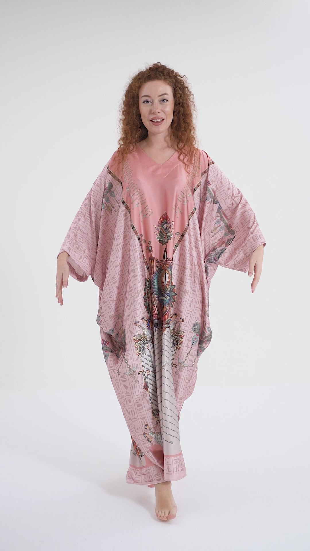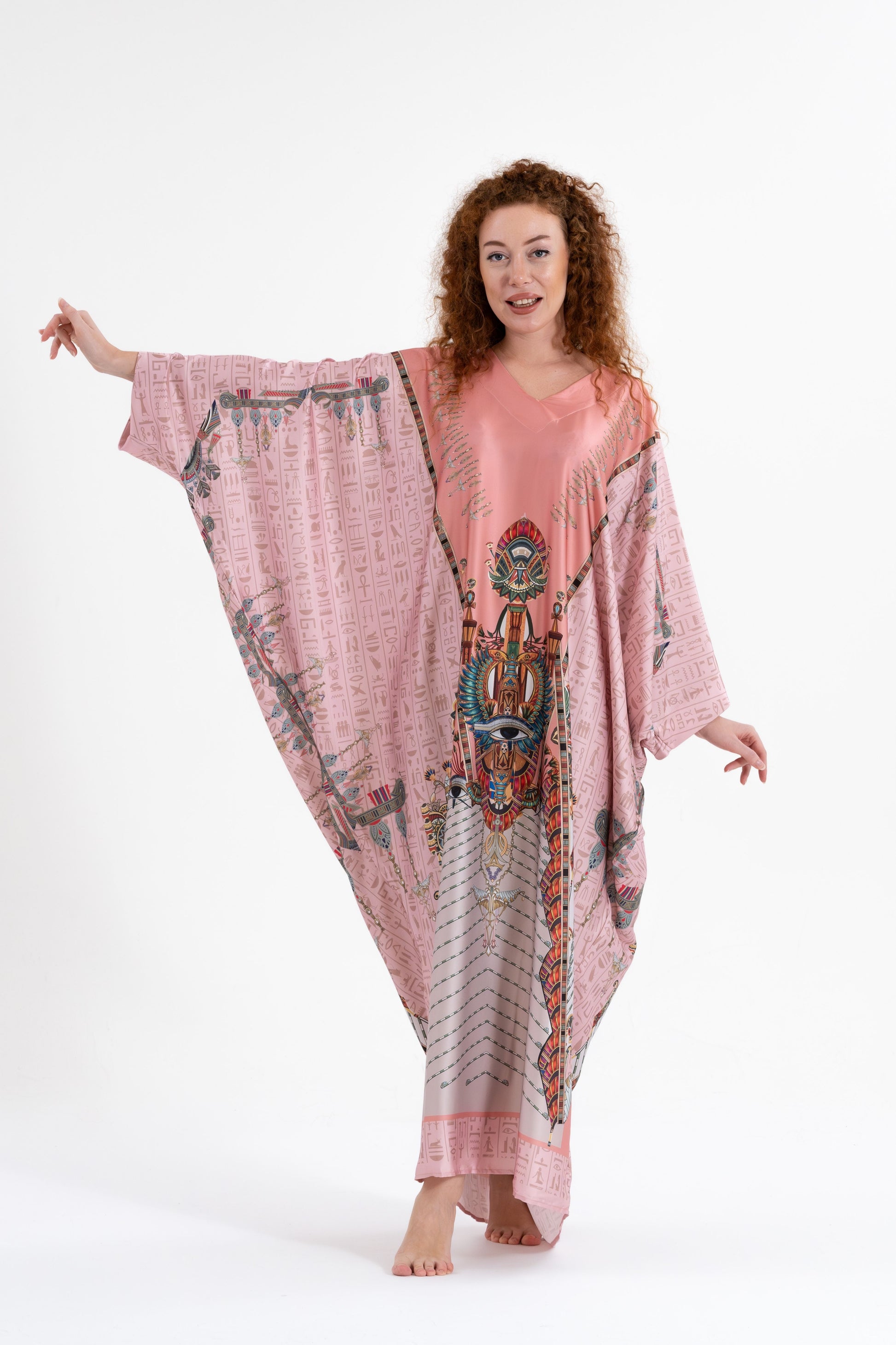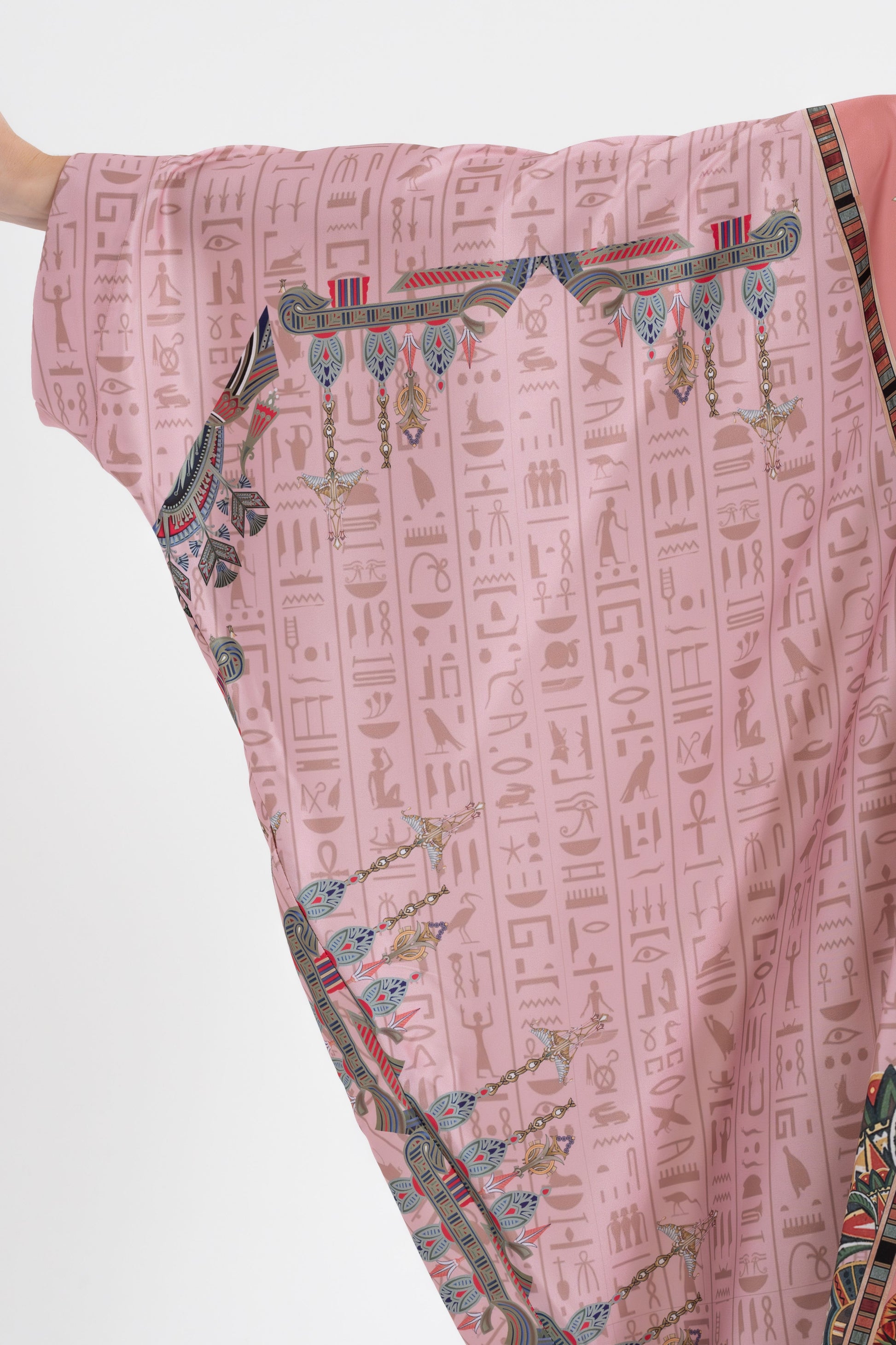Elevate your international travel fashion with the Isabela Amie Paris Modest Pink Egyptian Oracles Kaftan, where rich history and style come together. Inspired by the mystique of ancient Egyptian gods and goddesses, this kaftan features sacred symbols and hieroglyphs woven into the luxurious silk satin fabric. With a bit more coverage than traditional styles, it offers a modest yet sophisticated silhouette that flows beautifully over your body, perfect for travel or special occasions. Everyone can enjoy modest fashion, and this kaftan celebrates that with its timeless elegance. Pair it with gold or earthy tones for a look that honors the beauty of Egyptian history while making you feel beautiful just the way you are.
