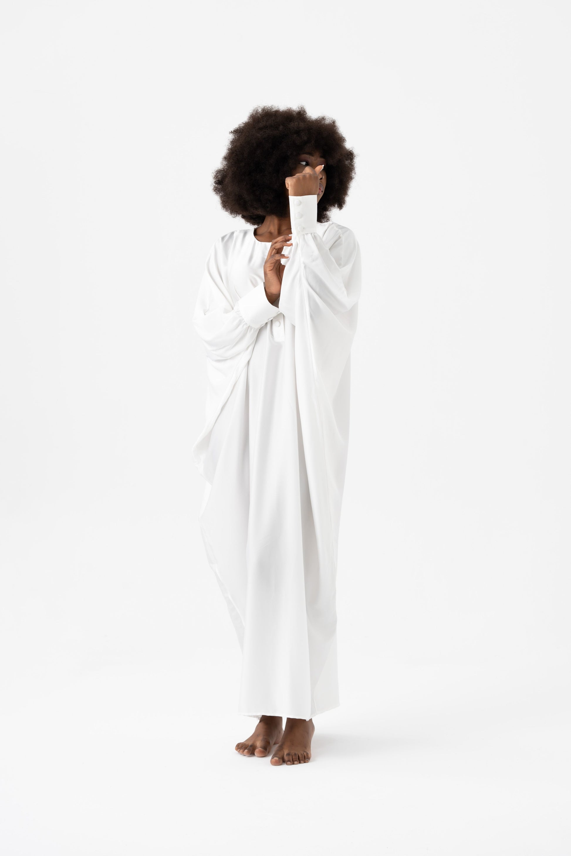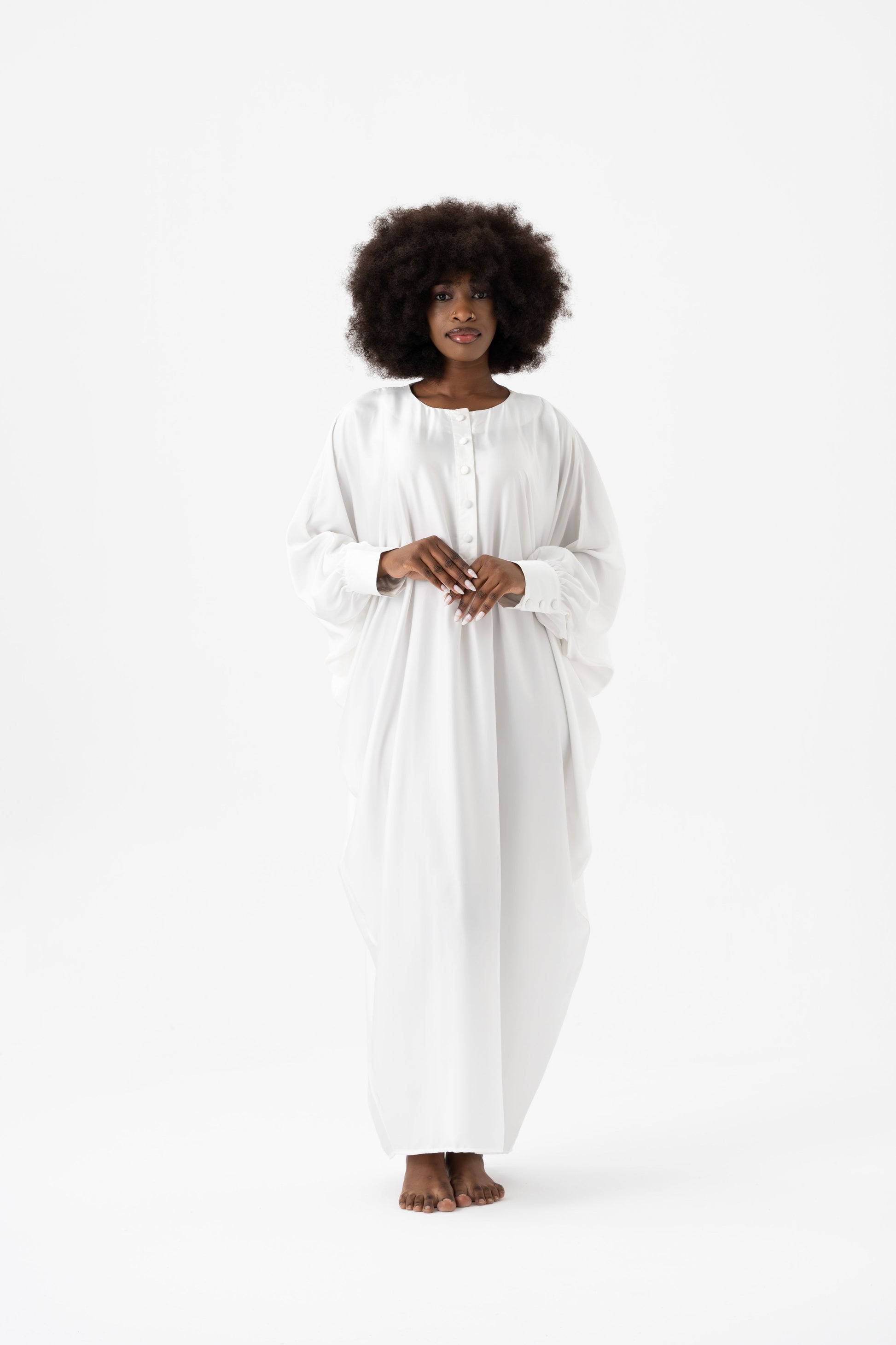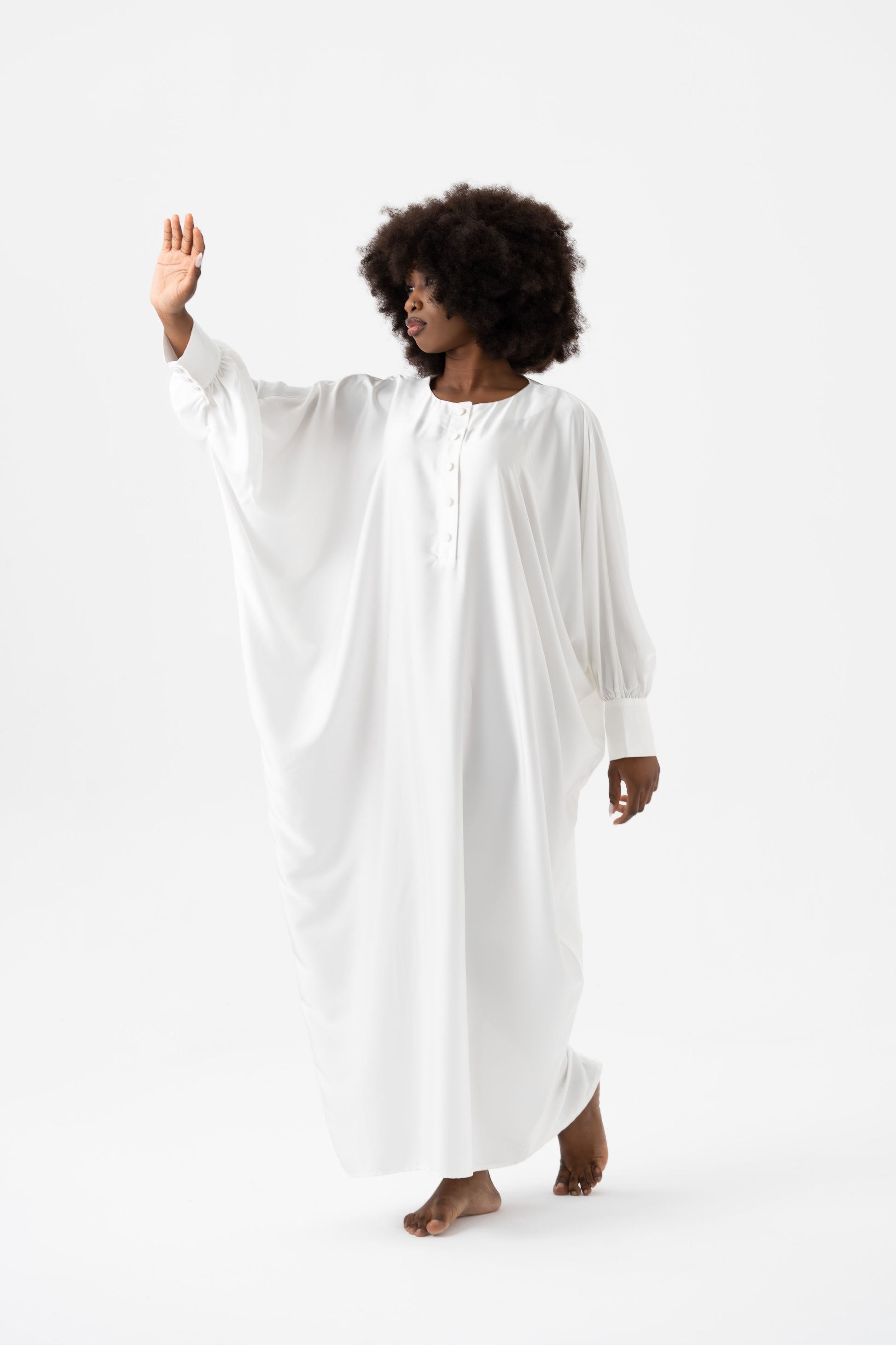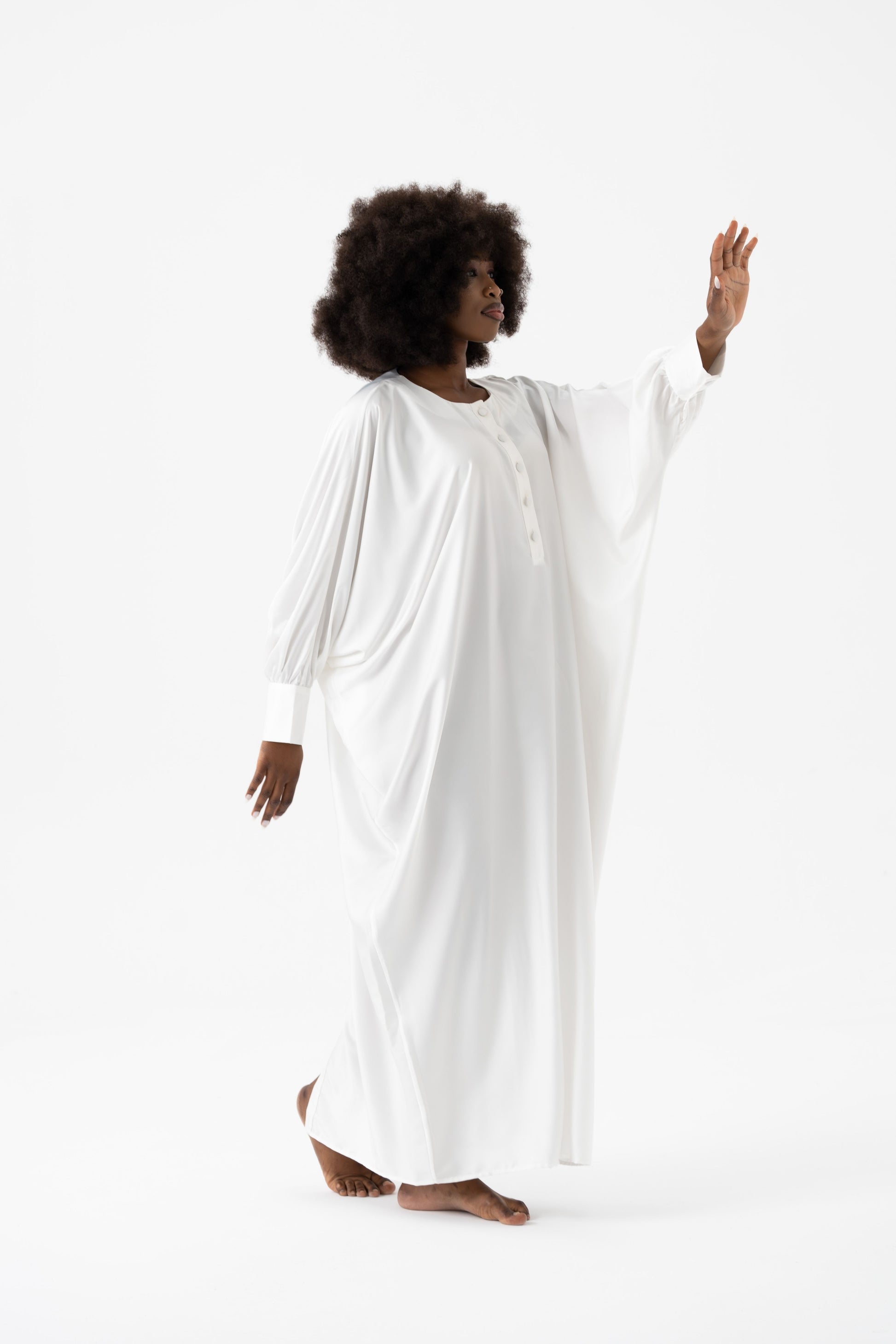 Step into full-coverage luxury with the Isabela Amie Paris Traditional Pure White Kaftan. Life is too short for anything less than a effortless and feminine white silky soft kaftan dress. This designer kaftan with a sensually impeccable silhouette is the perfect outfit for an elegant style suitable for any occasion. This kaftan will look beautiful at a travel destination with a beautiful backdrop scenery, including an opulent historical cathedral or mosque wedding. You can easily pack this kaftan in your luggage and travel with it as staple clothing item, as it is wrinkle free in nature, light weight and cool. Light reflects off the fabric from the satin weave giving a luxurious look; while easily paring any color or accessories, depending on your mood or inspiration.