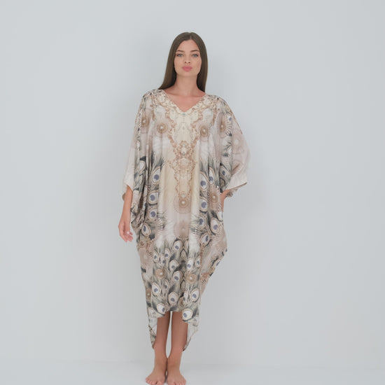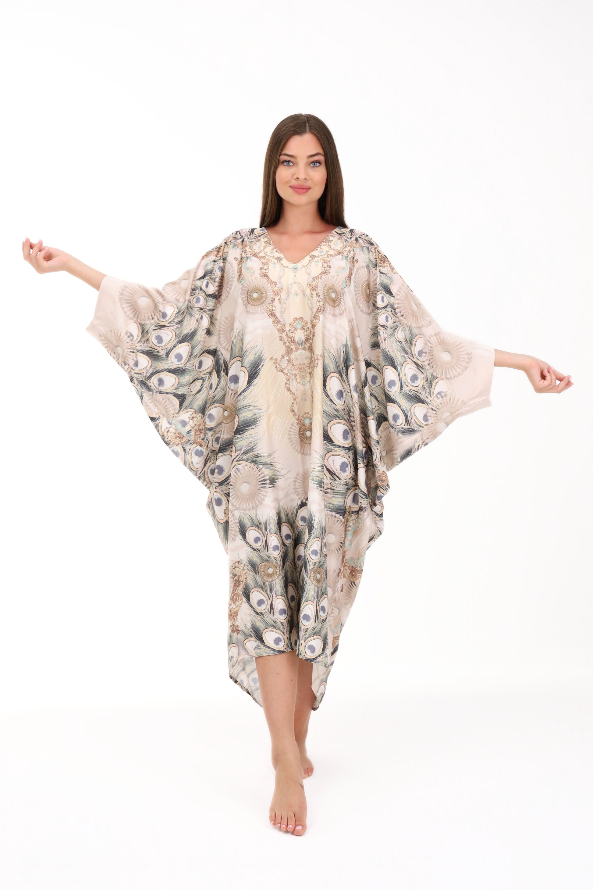 Embrace the beauty of fashion with the Isabela Amie Paris Modern Regal Featherscape Kaftan. Dress to impress and be the passionate showstopper with the Isabela Amie Paris classic red silk satin kaftan. This elegantly timeless red dress will be sure to turn heads as it romantically drapes over your body giving a slimming sensual silhouette. This kaftan is sure to boost your confidence and suitable for any occasion as it is light weight and breathable. Style it with a red or nude lipstick and a belt of any color—including the same or a different red.
