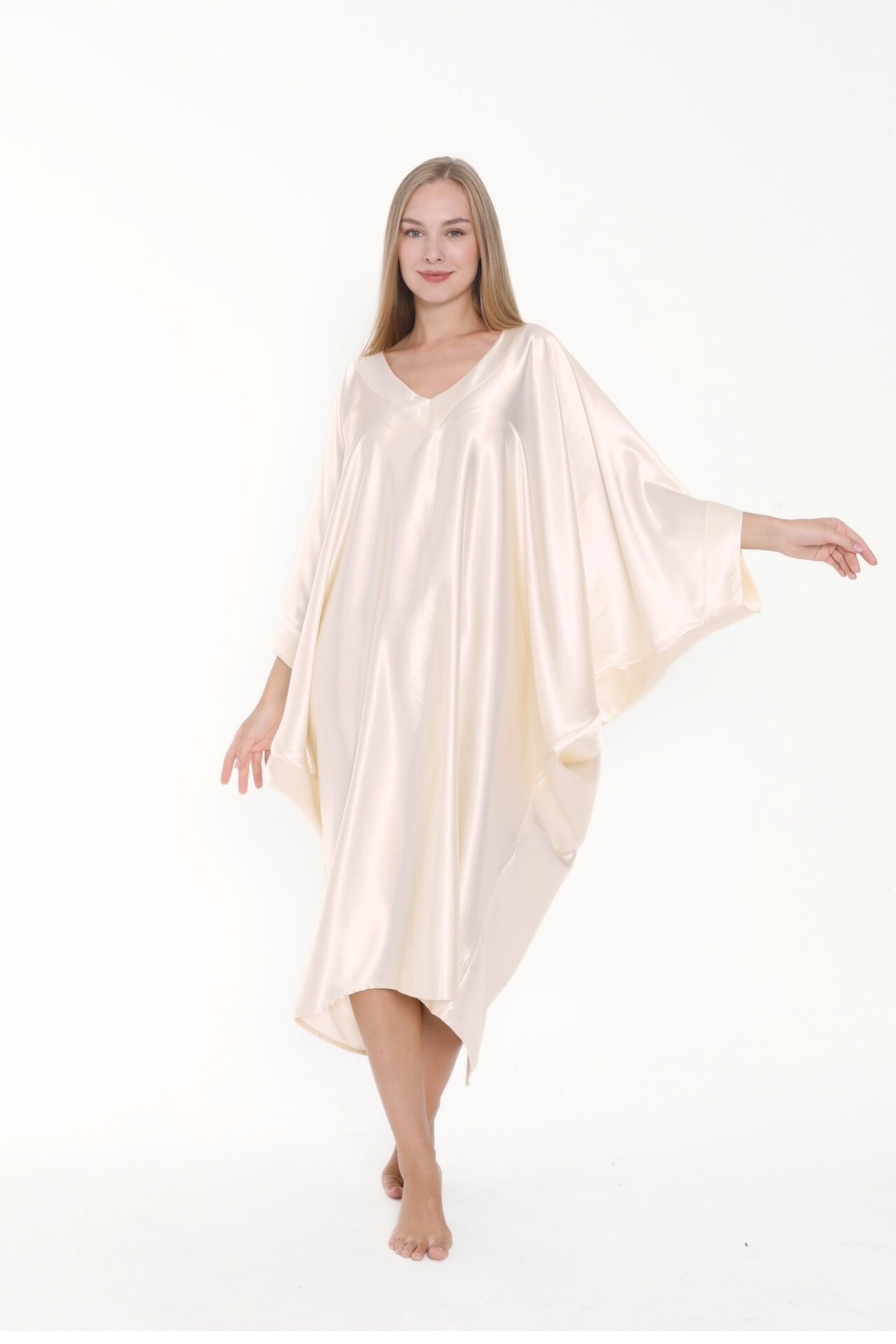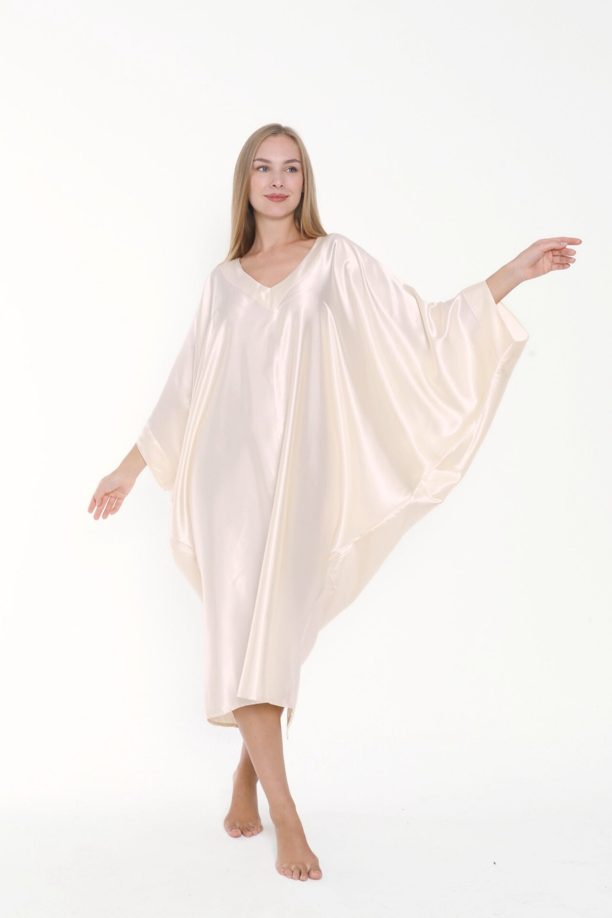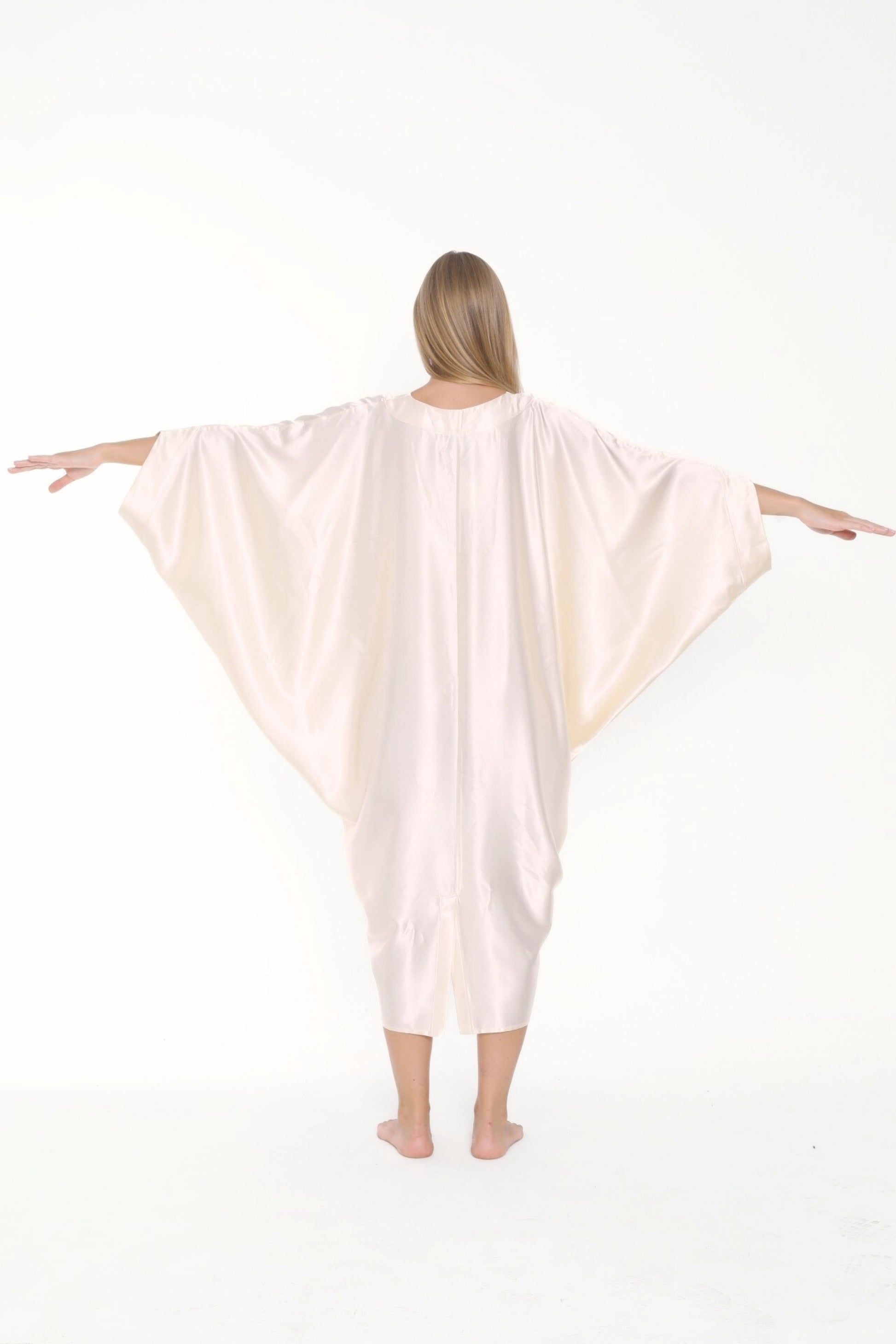 Versatility meets chic with this minimalist silk satin kaftan. Don’t settle for anything less than refined luxury and add this pearly, ecru, cream ivory shade kaftan dress to your closet collection. This kaftan has a luxuriously lovely fluid drape and gorgeous luster giving a refined look. This off-white kaftan combines will with navy or French blue, black, earthy colors such as brow or amber; and can even be worn with jewels and opulent accessories for a grand evening look.