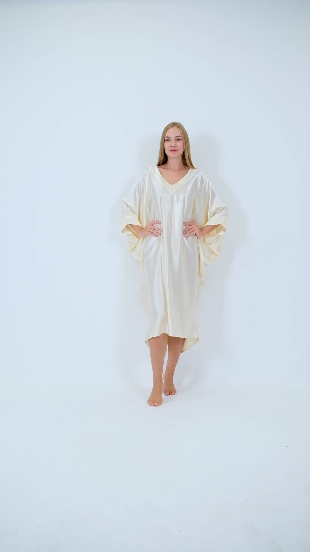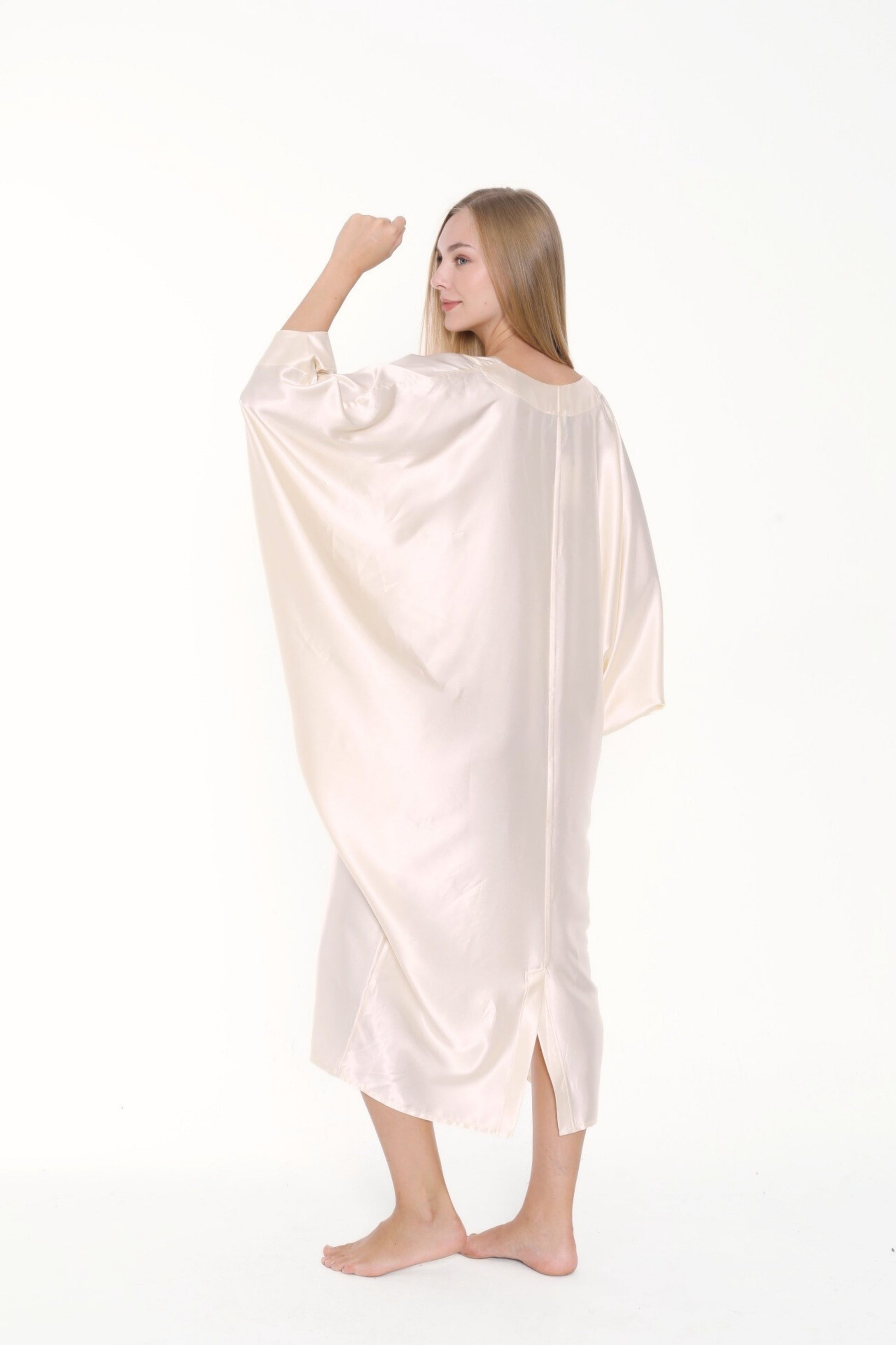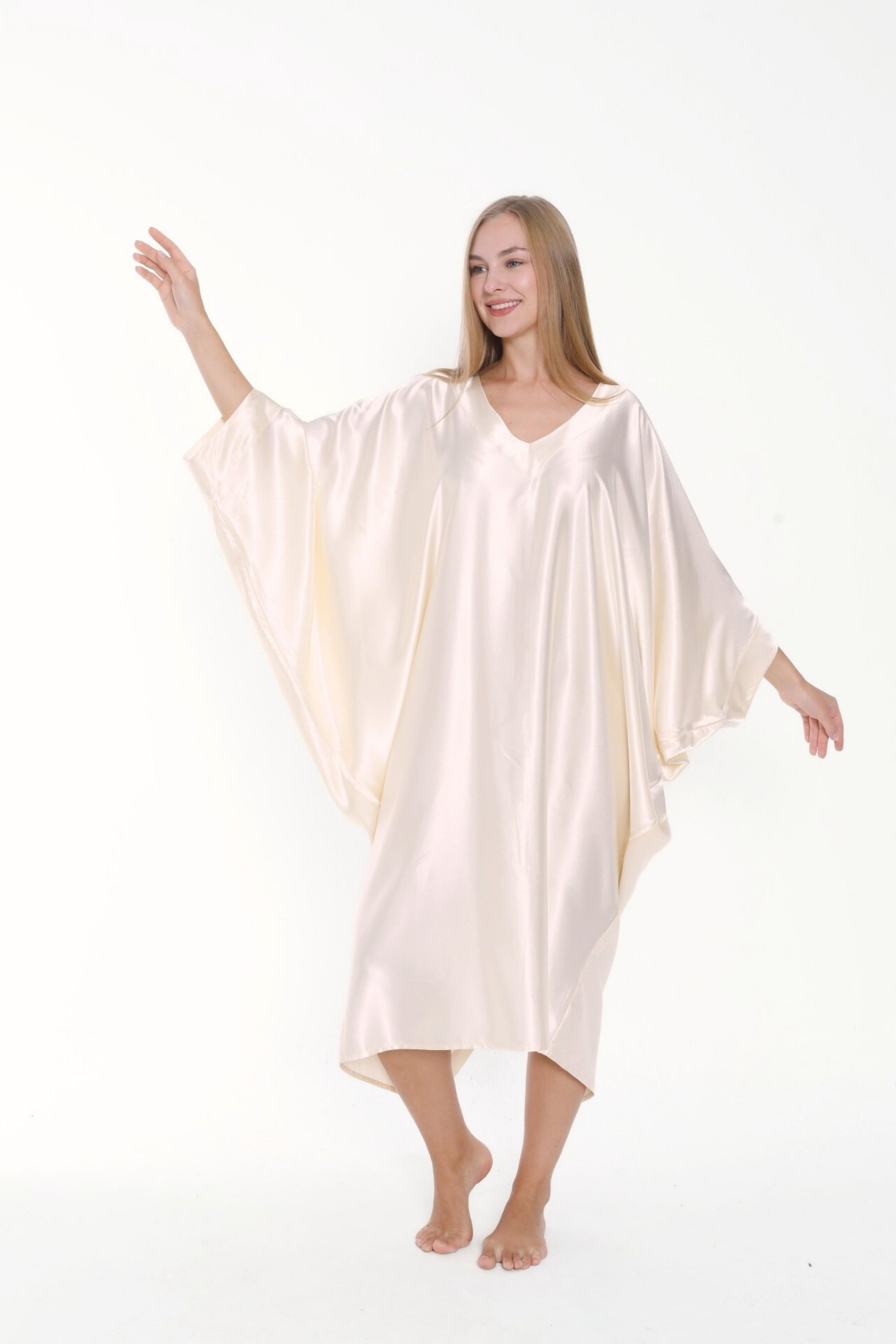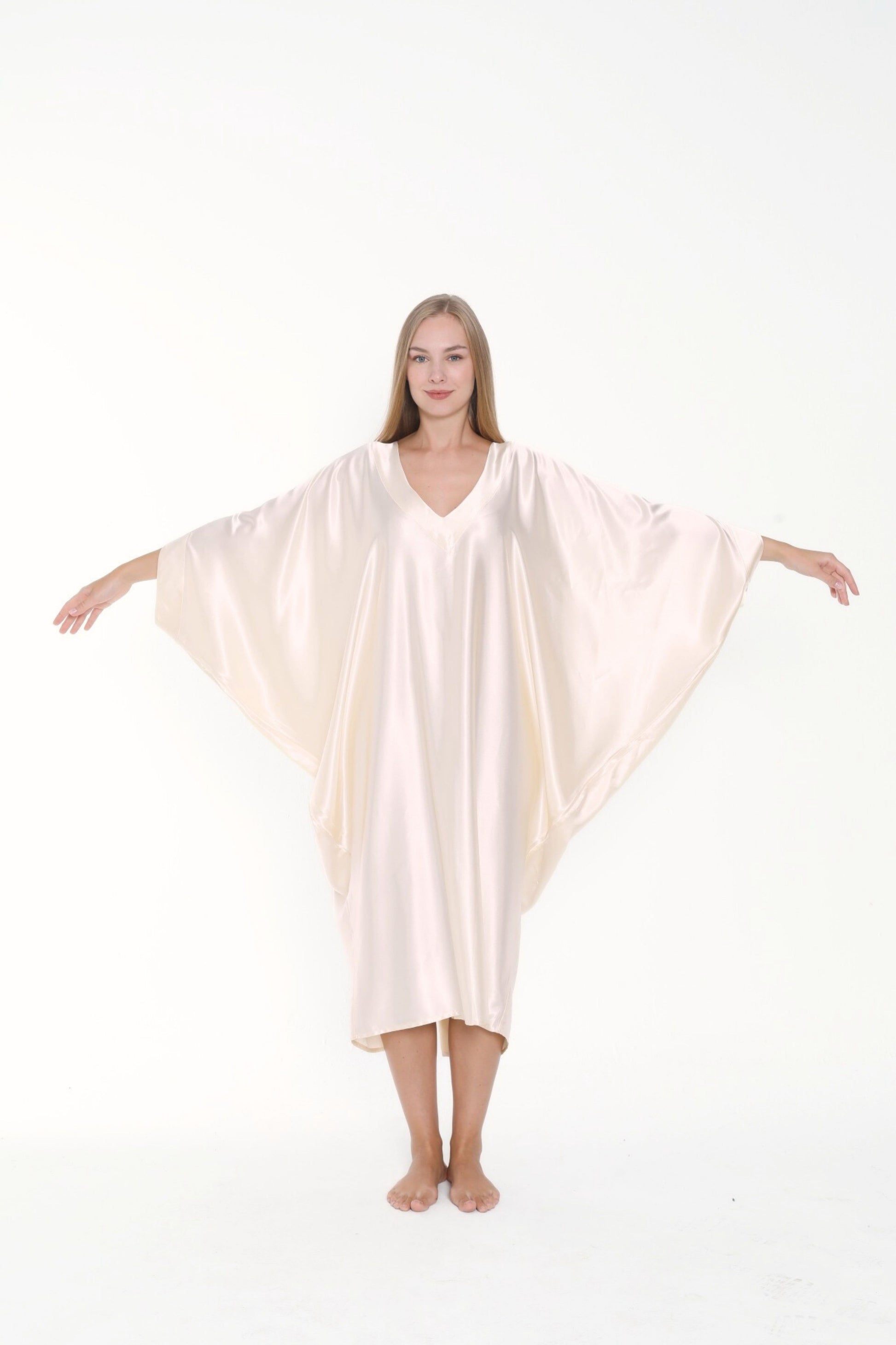 Versatility meets chic with this minimalist silk satin kaftan. Don’t settle for anything less than refined luxury and add this pearly, ecru, cream ivory shade kaftan dress to your closet collection. This kaftan has a luxuriously lovely fluid drape and gorgeous luster giving a refined look. This off-white kaftan combines will with navy or French blue, black, earthy colors such as brow or amber; and can even be worn with jewels and opulent accessories for a grand evening look.