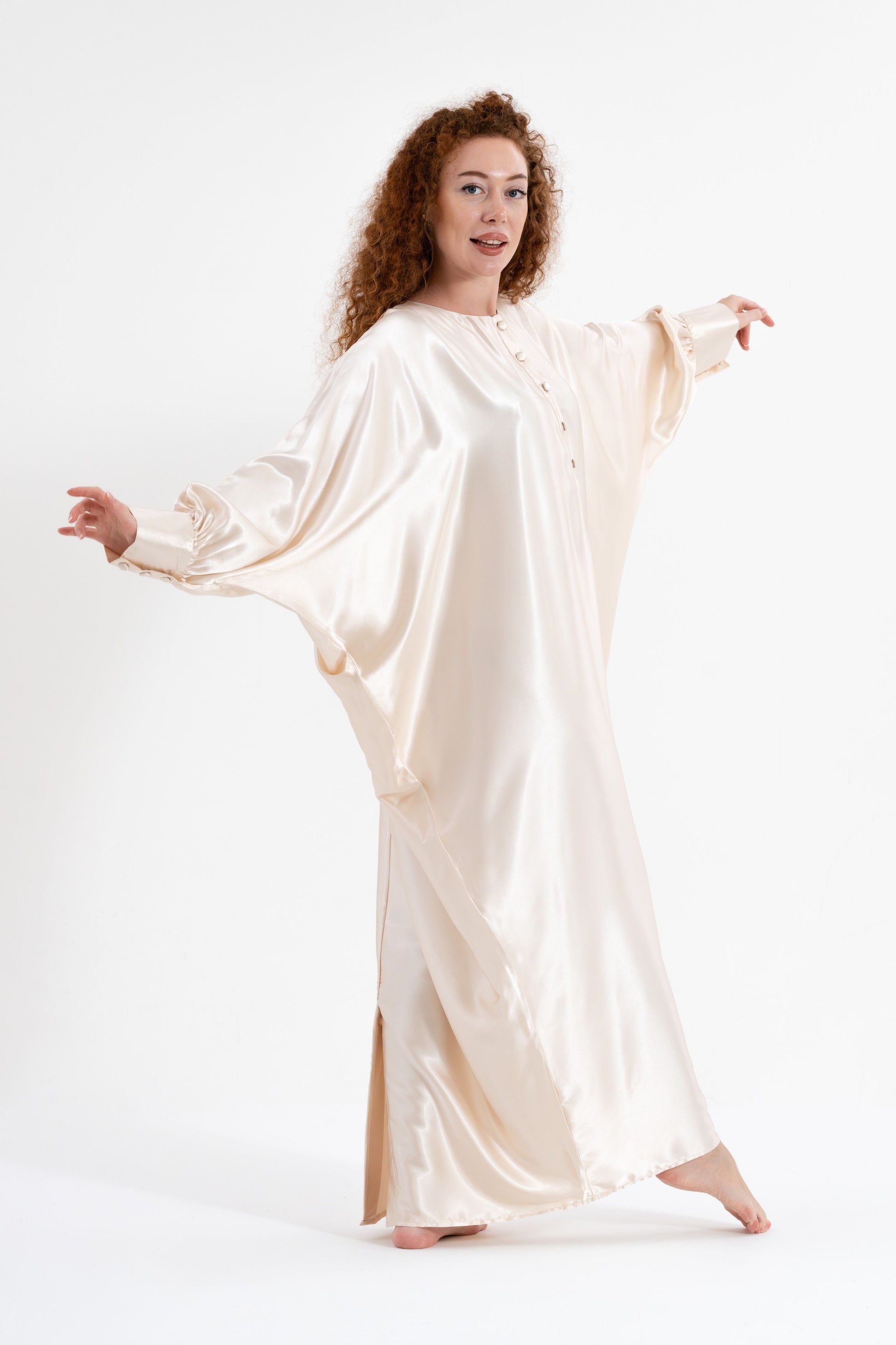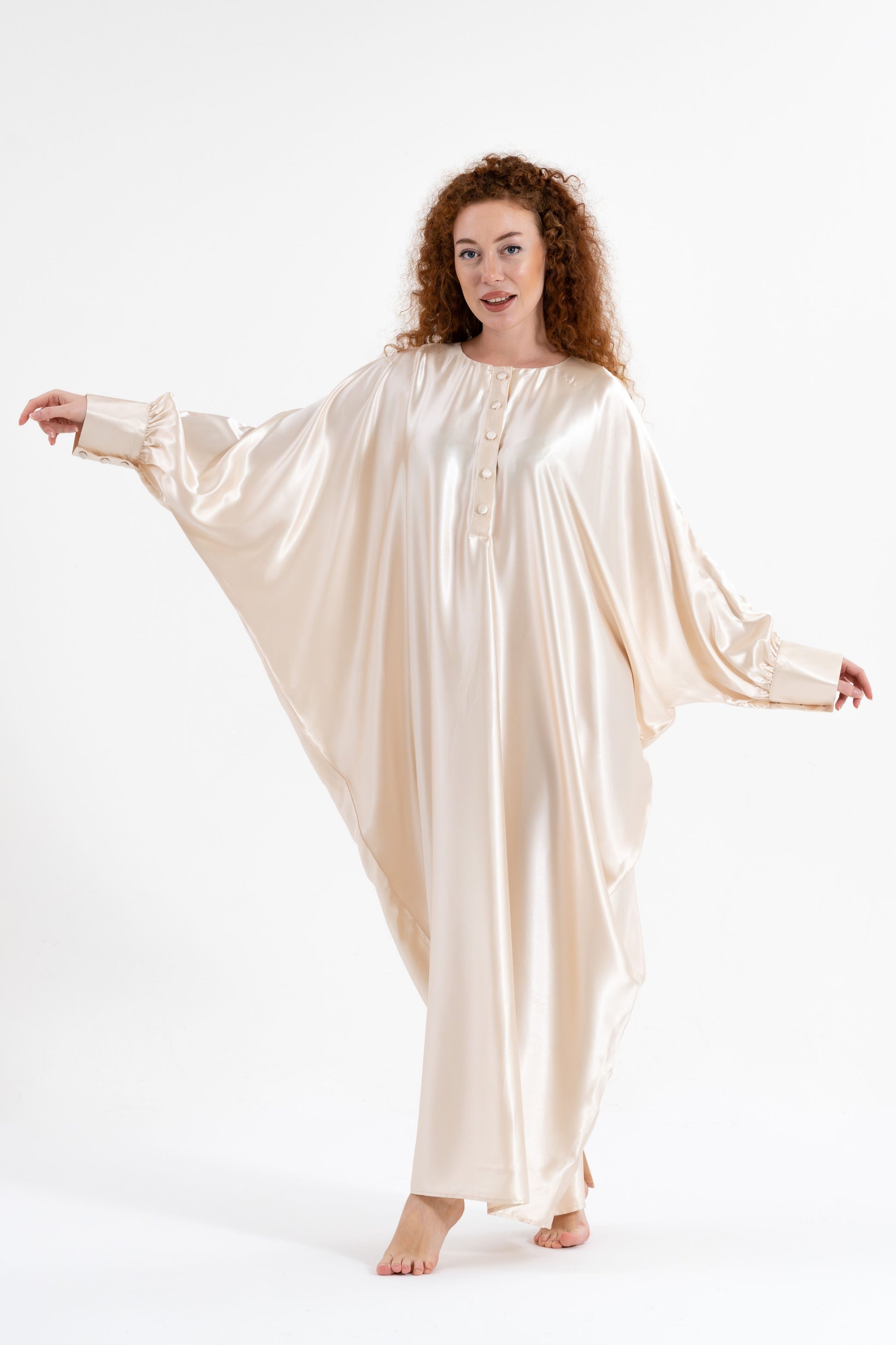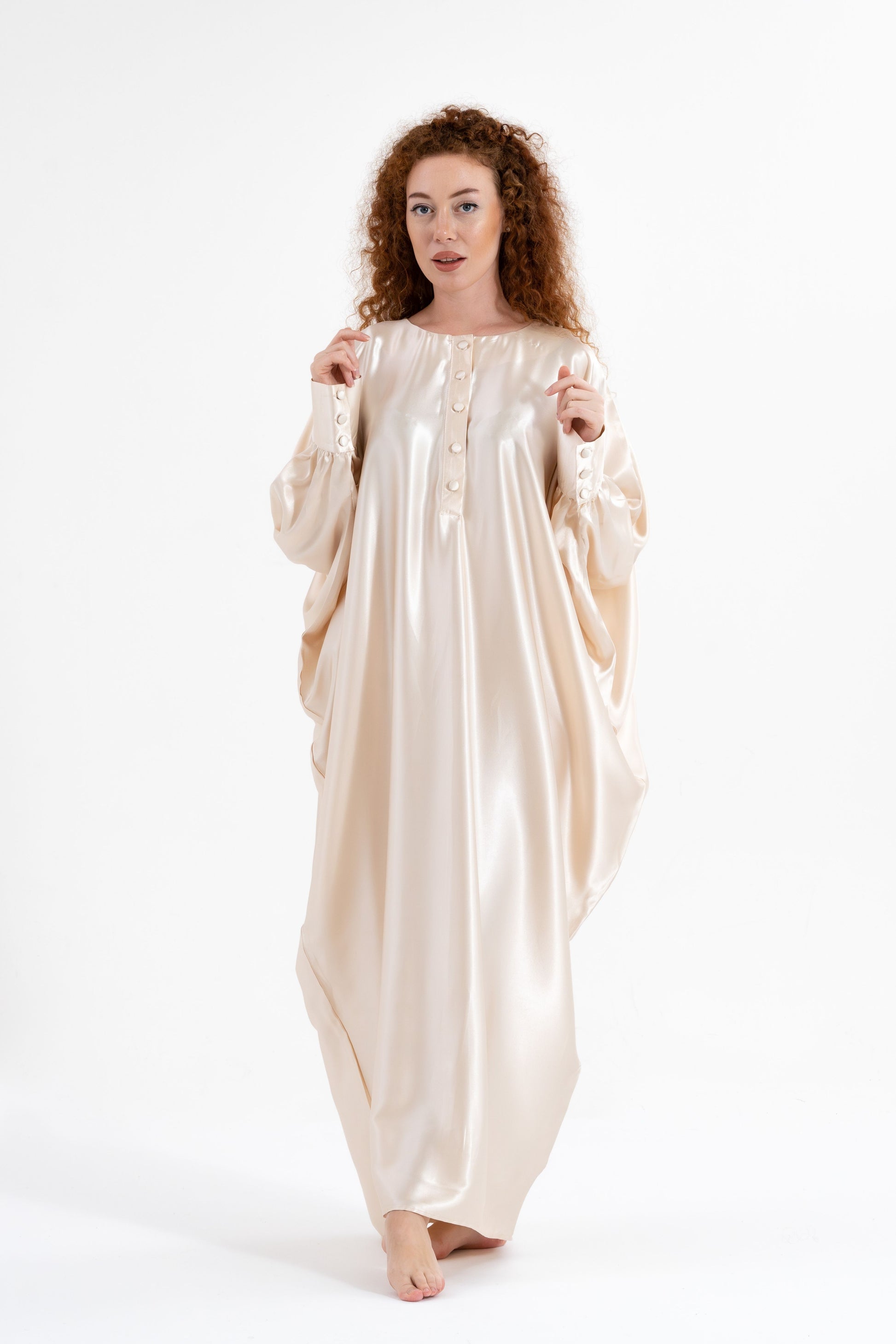Step into full-coverage luxury with the Isabela Amie Paris Traditional Shades of White Kaftan. This flowing silk satin kaftan, in shades of ivory and cream, offers a modest yet glamorous silhouette. With beautifully tailored sleeves fastened with delicate buttons at the wrists, this kaftan exudes sophistication from every angle. Perfect for any occasion, from casual outings to formal events, it pairs effortlessly with earthy tones or deep blues. Add bold accessories for a striking traditional look that’s as versatile as it is elegant.