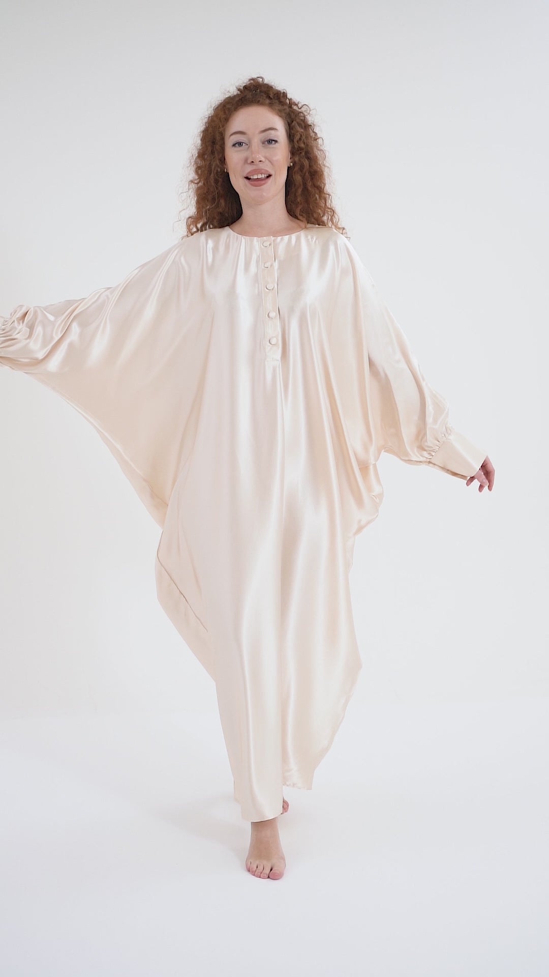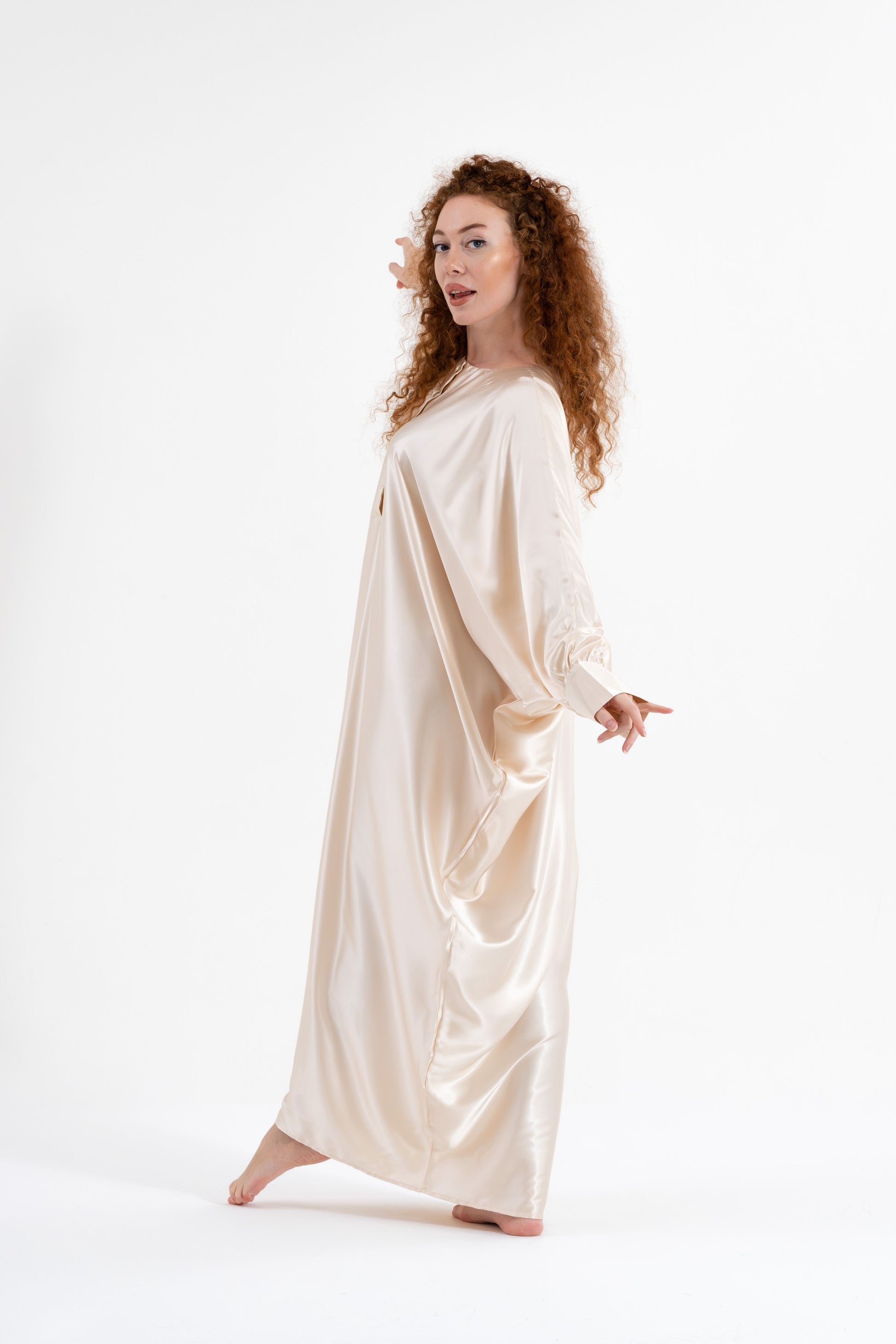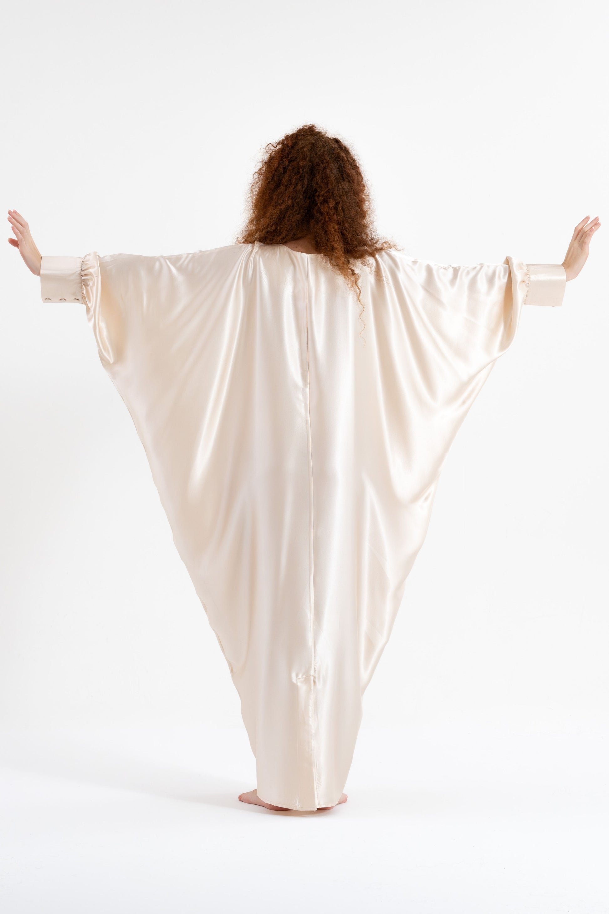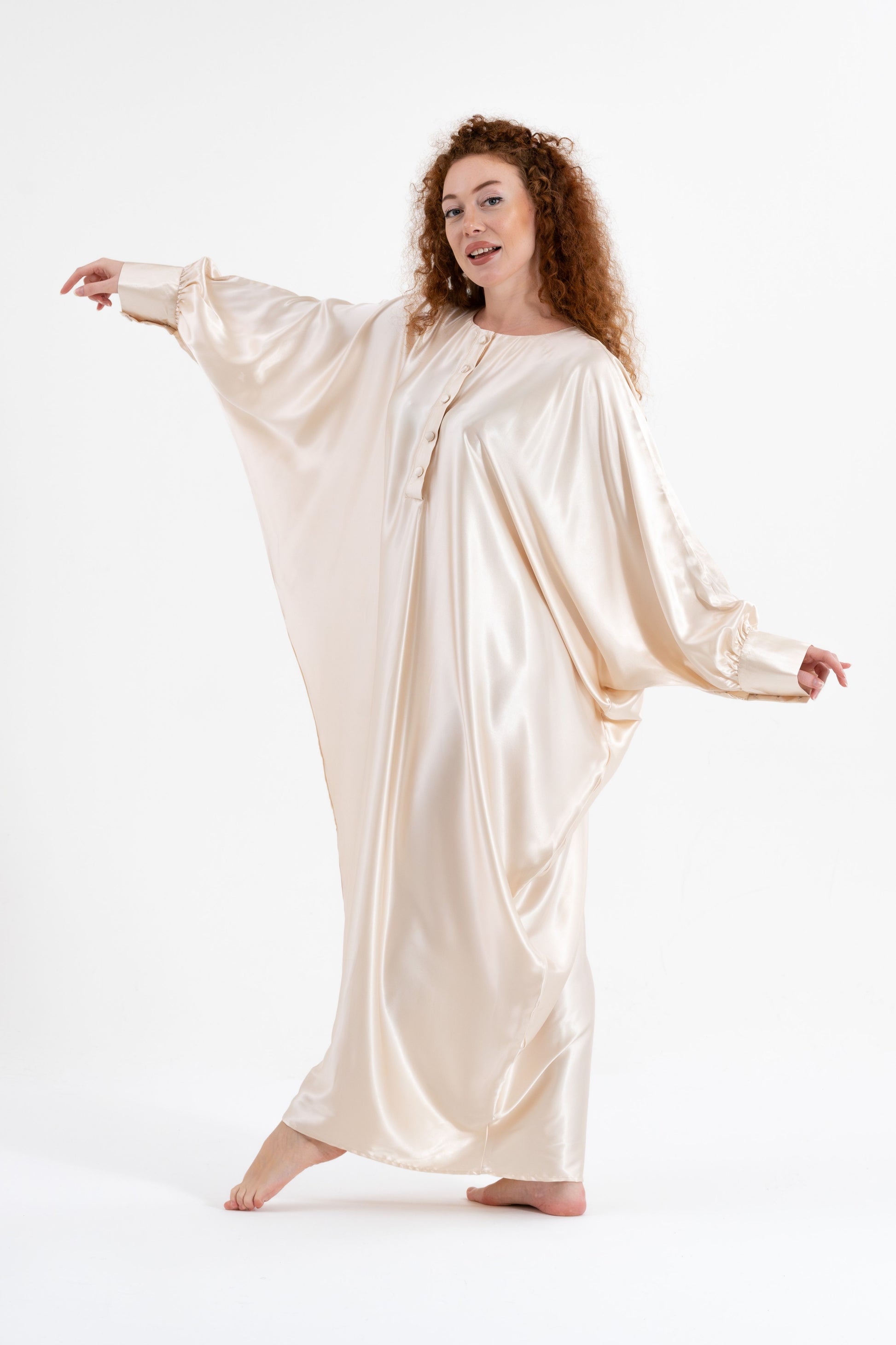 Step into full-coverage luxury with the Isabela Amie Paris Traditional Shades of White Kaftan. This flowing silk satin kaftan, in shades of ivory and cream, offers a modest yet glamorous silhouette. With beautifully tailored sleeves fastened with delicate buttons at the wrists, this kaftan exudes sophistication from every angle. Perfect for any occasion, from casual outings to formal events, it pairs effortlessly with earthy tones or deep blues. Add bold accessories for a striking traditional look that’s as versatile as it is elegant.