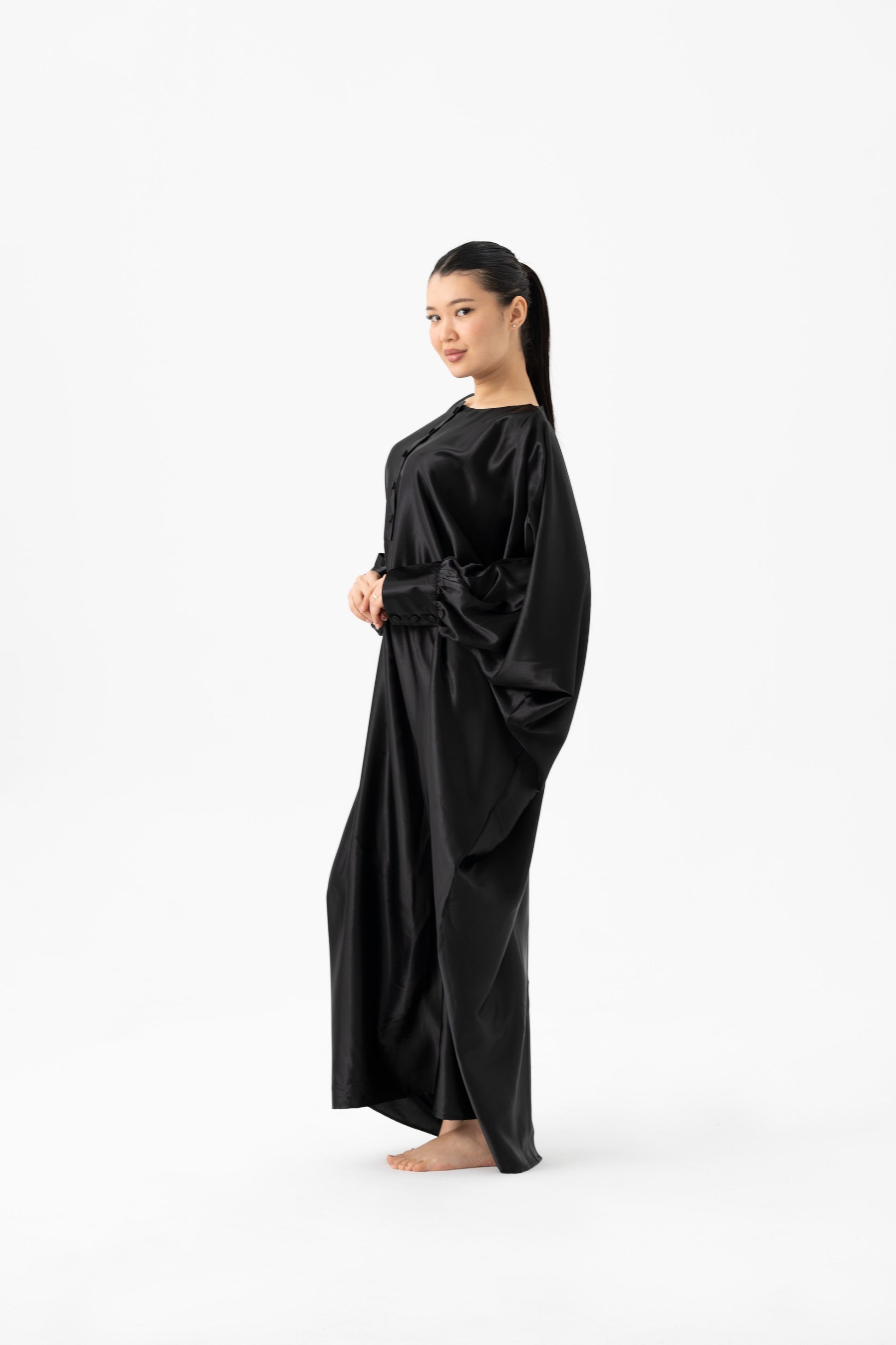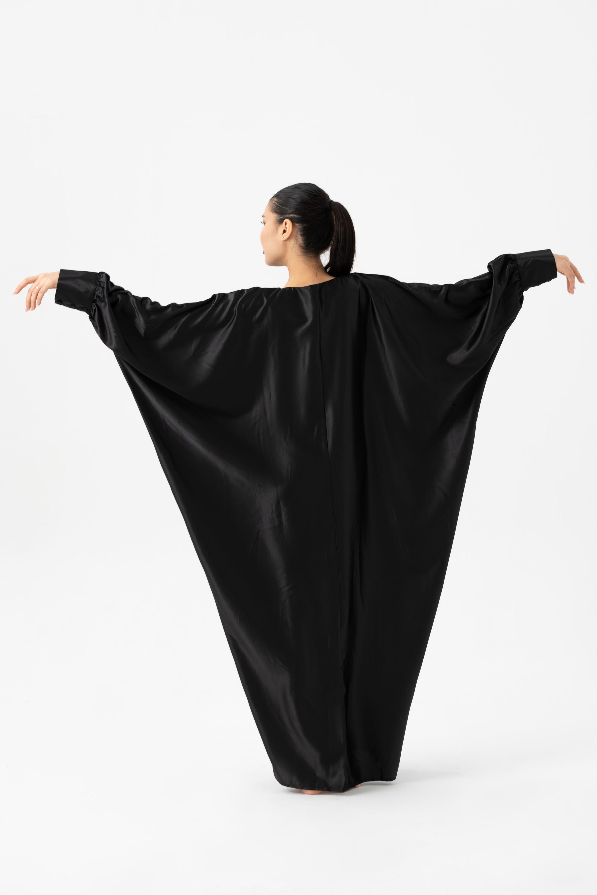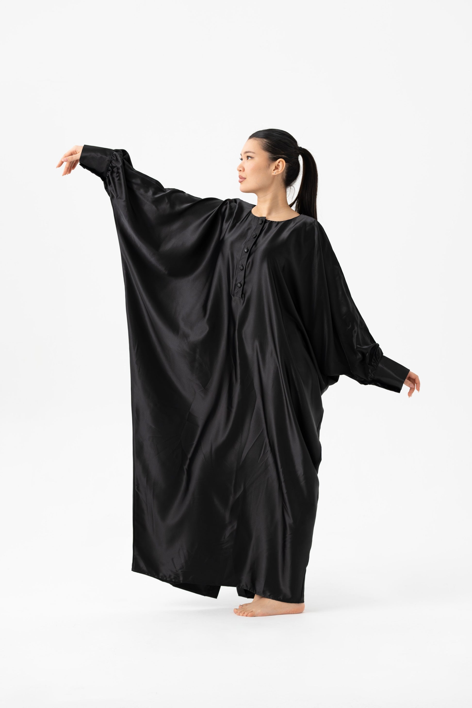 Step into full-coverage luxury with the Isabela Amie Paris Traditional Silky Black Kaftan. The ultimate must have romantically versatile black silk satin dress is a unique staple for your wardrove. You can wear it at any time for a mysterious, elegant and classy look as it accentuates and slims your figure. The satin weave will create a powerfully elegant drape around your silhouette that will flow with movement as well as remain wrinkle free, light weight and cool. You can style this luxurious kaftan with endless possibilities limited only by your imagination.