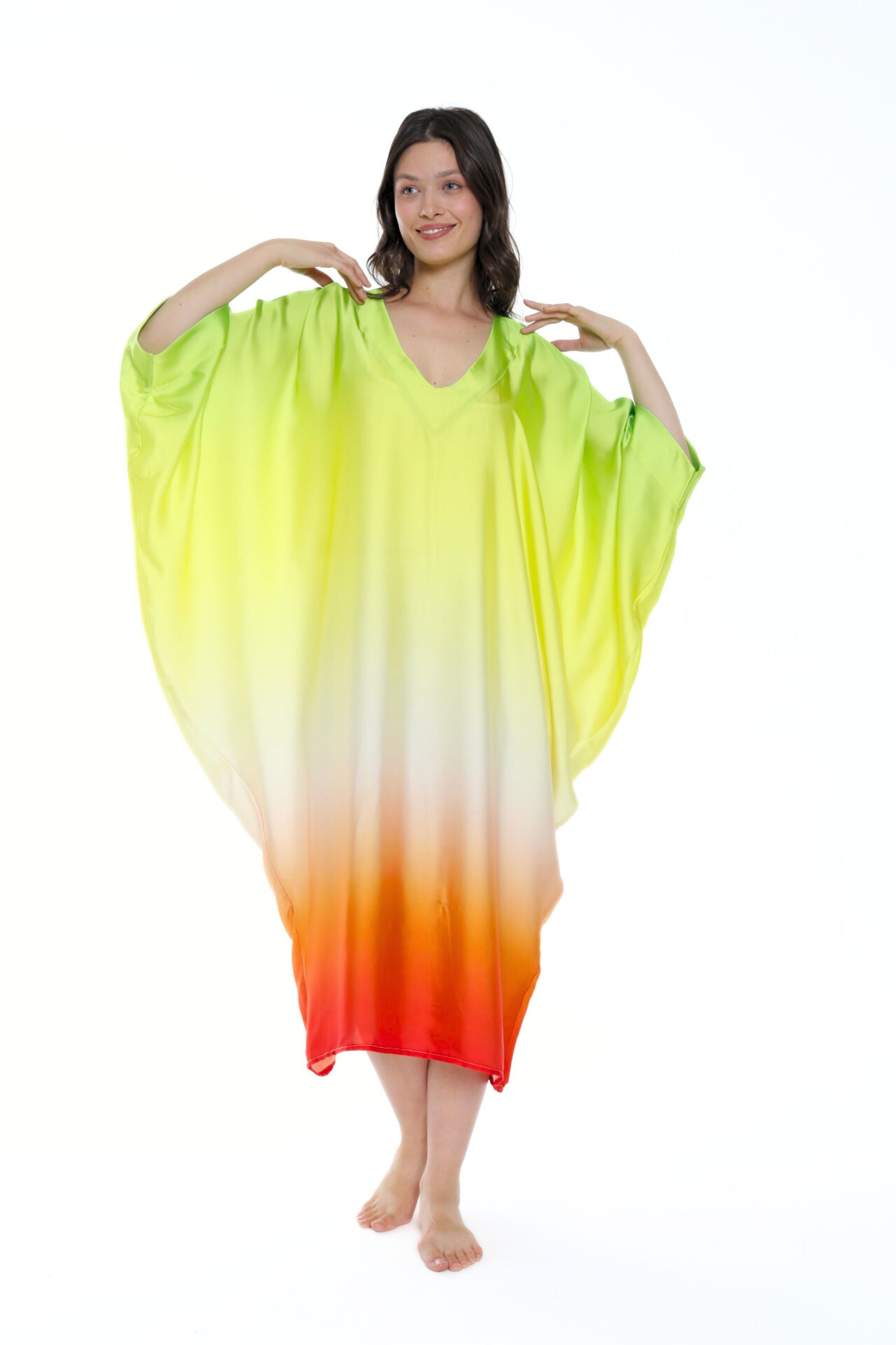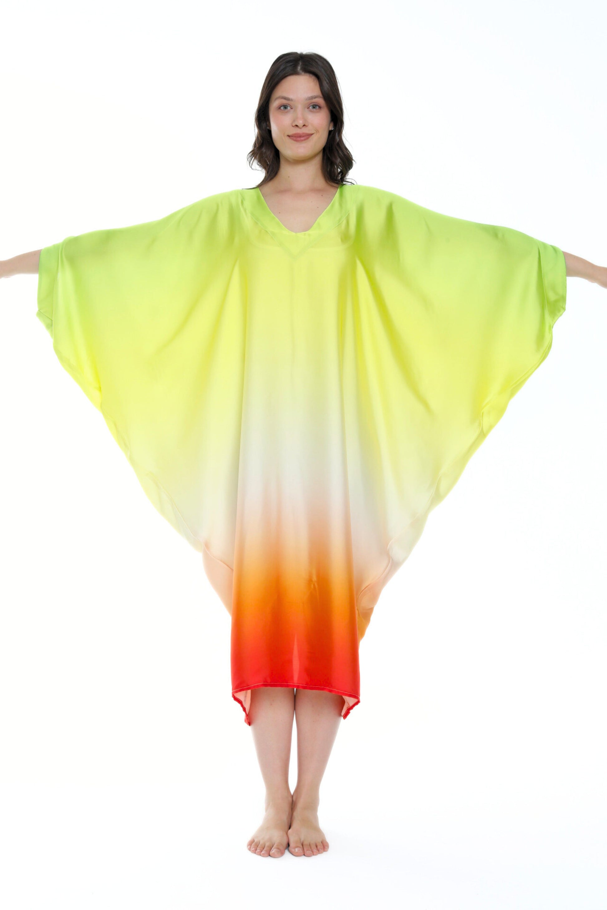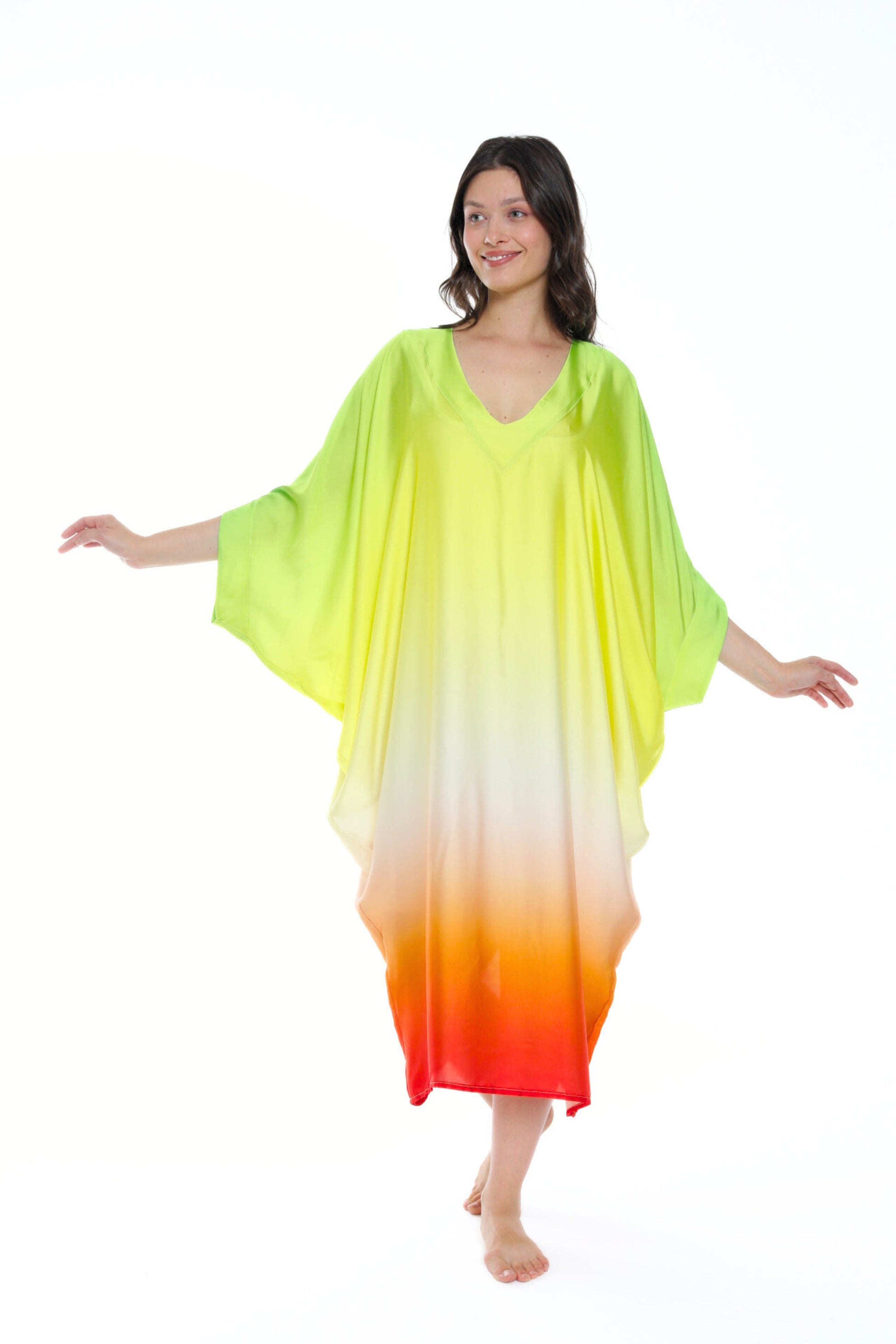 Unleash your inner radiance with the Isabela Amie Paris Modern Sunburst Aura Kaftan, a celebration of vibrant colors and effortless elegance. This kaftan features a stunning gradient of luminous shades, from bright citrus green to soft yellow, flowing into a vivid orange at the hem, reminiscent of a glowing sunset. The soft V-neckline adds a modern touch, while the airy, flowing fabric drapes beautifully over your silhouette, creating a striking and ethereal presence. Perfect for daytime events or tropical getaways, this kaftan embodies the spirit of summer with every step. Pair it with neutral or metallic accessories to enhance its bold, sun-kissed allure.