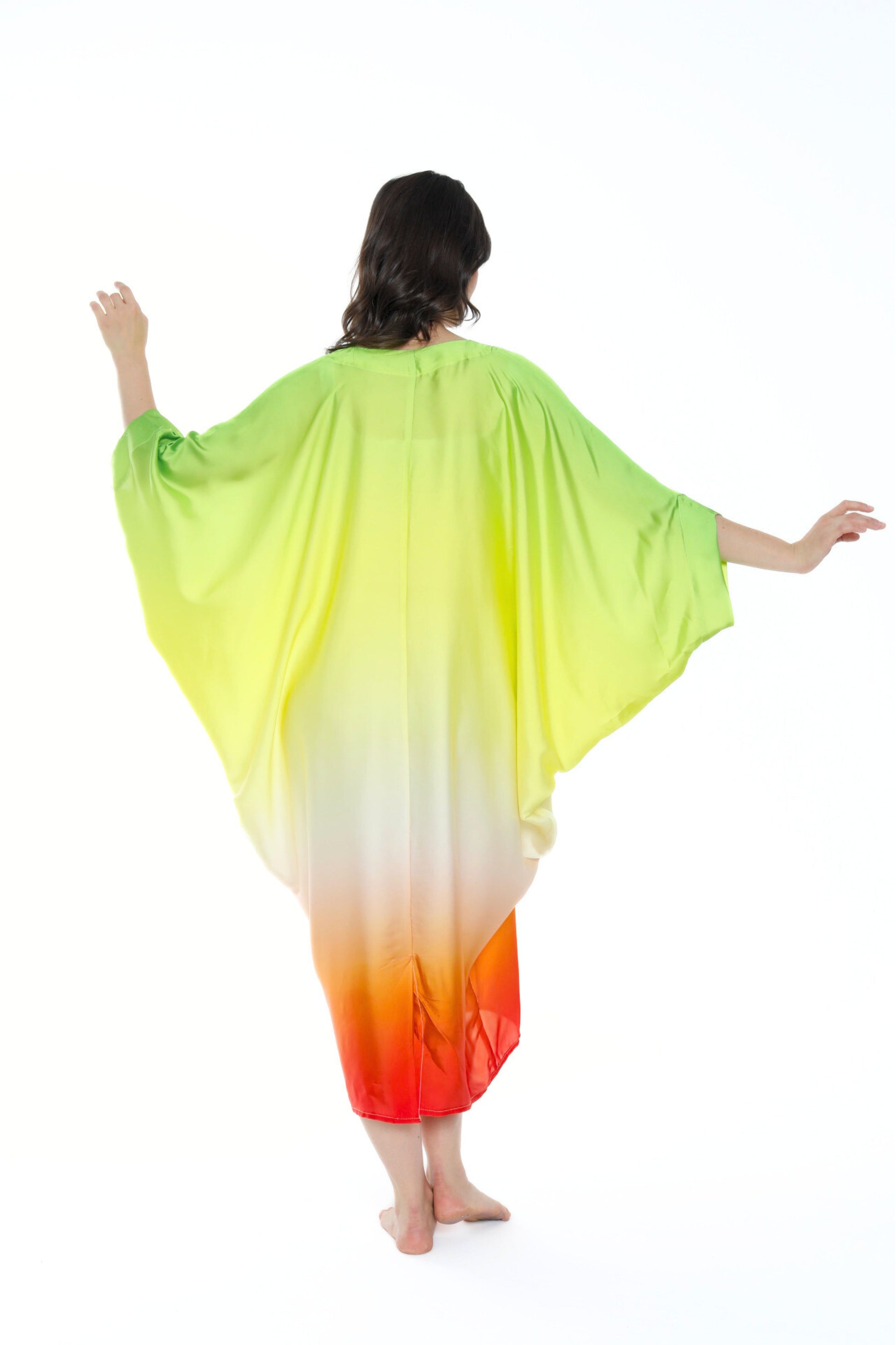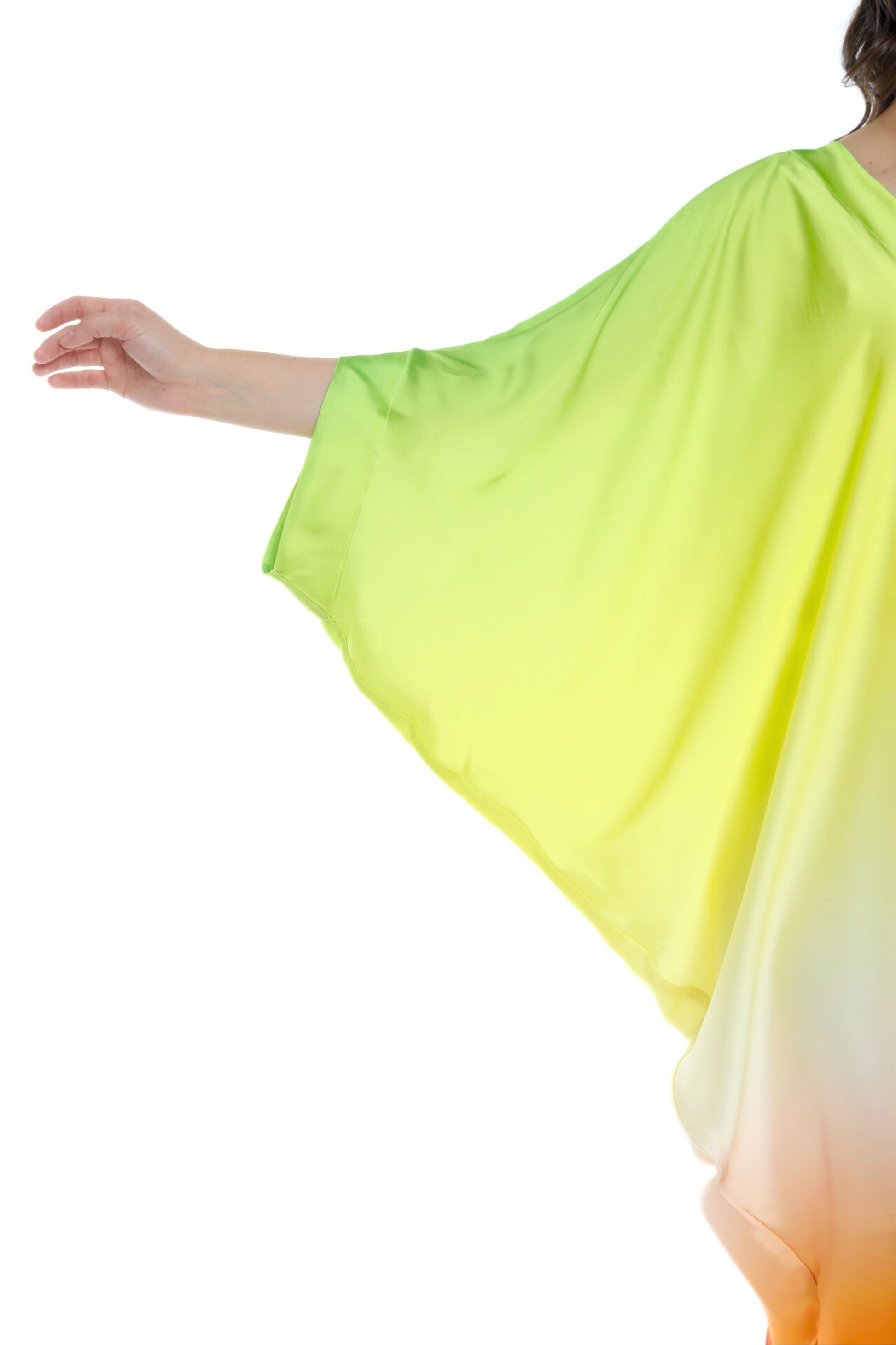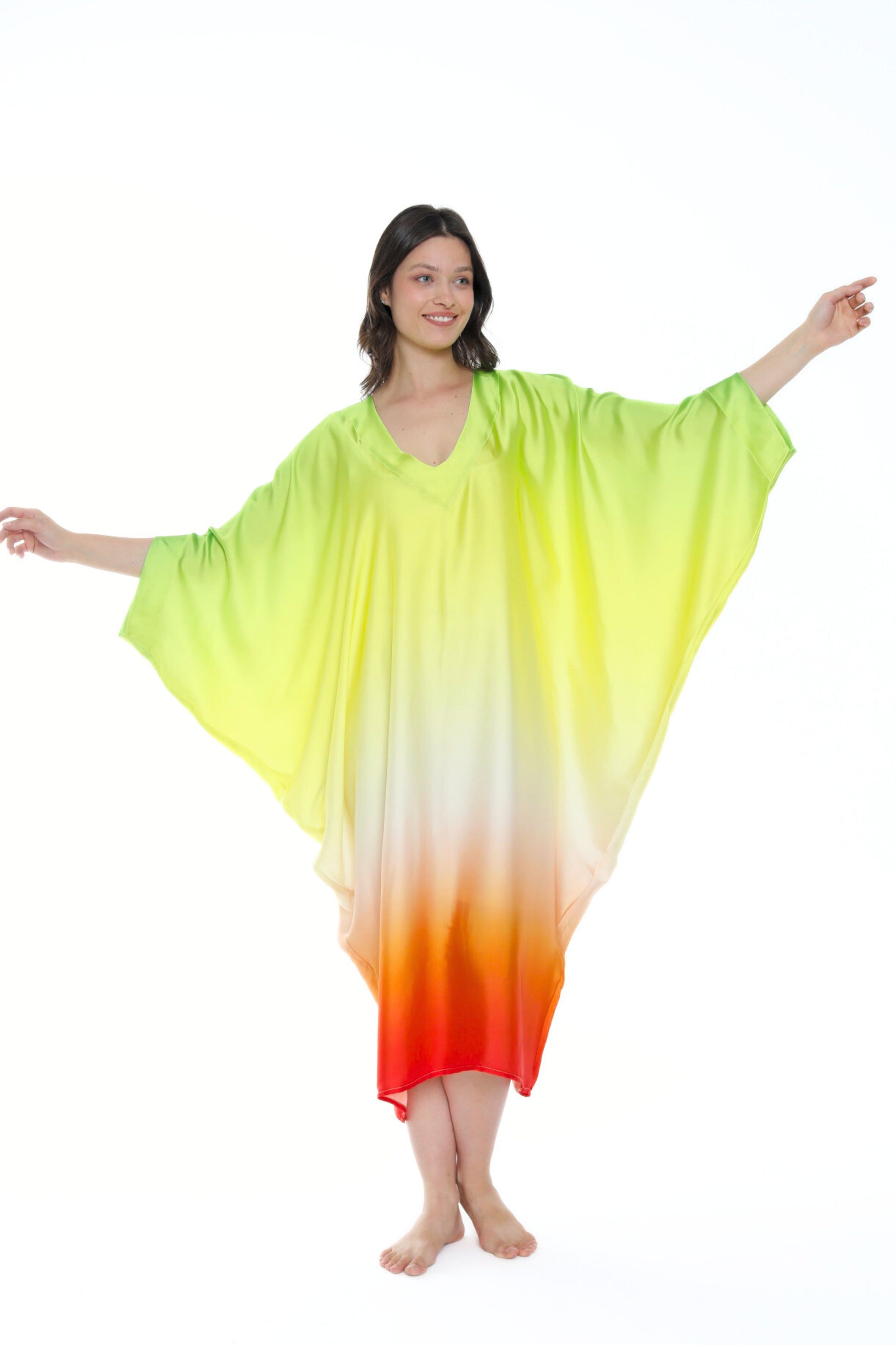 Unleash your inner radiance with the Isabela Amie Paris Modern Sunburst Aura Kaftan, a celebration of vibrant colors and effortless elegance. This kaftan features a stunning gradient of luminous shades, from bright citrus green to soft yellow, flowing into a vivid orange at the hem, reminiscent of a glowing sunset. The soft V-neckline adds a modern touch, while the airy, flowing fabric drapes beautifully over your silhouette, creating a striking and ethereal presence. Perfect for daytime events or tropical getaways, this kaftan embodies the spirit of summer with every step. Pair it with neutral or metallic accessories to enhance its bold, sun-kissed allure.