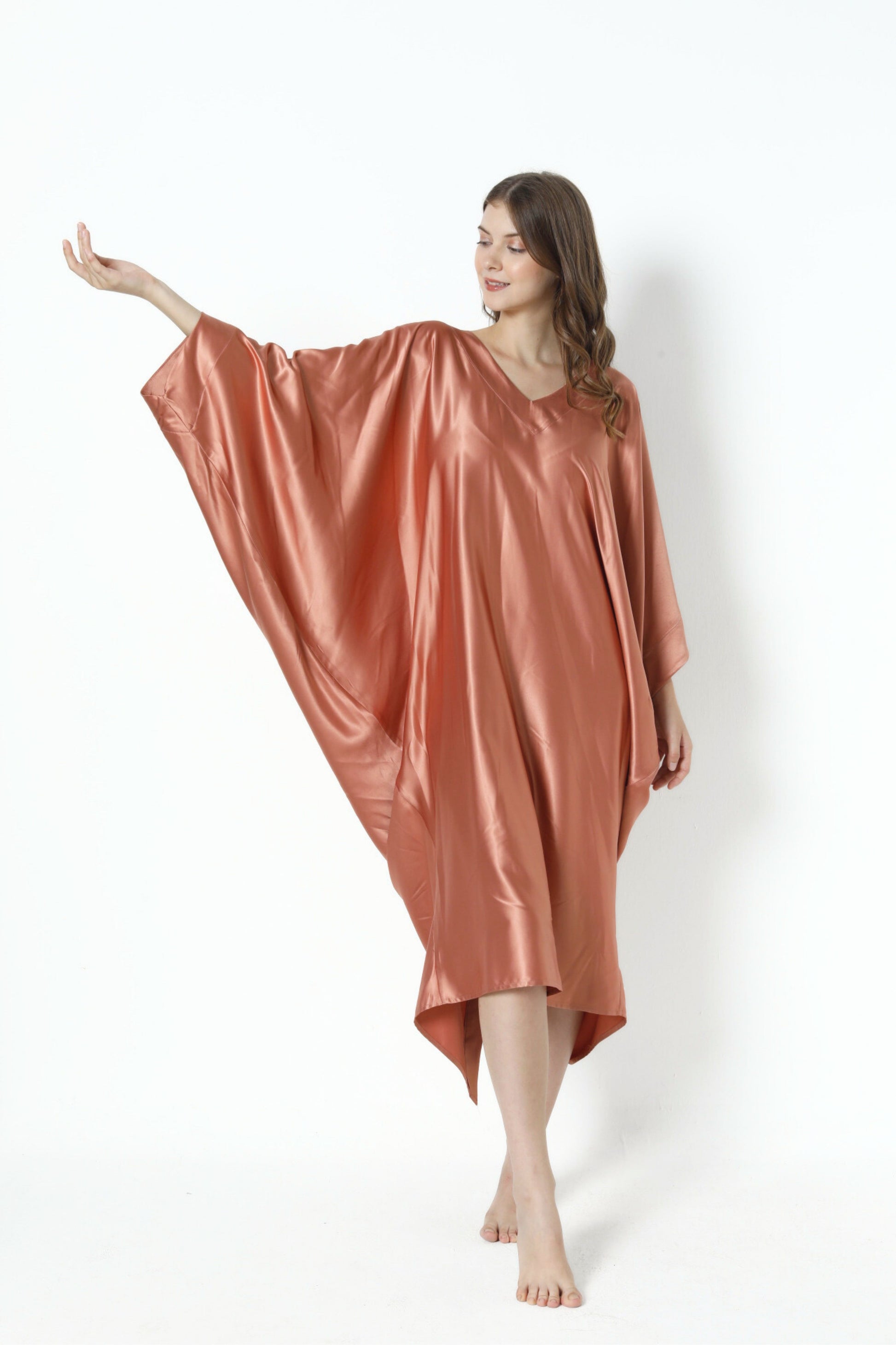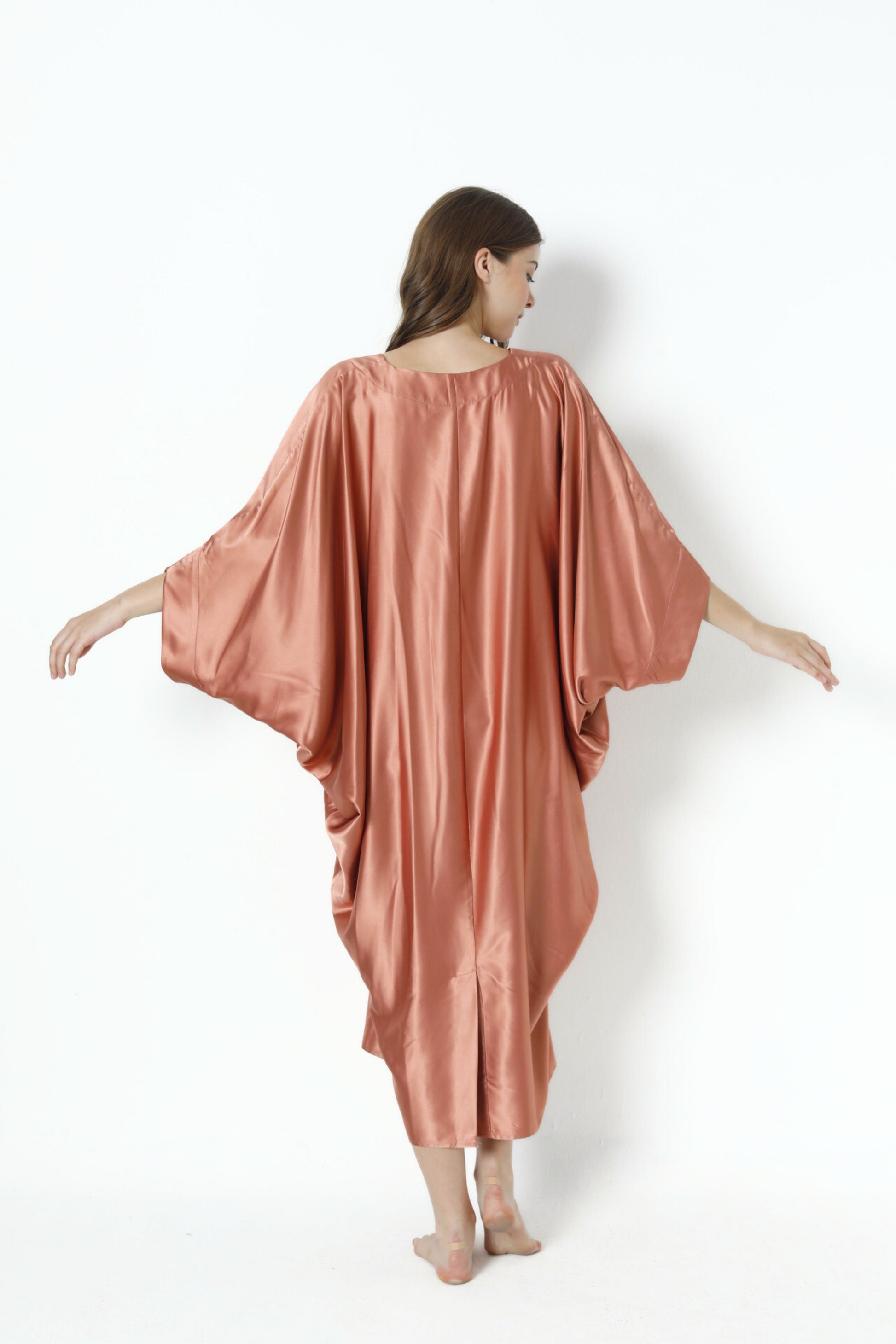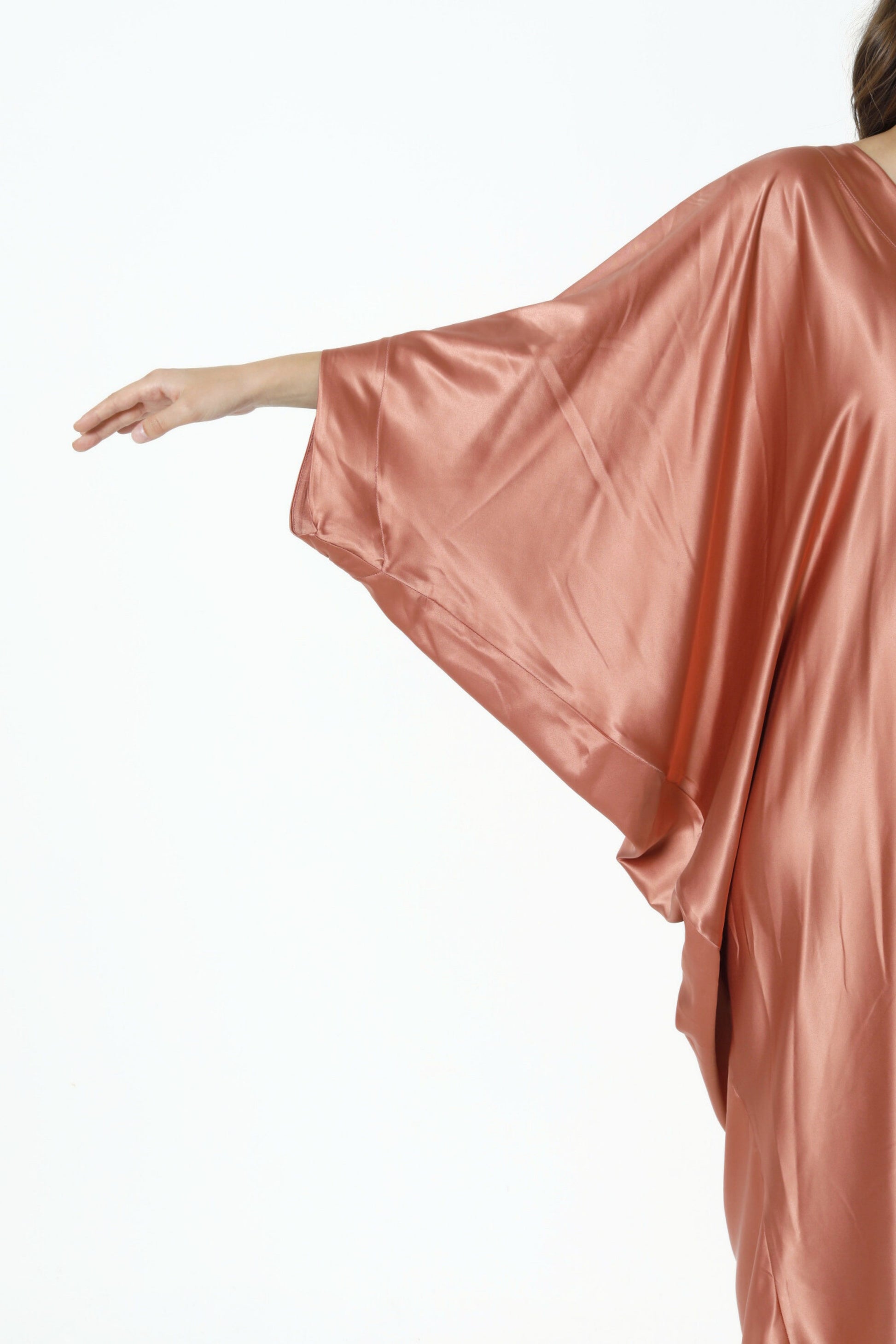 This rose gold silk satin kaftan is glamorous with a sexy draping silhouette, and very comfortable. Rose gold is reminiscent of the precious blush toned gold metal and represents refinement and romance. Rose gold is a fashion classic and year around trend that can be given a warm vintage vibe with the right accessories. You can wear this regal and feminine handmade kaftan to the beach or a cocktail party as it is cool, light weight, silky soft and generally wrinkle free. Rose gold can be styled with black, Navy, soft blue, denim, silver, diamonds, pearls, white, yellow gold, and mint green.