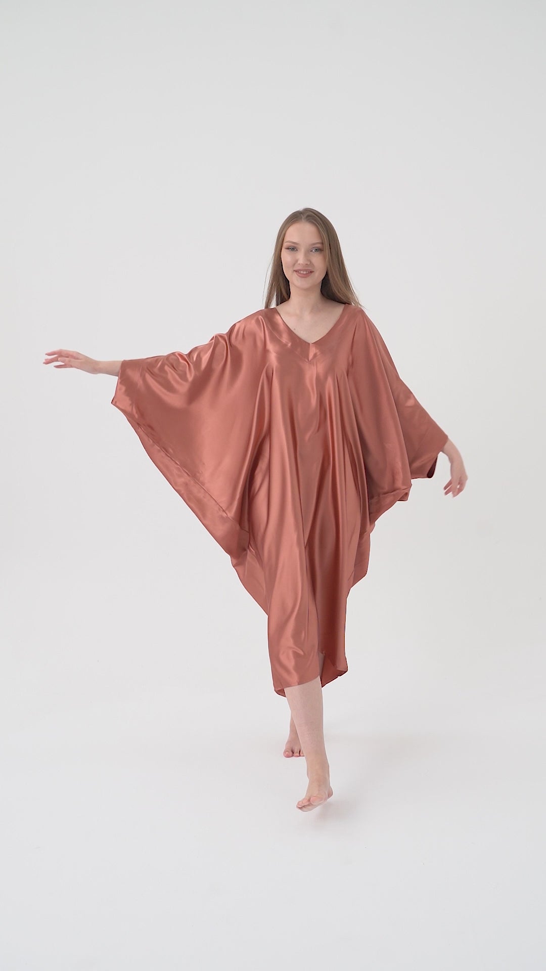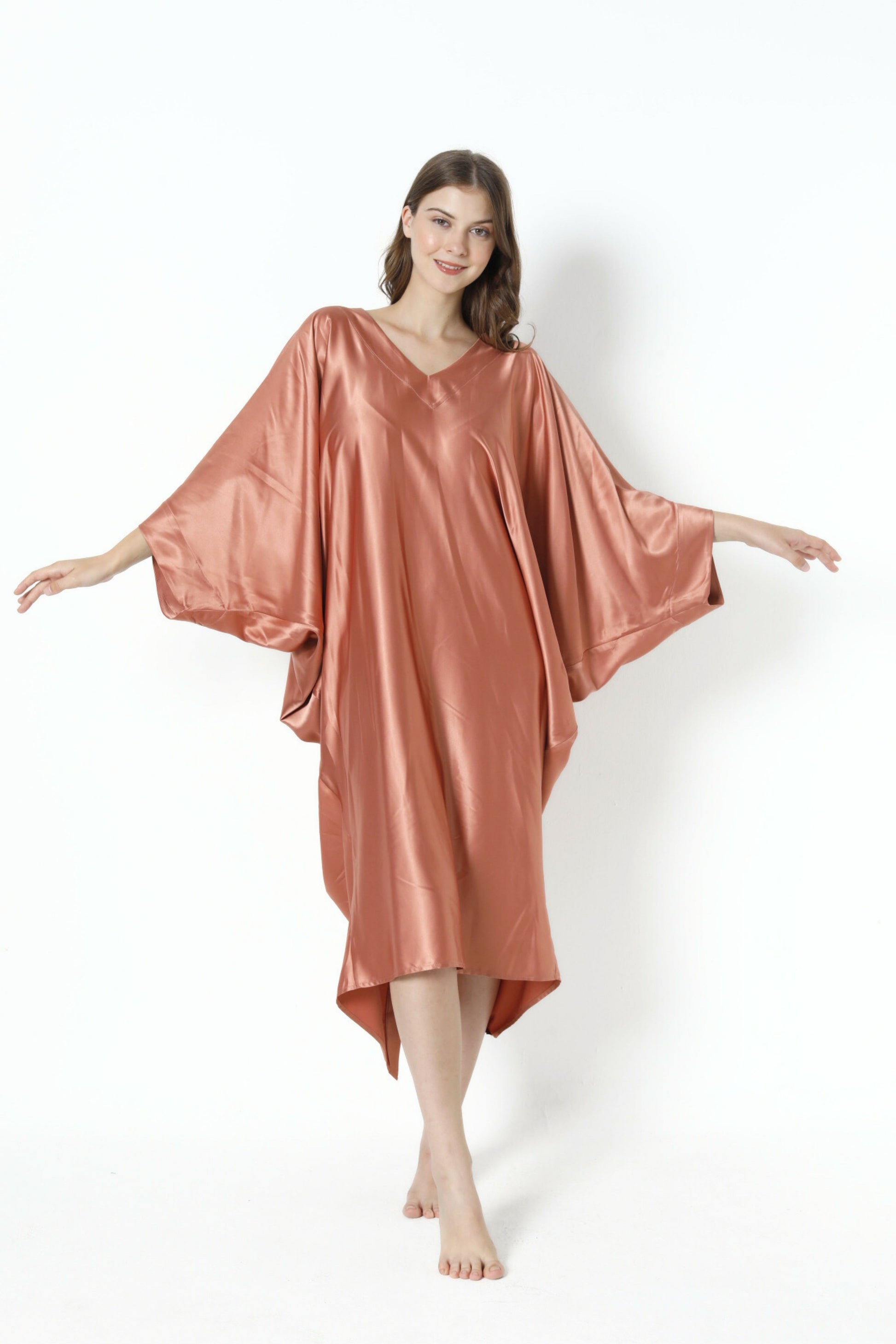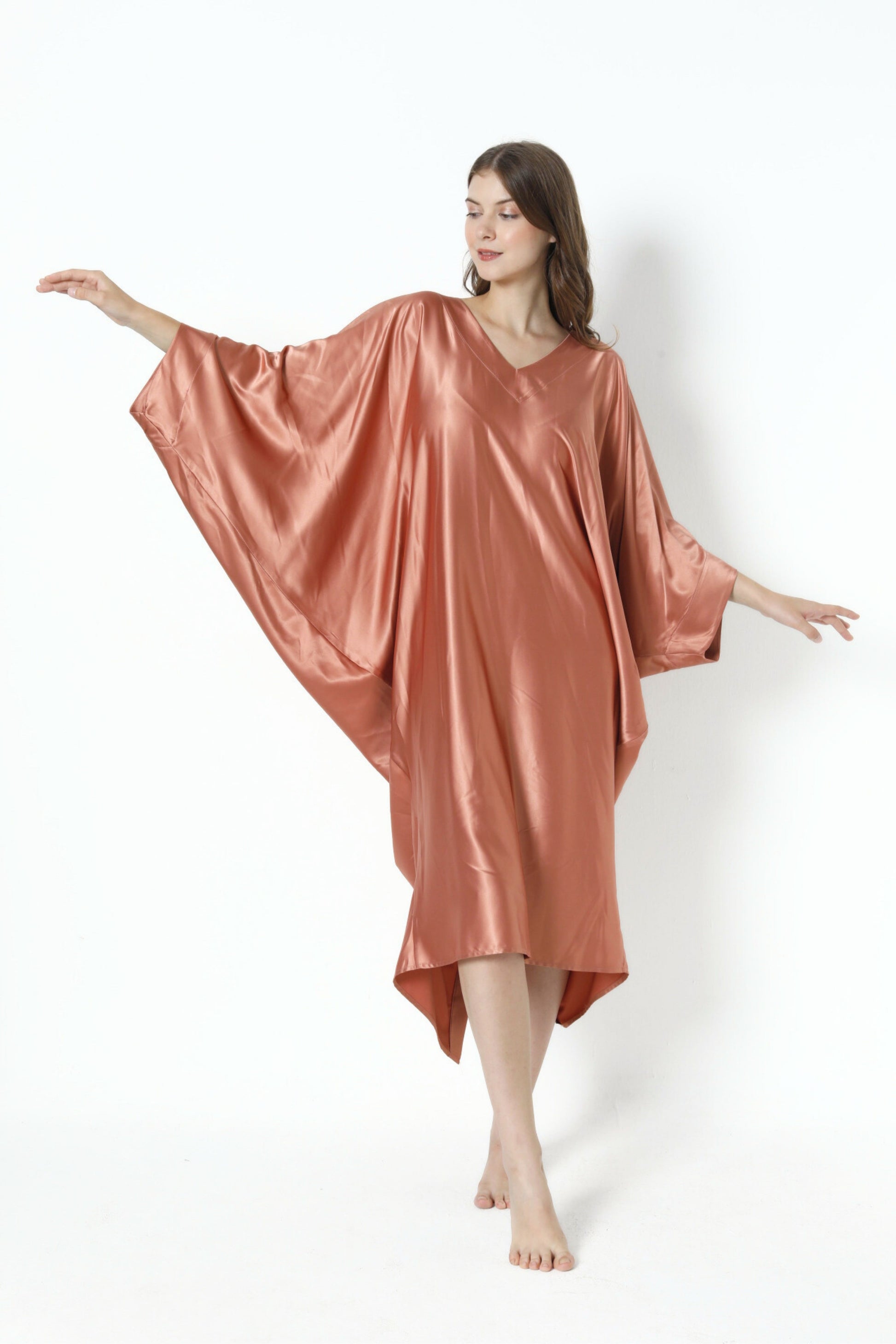 This rose gold silk satin kaftan is glamorous with a sexy draping silhouette, and very comfortable. Rose gold is reminiscent of the precious blush toned gold metal and represents refinement and romance. Rose gold is a fashion classic and year around trend that can be given a warm vintage vibe with the right accessories. You can wear this regal and feminine handmade kaftan to the beach or a cocktail party as it is cool, light weight, silky soft and generally wrinkle free. Rose gold can be styled with black, Navy, soft blue, denim, silver, diamonds, pearls, white, yellow gold, and mint green.